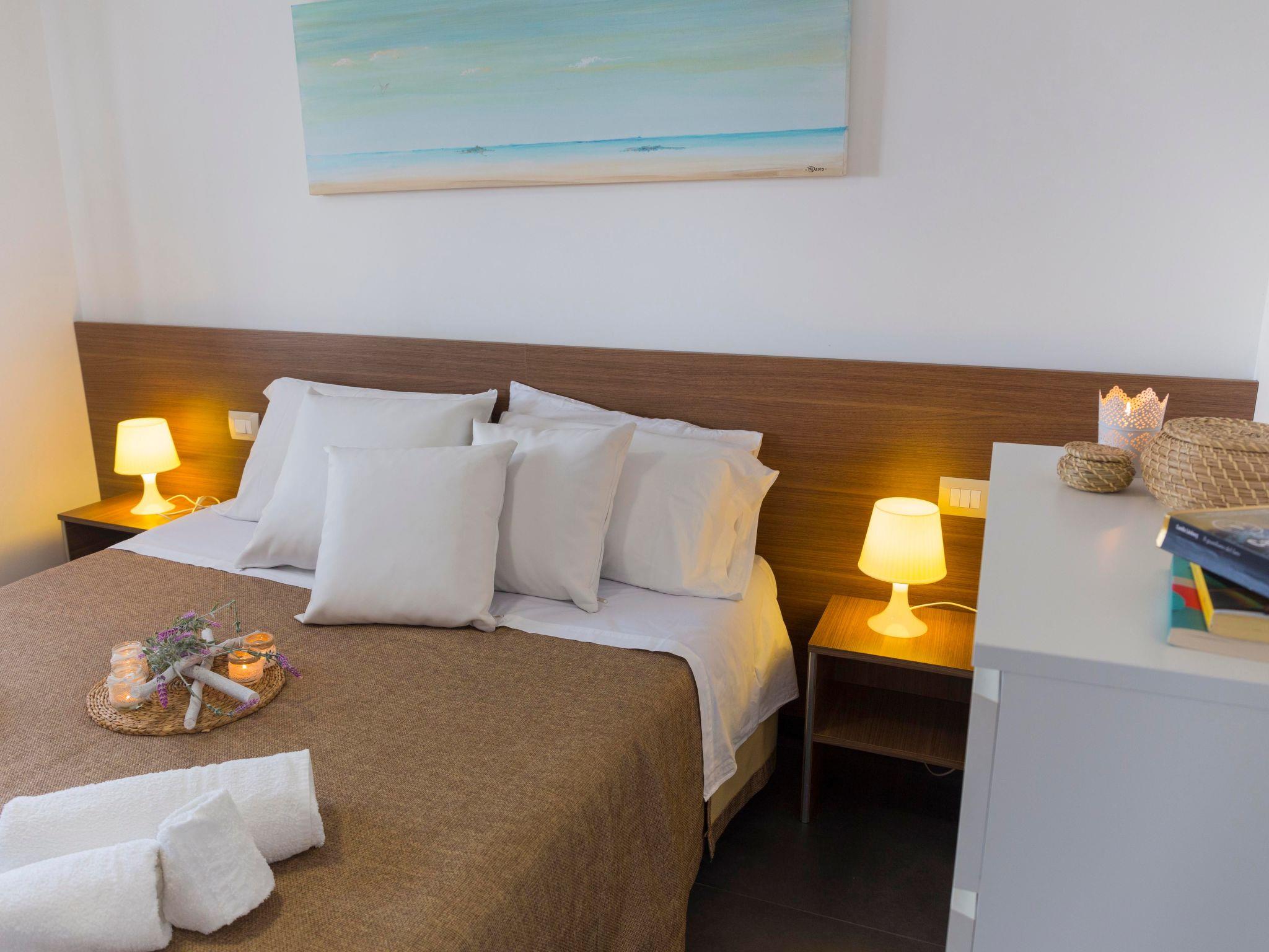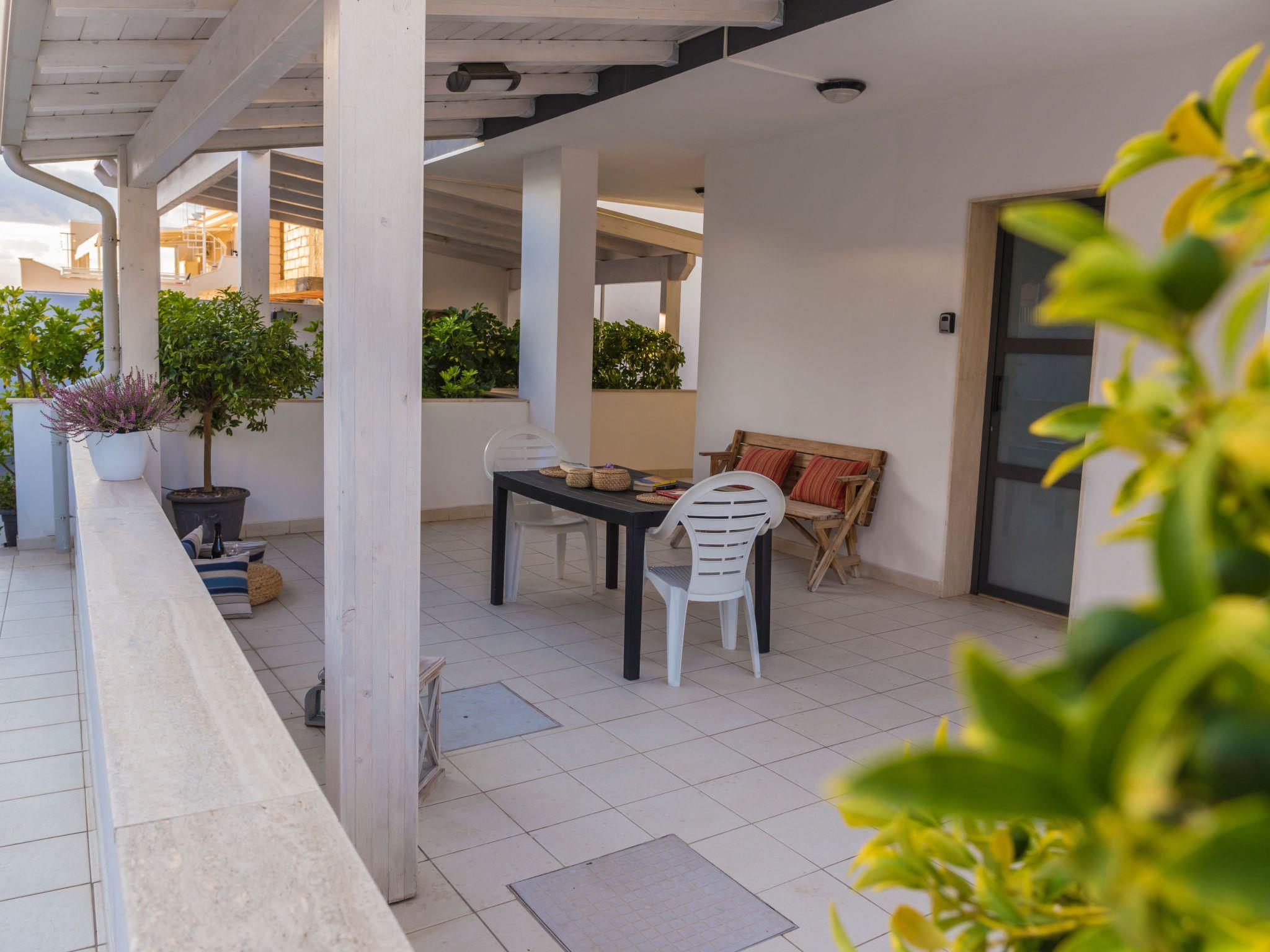 Sea-view penthouse on the second floor, consisting of a double bedroom, living room/kitchen with double sofa bed, bathroom and terrace with table and chairs.