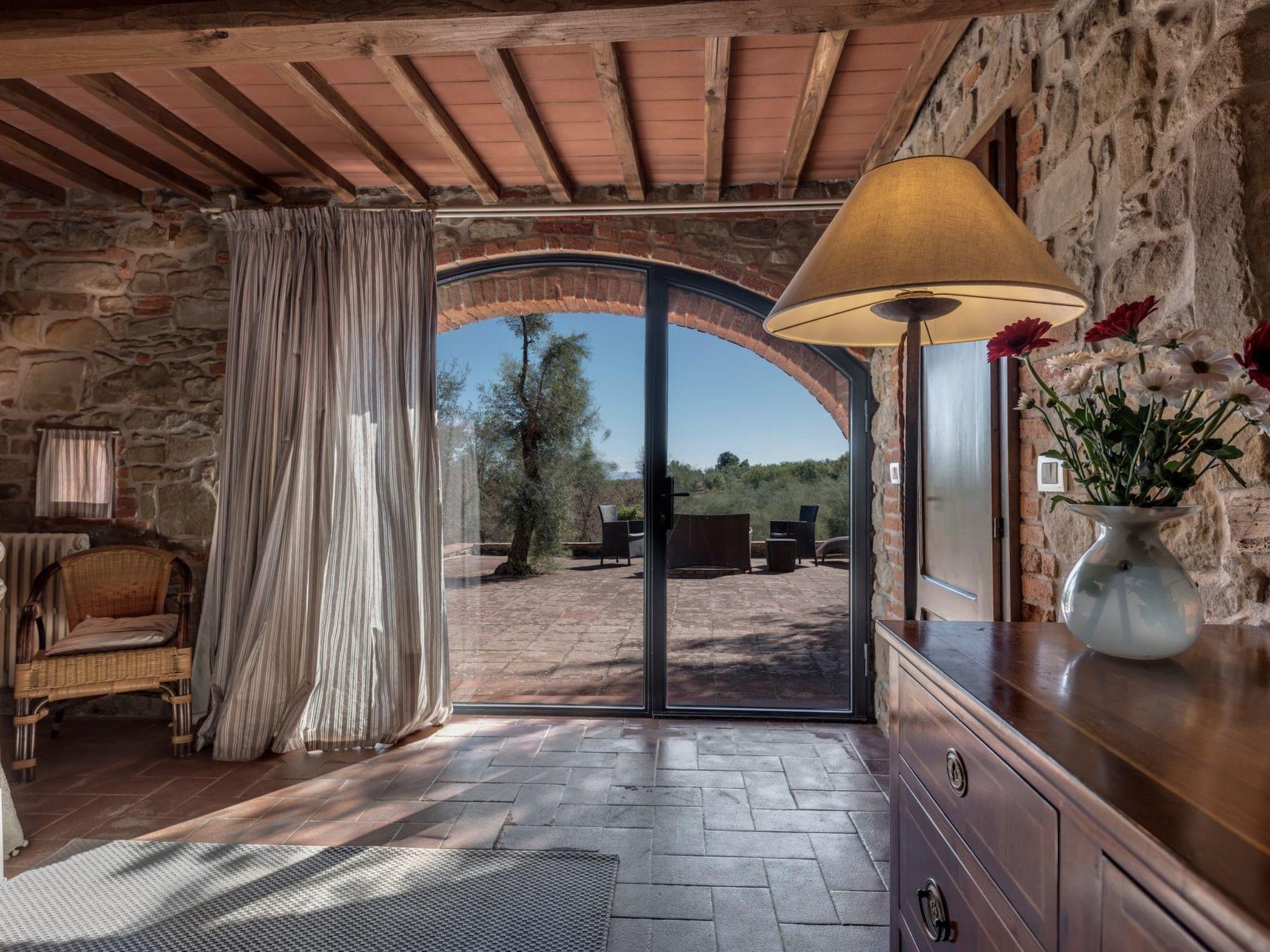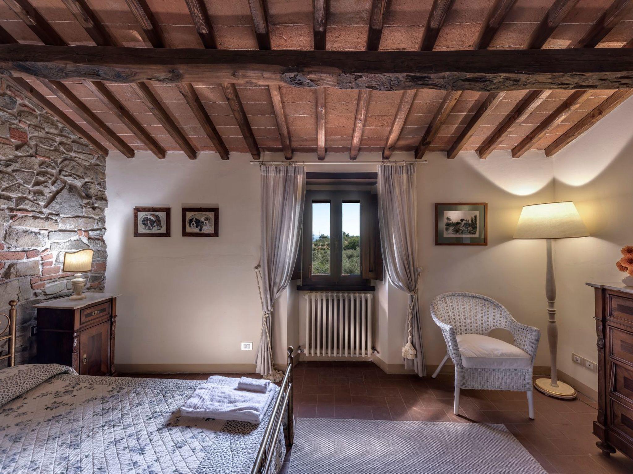This authentic house stands in a unique panoramic position at the gateway to the Chianti region. A short private road leads to the house through olive groves, vineyards and woods, the typical Chianti landscape. The two-storey building is set into the natural slope of the land, so both floors have an entrance without stairs and a lovely terrace.