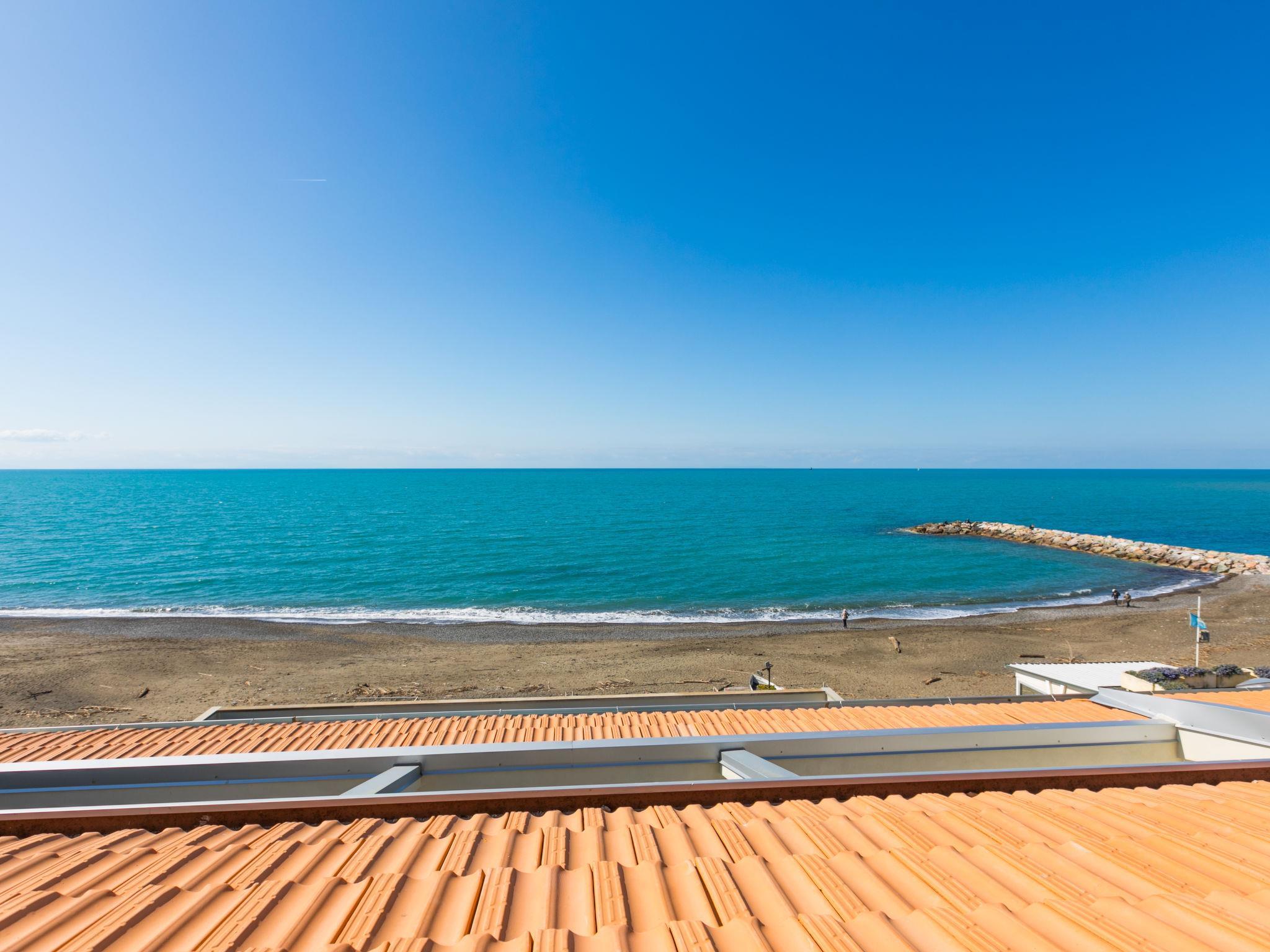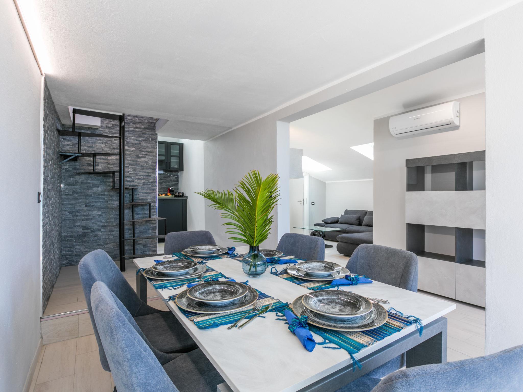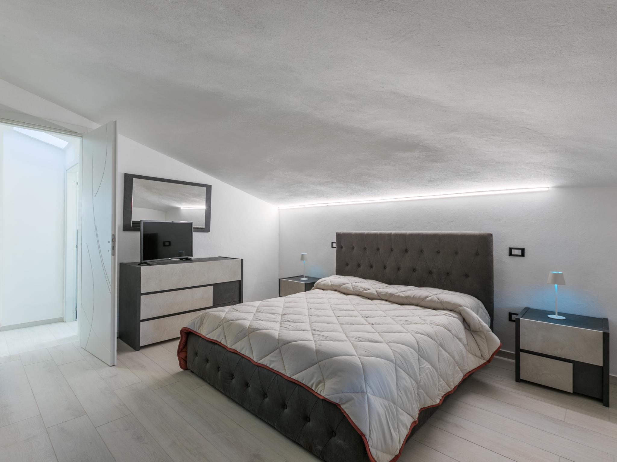 5-room penthouse 134 m2 on 2 levels, on the top floor. Spacious and bright, fully renovated in 2024, modern furnishings: upper floor: (steep stair) living/sleeping room with 1 double sofabed and TV (flat screen). Exit to the terrace. 1 double bedroom. 2 rooms, each room with 1 bed and 1 pull-out bed. Open kitchen (oven, 4 induction hot plates, toaster, kettle, electric coffee machine) with dining table. 2 showers/bidet/WC. Electric heating, air-conditioning. 2nd upper floor: (spiral staircase) small living room with bar. Terrace 25 m2. Terrace furniture, deck chairs. Marvellous panoramic view of the sea and the countryside. Facilities: washing machine, children's high chair, baby cot for up to 2 year olds, hair dryer. Internet (WiFi, free). Please note: fridge without freezer. Fire extinguisher, no lift. IT049007C2TBSZ6W8T