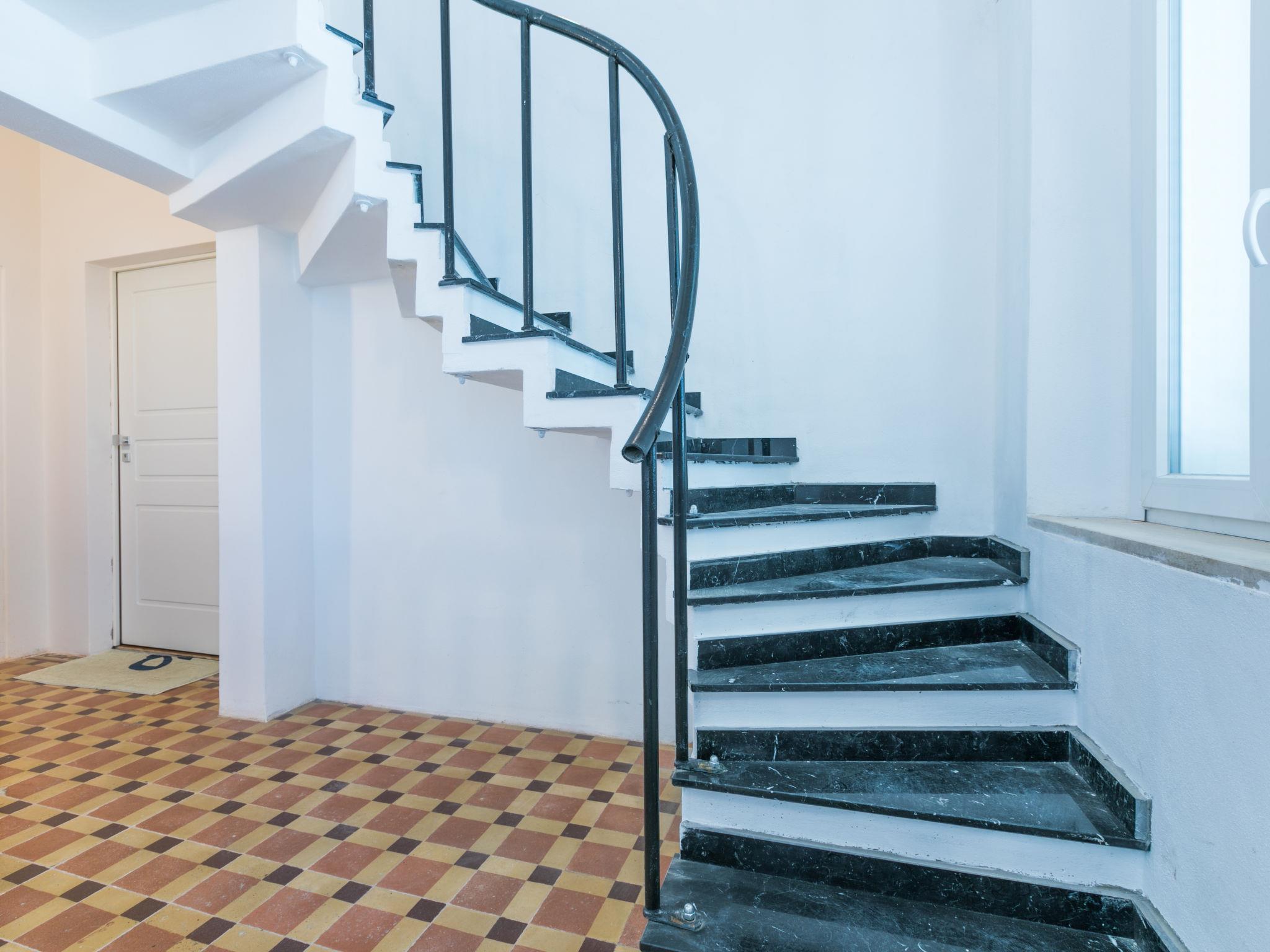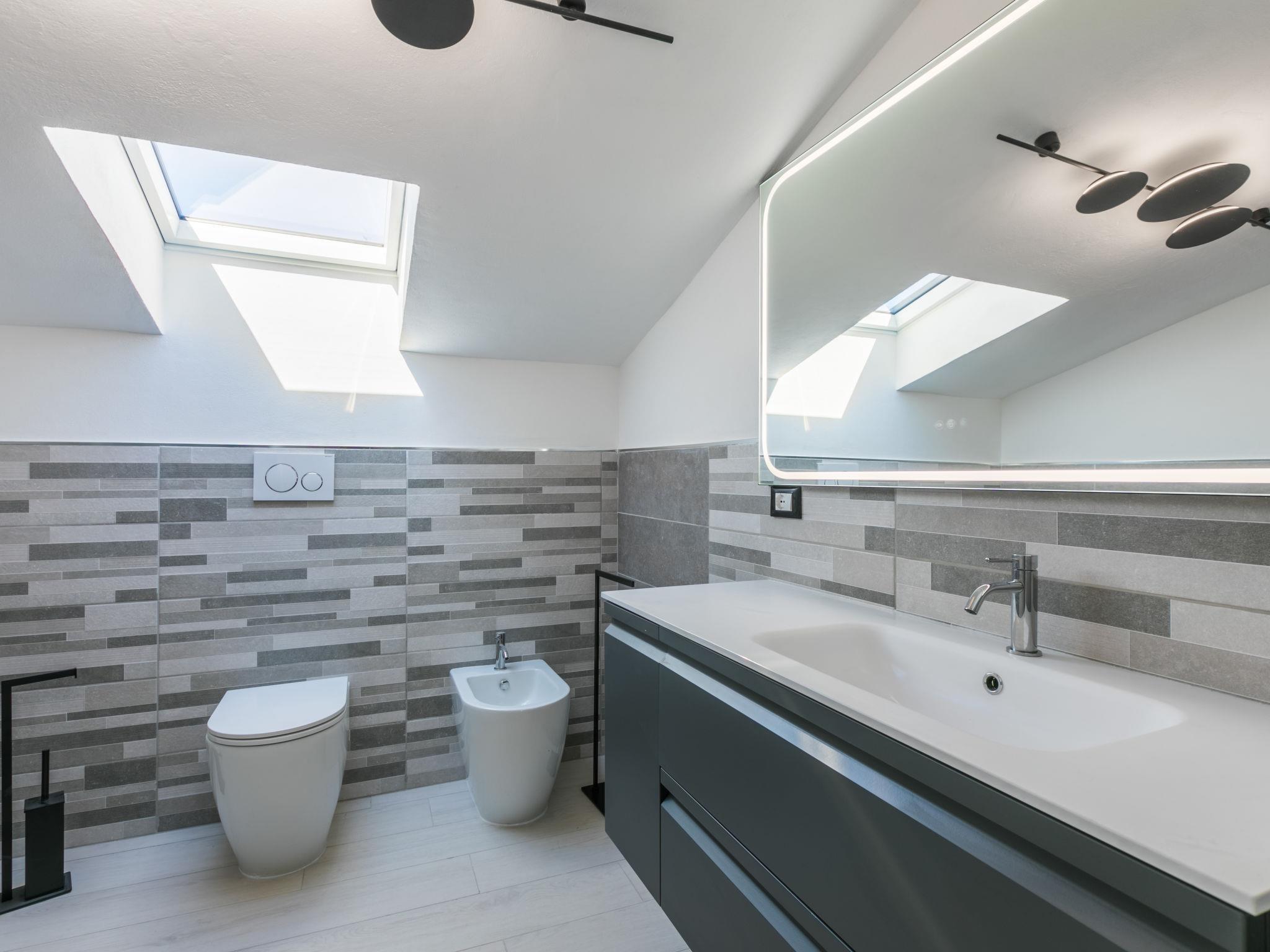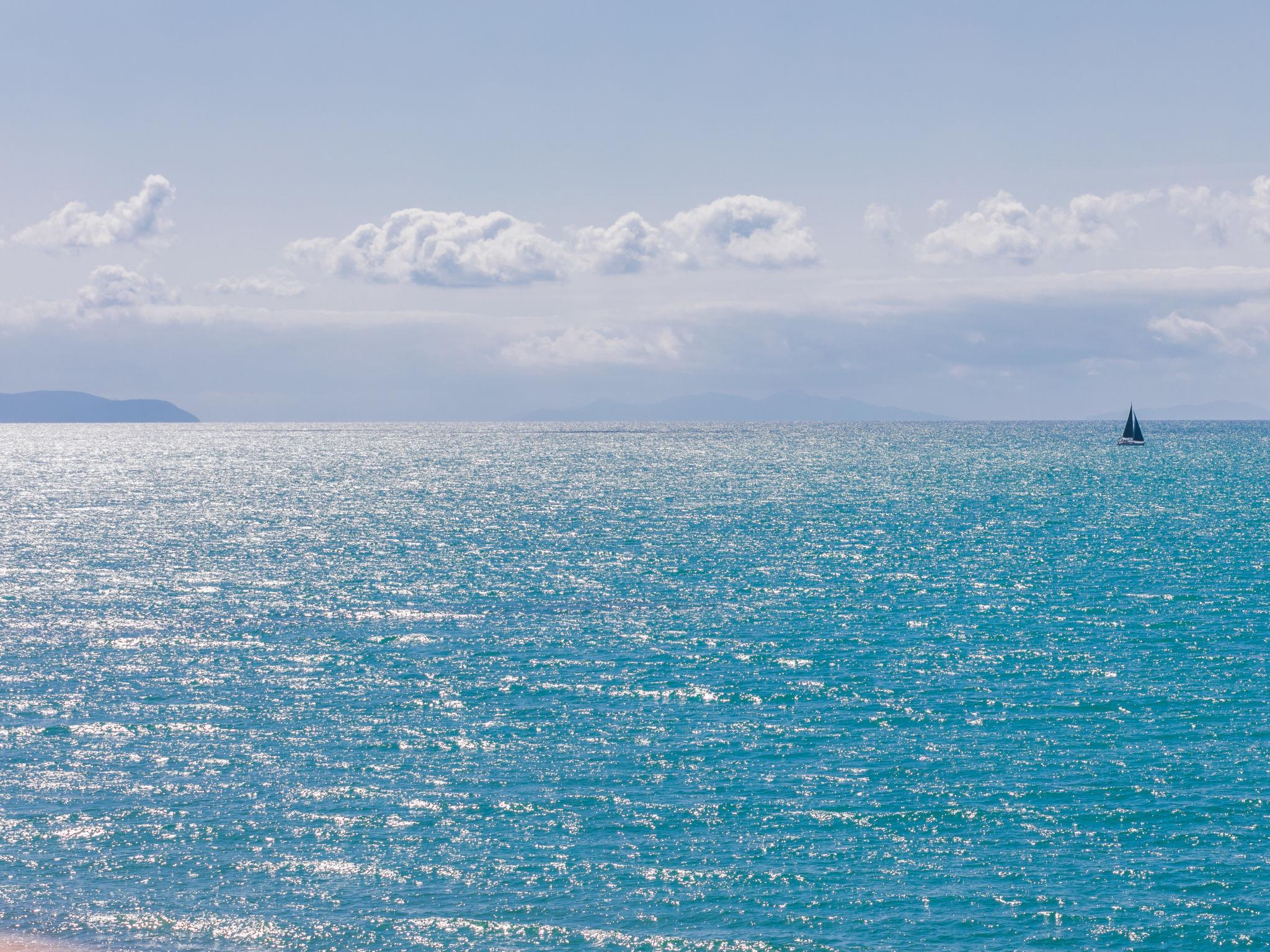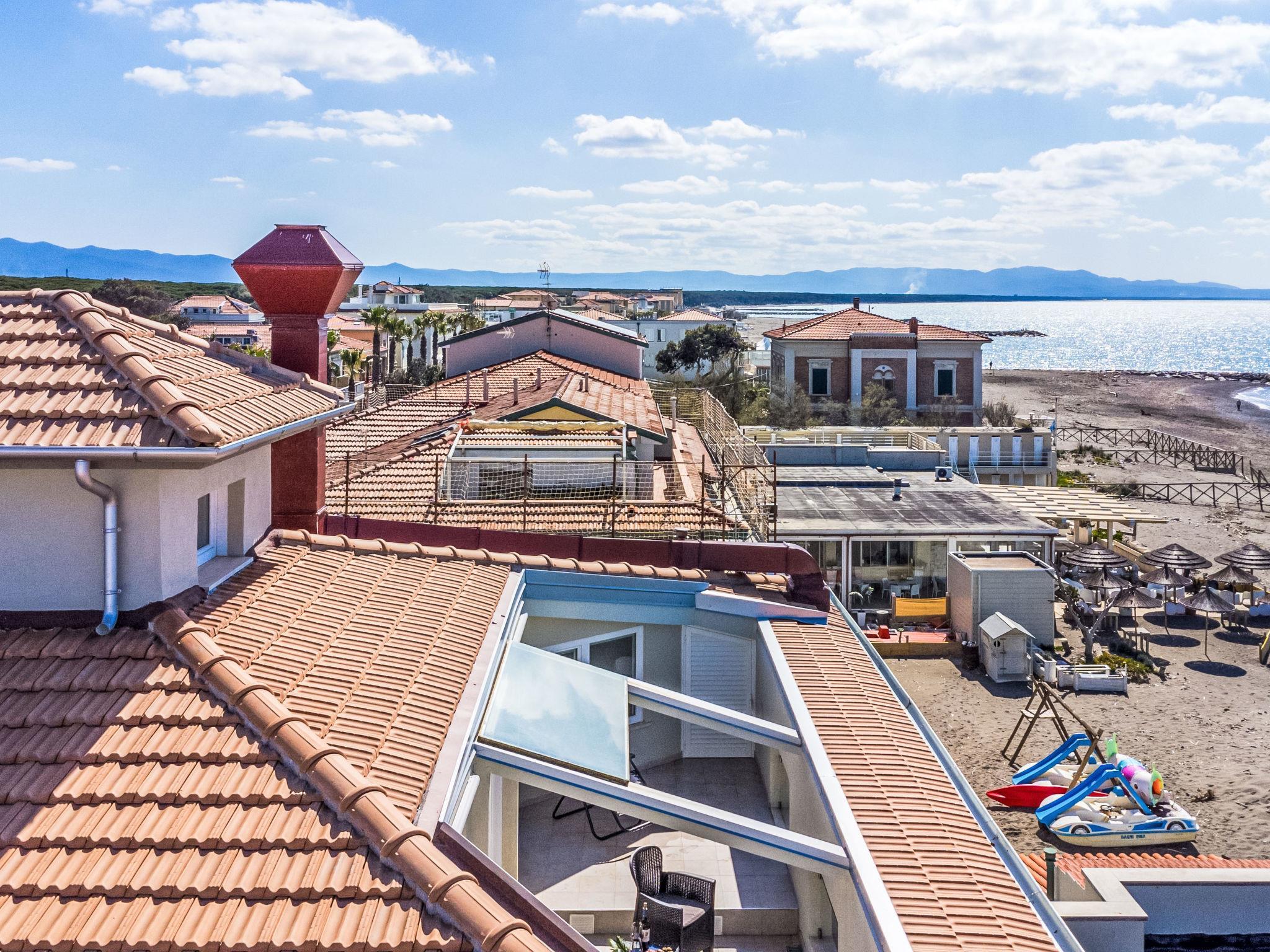 5-room penthouse 134 m2 on 2 levels, on the top floor. Spacious and bright, fully renovated in 2024, modern furnishings: upper floor: (steep stair) living/sleeping room with 1 double sofabed and TV (flat screen). Exit to the terrace. 1 double bedroom. 2 rooms, each room with 1 bed and 1 pull-out bed. Open kitchen (oven, 4 induction hot plates, toaster, kettle, electric coffee machine) with dining table. 2 showers/bidet/WC. Electric heating, air-conditioning. 2nd upper floor: (spiral staircase) small living room with bar. Terrace 25 m2. Terrace furniture, deck chairs. Marvellous panoramic view of the sea and the countryside. Facilities: washing machine, children's high chair, baby cot for up to 2 year olds, hair dryer. Internet (WiFi, free). Please note: fridge without freezer. Fire extinguisher, no lift. IT049007C2TBSZ6W8T