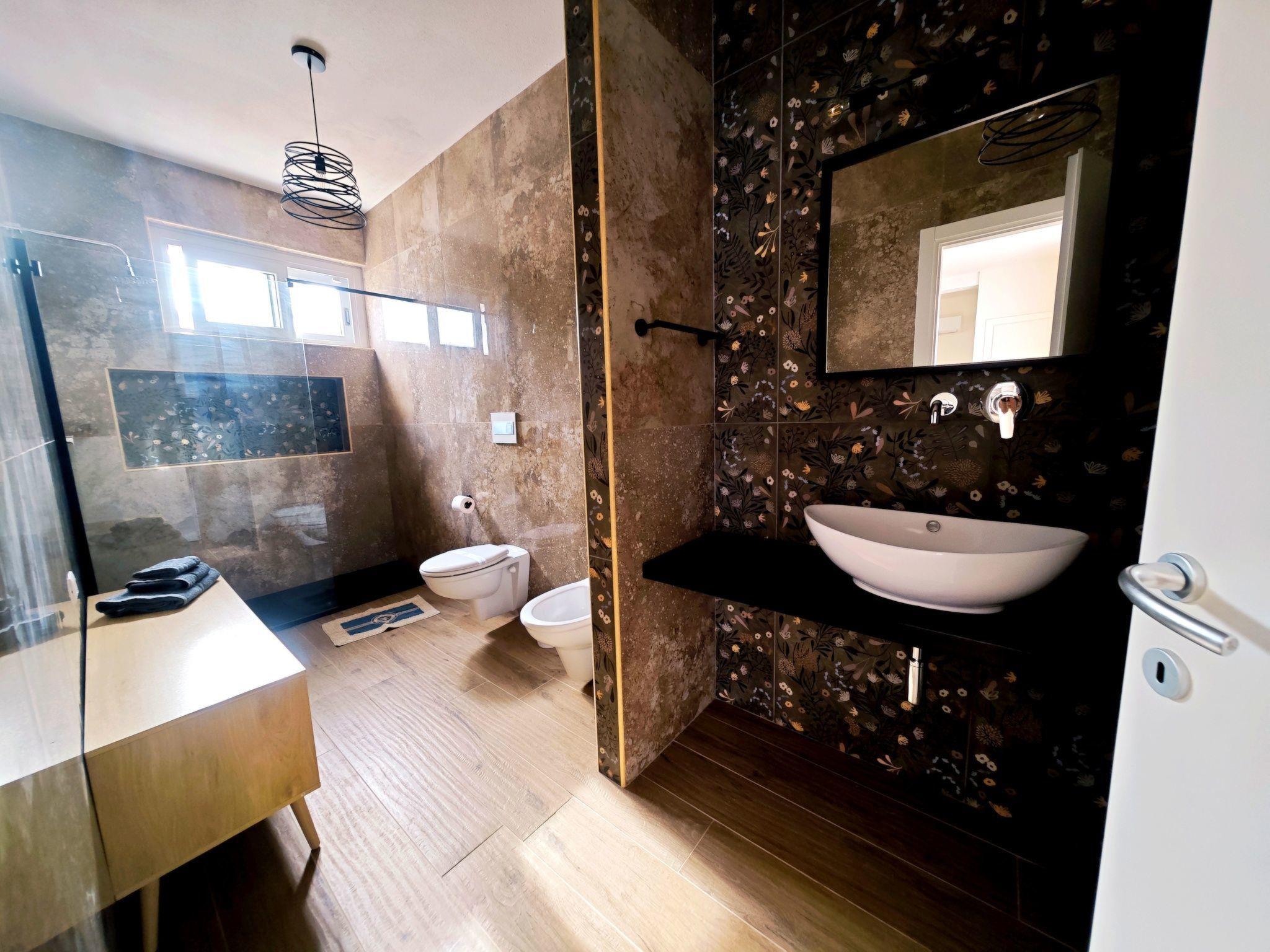 Inside, the villa is designed to offer maximum comfort and functionality. Each bedroom has a private bathroom, ensuring privacy and convenience for all guests. The large living area becomes the perfect place to relax and socialise, and concluding the comfort of the interior is the third additional bathroom and a practical utility room with a laundry room equipped with a washing machine and other living essentials.
