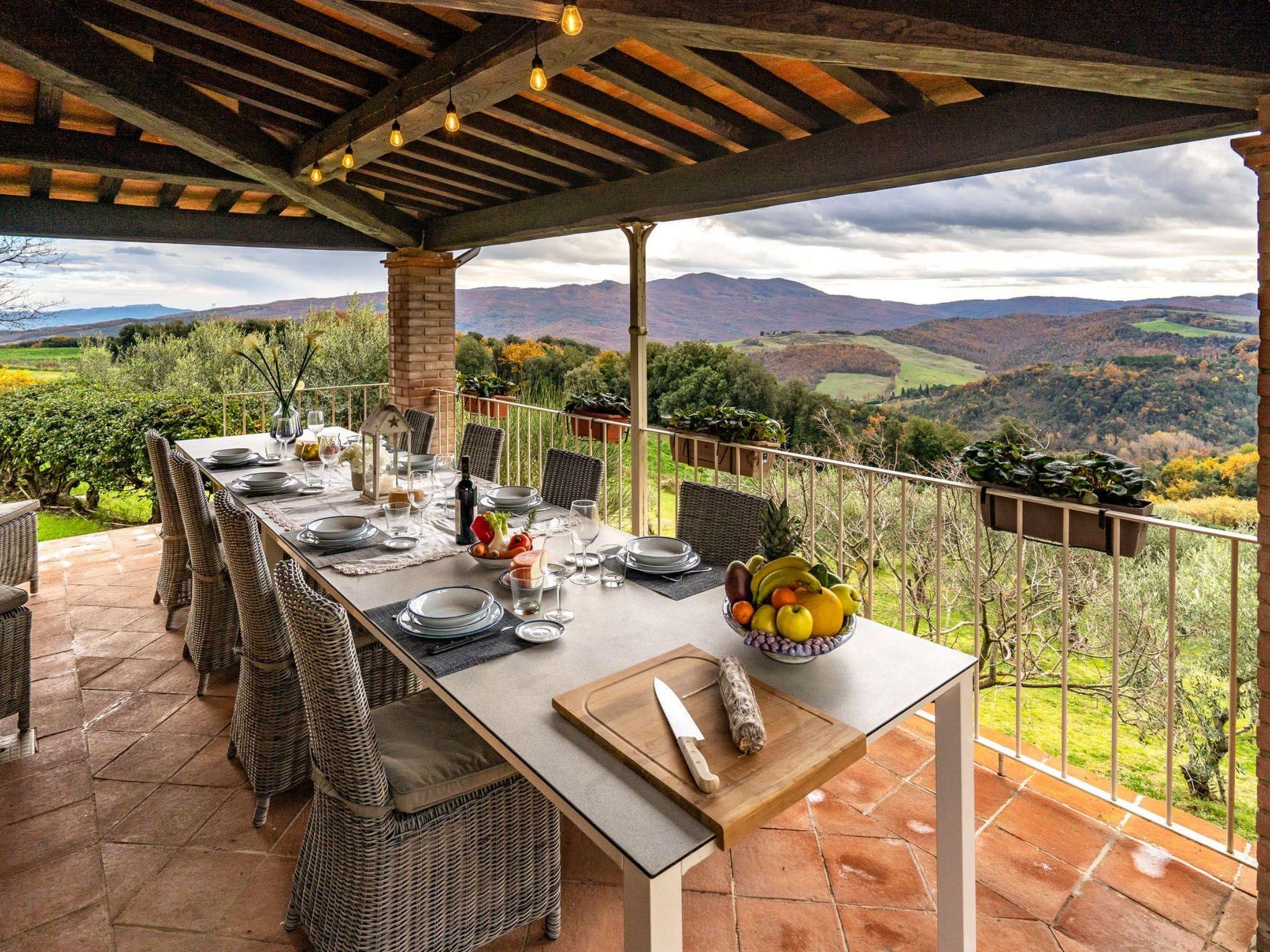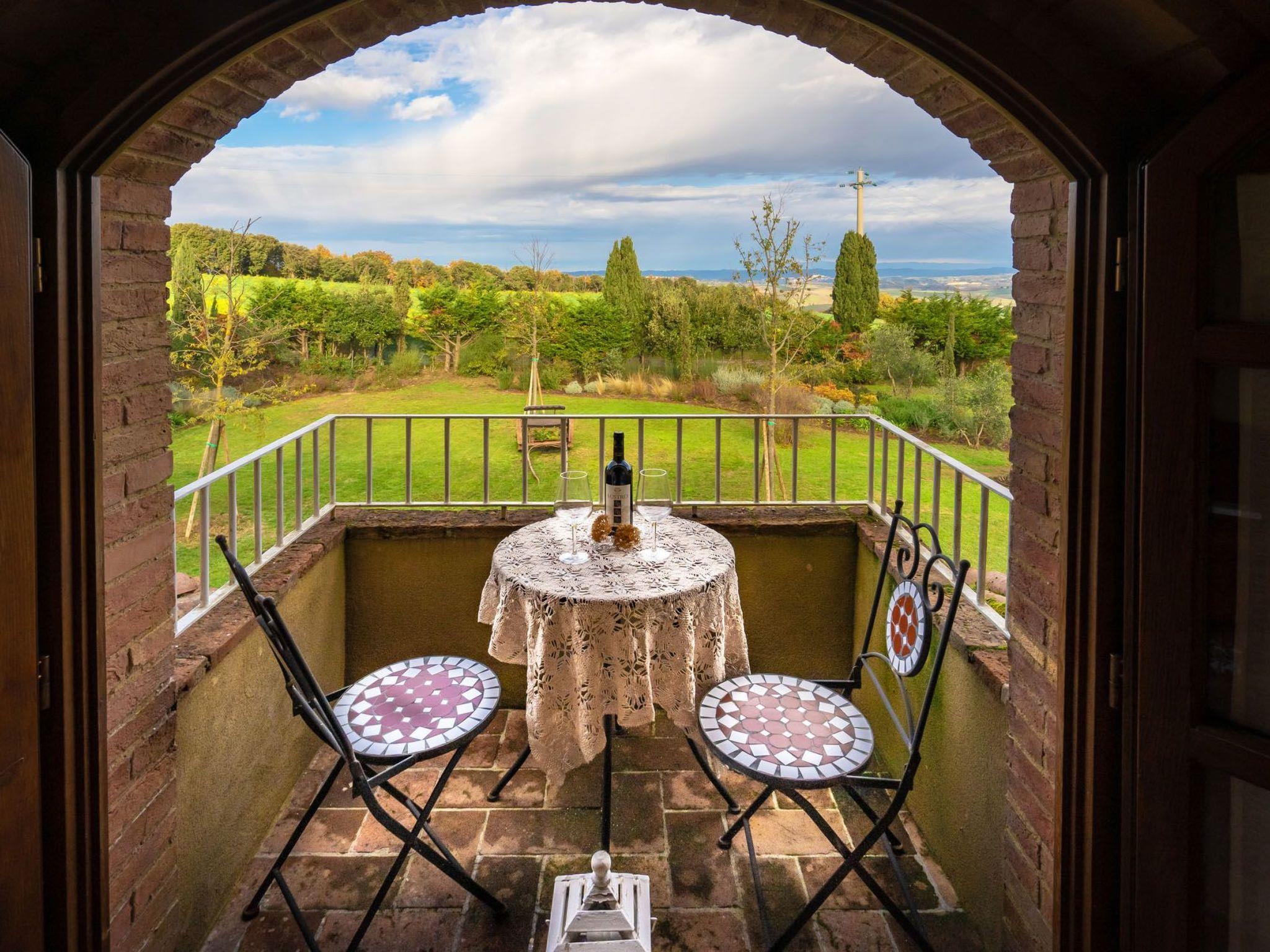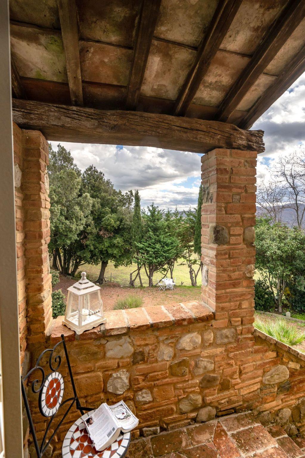 An external staircase, typical of Tuscan farmhouses, leads to the interior of the accommodation, consisting of a large living room, a fully equipped kitchen and two terraces with panoramic views. The sleeping area consists of two elegant double bedrooms with private bathrooms. On the ground floor there is a lovely portico surrounded by the garden, furnished with a sofa and armchairs. In front of the porch, for exclusive use, there is an outdoor kitchen with a covered veranda equipped for dinners for up to 8 people. From here, as well as from all sides of the house, there is a fantastic view of the surrounding hills and the town of Volterra.