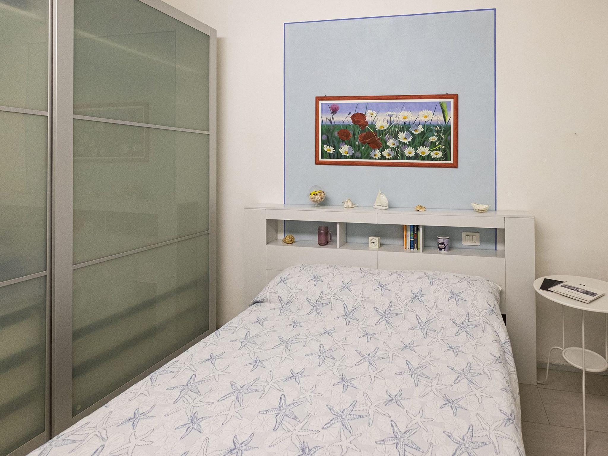 The bedroom has a French double bed, a spacious wardrobe with sliding doors and two internal drawers.