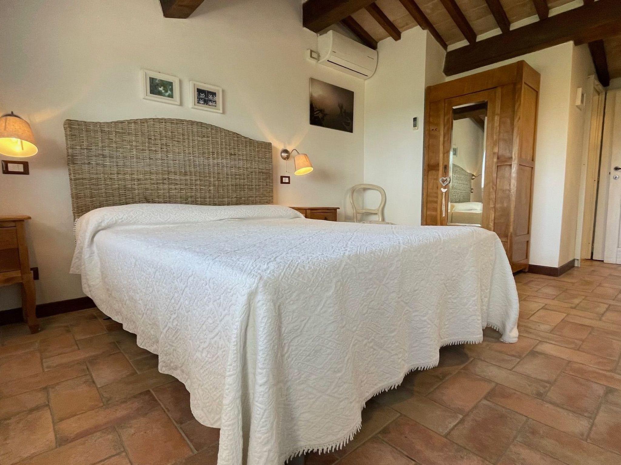 Poggio Cantarello has, on the second floor, two double rooms with private bathroom with shower cabin, view of the surrounding countryside, beamed ceilings and are furnished in a simple way and with antique arte povera wardrobes. Each room has a bathroom, satellite TV, wardrobe, chest of drawers/desk and Wi fi internet connection. (cot or cradle on request) The Rooms At guests' disposal, on the first floor, there is a living room with a double sofa bed, an antique - and working - fireplace, table and chairs, satellite TV and a kitchenette equipped with electric oven, sink, gas cooker and fridge. The Outdoors A large garden, full of many tall trees and olive trees, surrounds the house 2 mountain bikes are available to guests free of charge.