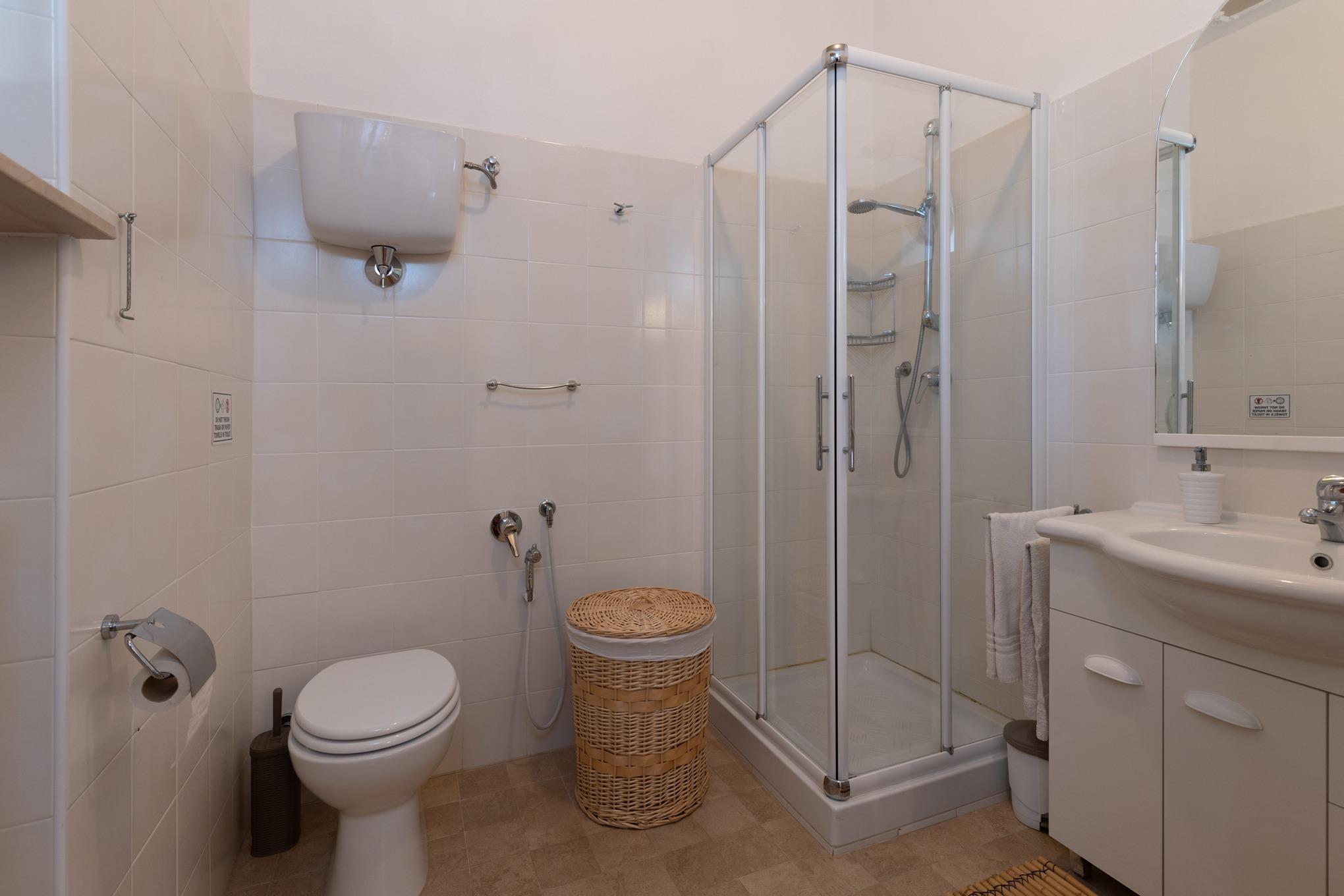 Im ersten Stock befinden sich die anderen drei Schlafzimmer: ein Doppelzimmer, ein Zweibettzimmer (das bei Bedarf in ein Doppelbett umgewandelt werden kann) und ein weiteres Doppelzimmer, das mit einem schönen Balkon ausgestattet ist.