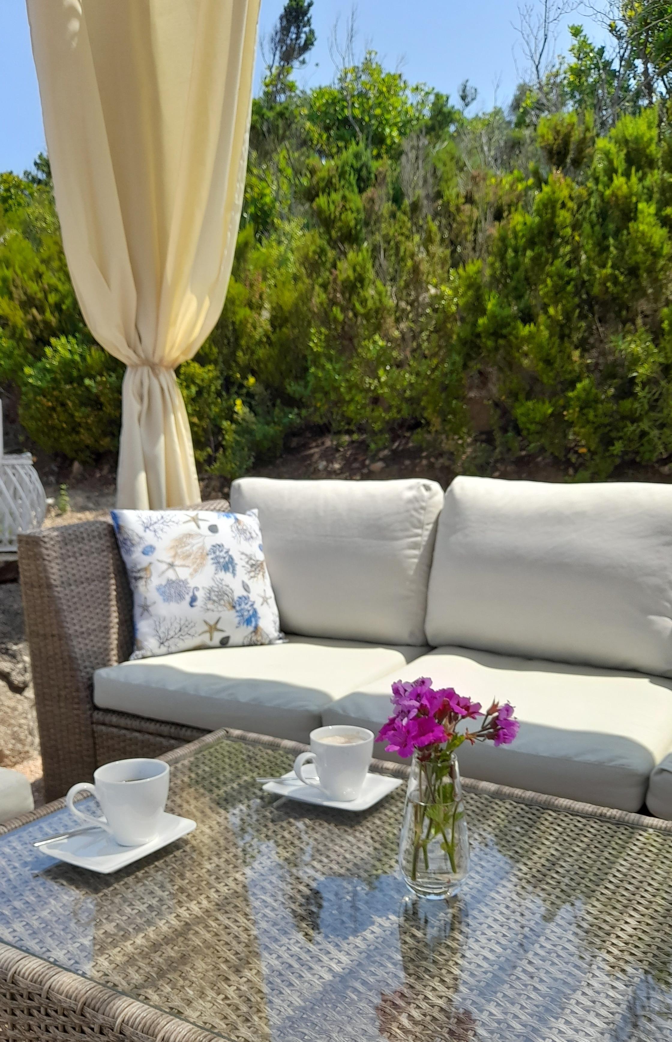Die großzügige Terrasse ist die teilweise überdacht und mit Holztisch, Stühlen, Schrank, 2 Liegen und Sonnenschirm sehr gut ausgestattet. Die Terrasse grenzt an den mediterrane Garten in der Nähe zum Pool mit der Lounge, wo an warmen Abenden der Sundowner auch genossen werden kann.