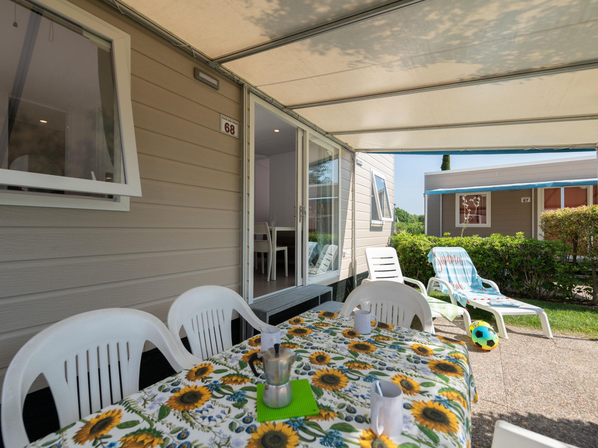 "Garda Suite Deluxe", 3-room mobile home 32 m2. Object suitable for 4 adults + 1 child. Beautiful and modern furnishings: living/sleeping room with 1 sleeping facility (77 cm, length 190 cm), dining table, TV, air conditioning and forced-air heating. 1 room with 1 double bed (140 cm, length 190 cm), shower/WC. 1 room with 2 beds (80 cm, length 190 cm). Open kitchen (4 gas rings, microwave). Shower/WC. Patio. Terrace furniture, barbecue, deck chairs (2). Facilities: safe, mosquito net, hair dryer. Parking (1 car). Maximum 1 pet/ dog allowed. IT017067B1HII4DV9G