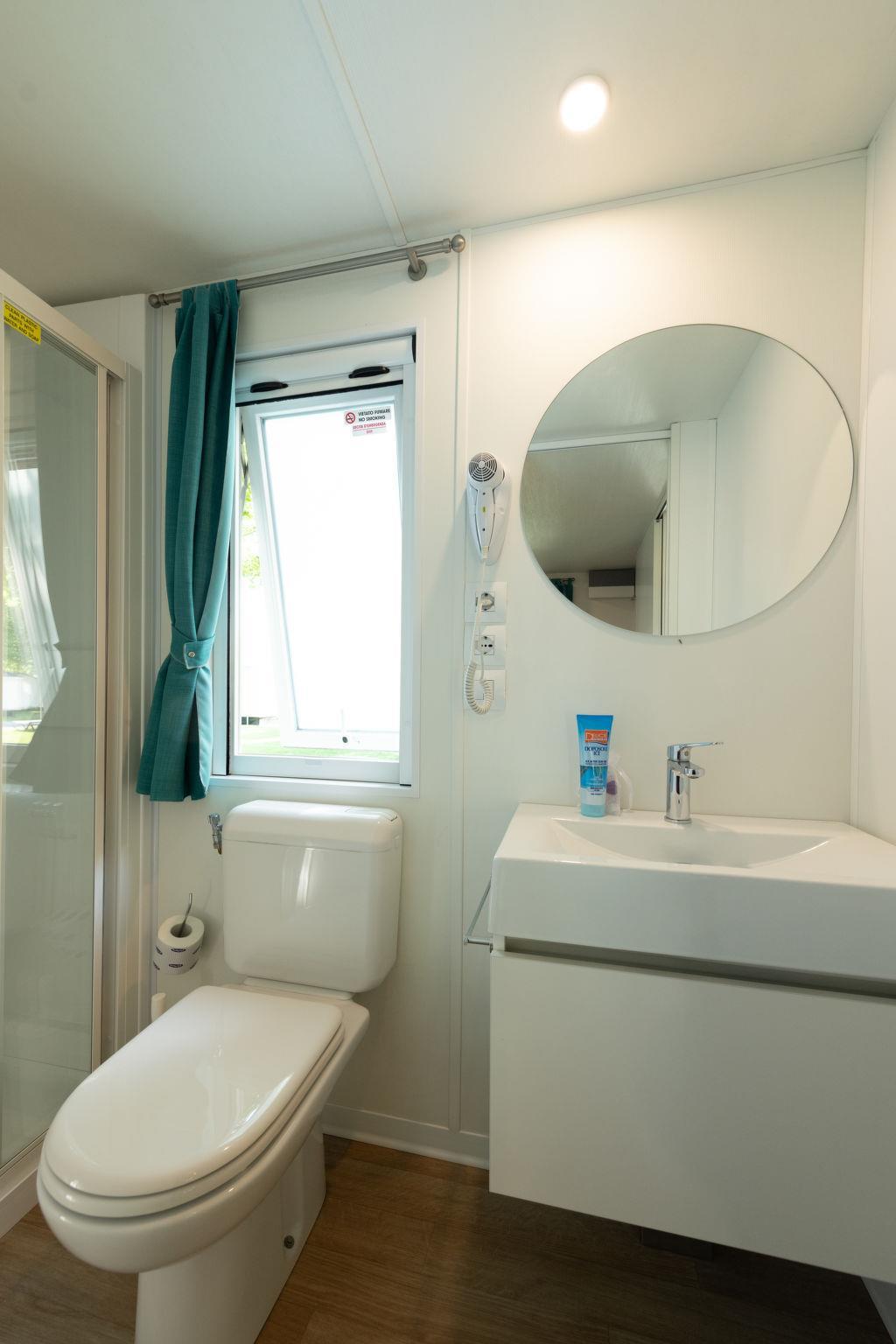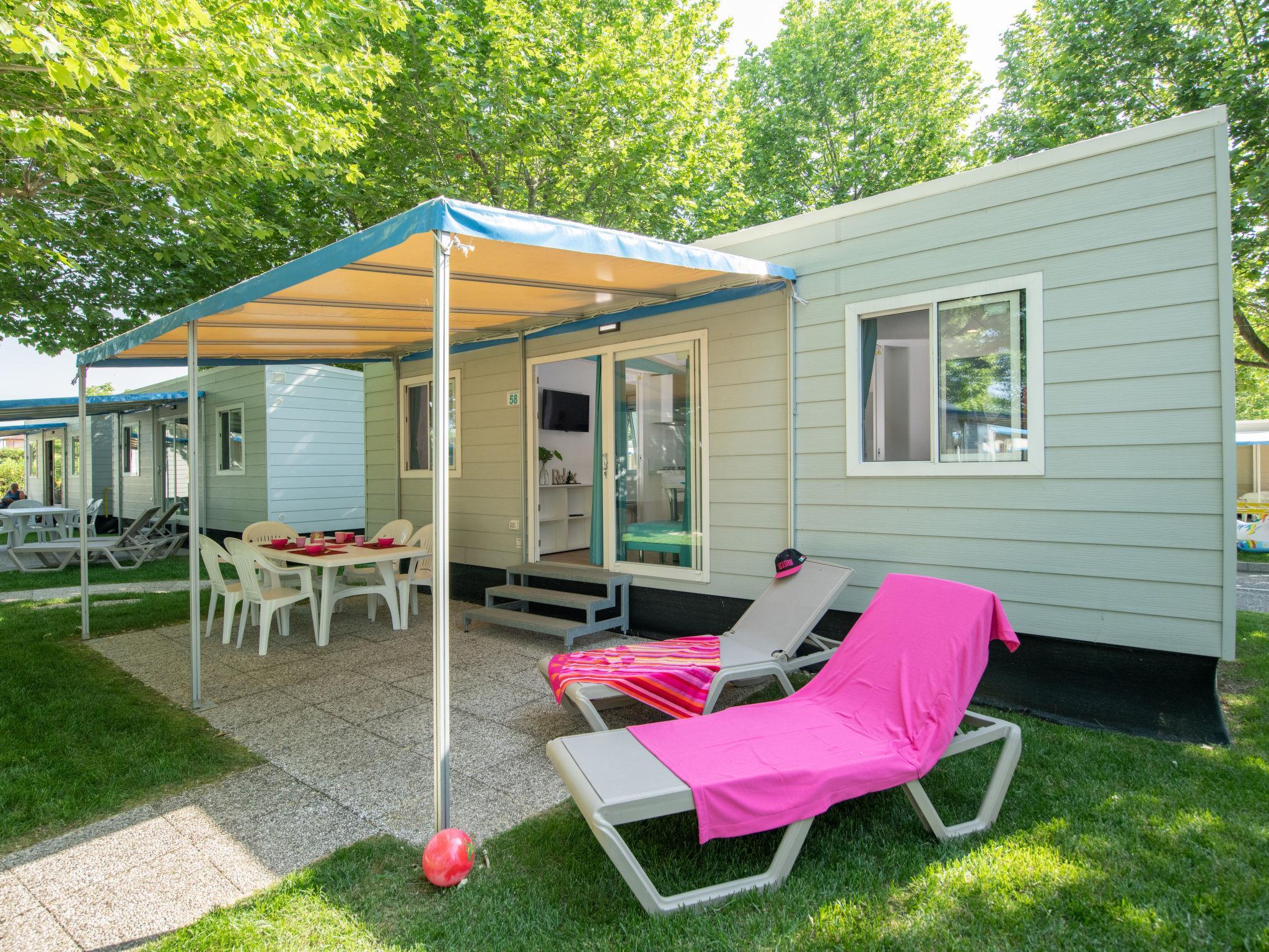 "Garda Blue", 3-room mobile home 32 m2. Object suitable for 4 adults + 1 child. Modern furnishings: living/sleeping room with 1 sleeping facility (70 cm, length 185 cm), dining table, TV, air conditioning and forced-air heating. 1 room with 1 double bed (160 cm, length 200 cm), shower/WC. 1 room with 2 beds (75 cm, length 200 cm), shower/WC. Open kitchen (4 gas rings, microwave). Patio. Terrace furniture, barbecue, deck chairs (2). Facilities: safe, mosquito net, hair dryer. Parking (1 car). Maximum 1 pet/ dog allowed. IT017067B1HII4DV9G