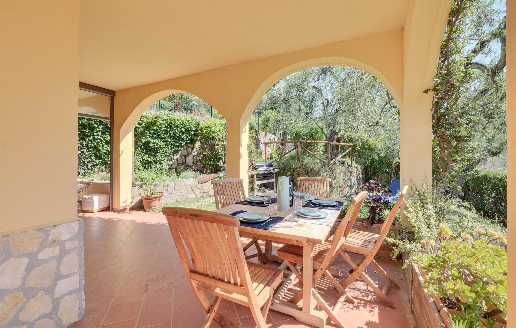 Velkommen til dette indbydende hjem i en idyllisk beliggenhed, ideel til en afslappende badeferie. De lyse værelser med deres funktionelle indretning gør huset til det ideelle udgangspunkt for afslapning med familien. Glæd jer til at lave mad sammen og indtag dagens måltider på den hyggelige terrasse, hvor I kan afslutte dagen med kolde drinks på en mild sommeraften. Tilbring skønne timer udendørs, udendørsområdet byder på de bedste muligheder for fuldt ud at nyde den smukke udsigt over havet.