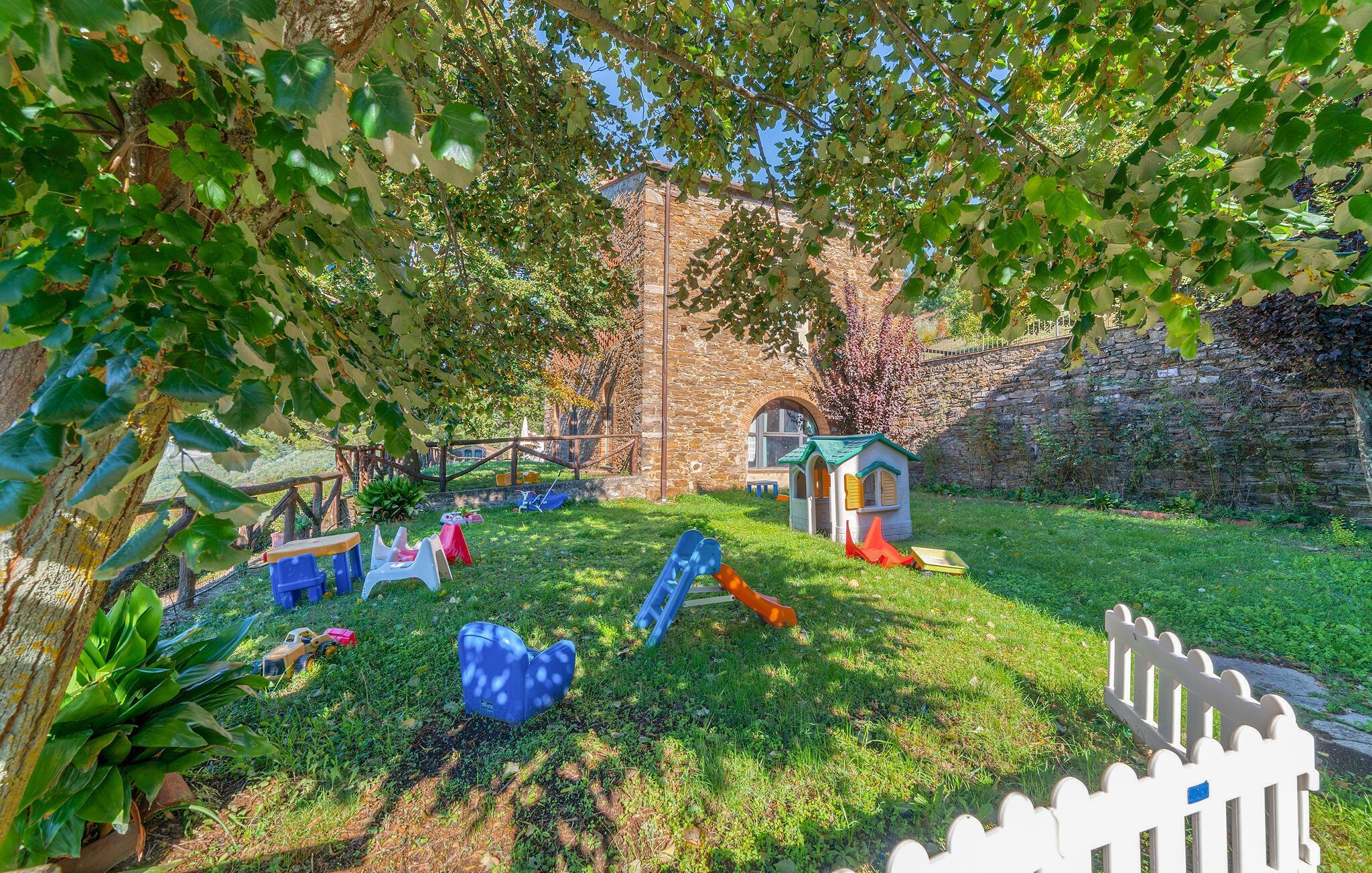 Udendørsområdet er et sandt paradis. Slap af ved den store fællespool med liggestole og parasoller, eller nyd en picnic på den grønne plæne. De yngste feriegæster kan more sig på gyngen, rutsjebanen eller lege frit i den rummelige have. Brug terrassen til måltider under åben himmel, mens I nyder den fantastiske udsigt over det toskanske landskab.