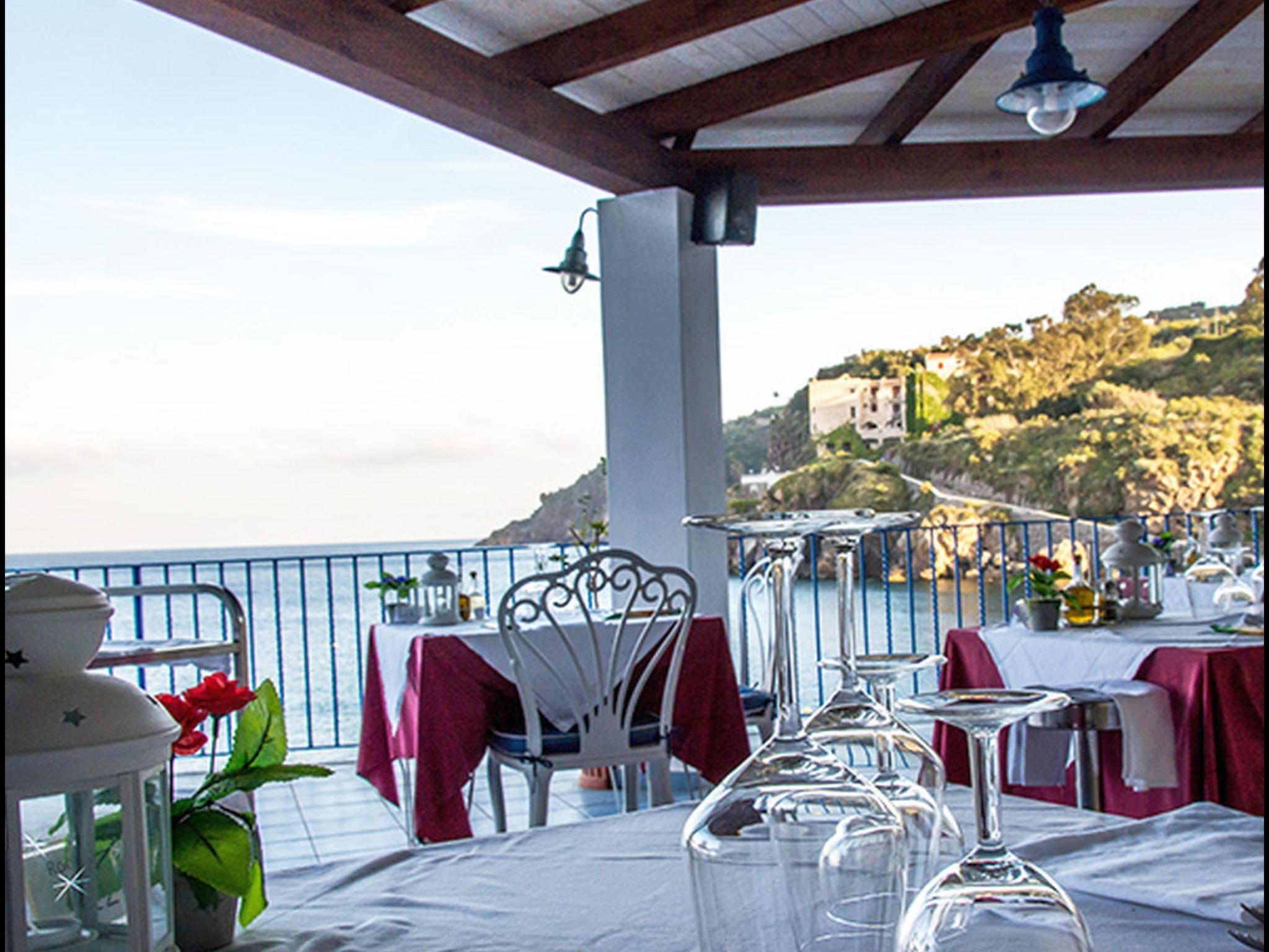 Externally, the hotel marvels with its privileged position on the rocks lapping against the clear blue waters of the Aeolian sea, and with a sandy beach in the small bay of Porto delle Genti. The bar and restaurant, with terraces directly overlooking the sea, and a platform built on the water equipped with sun loungers and parasols, ensure relaxation and enjoyment of the senses at all times of day.