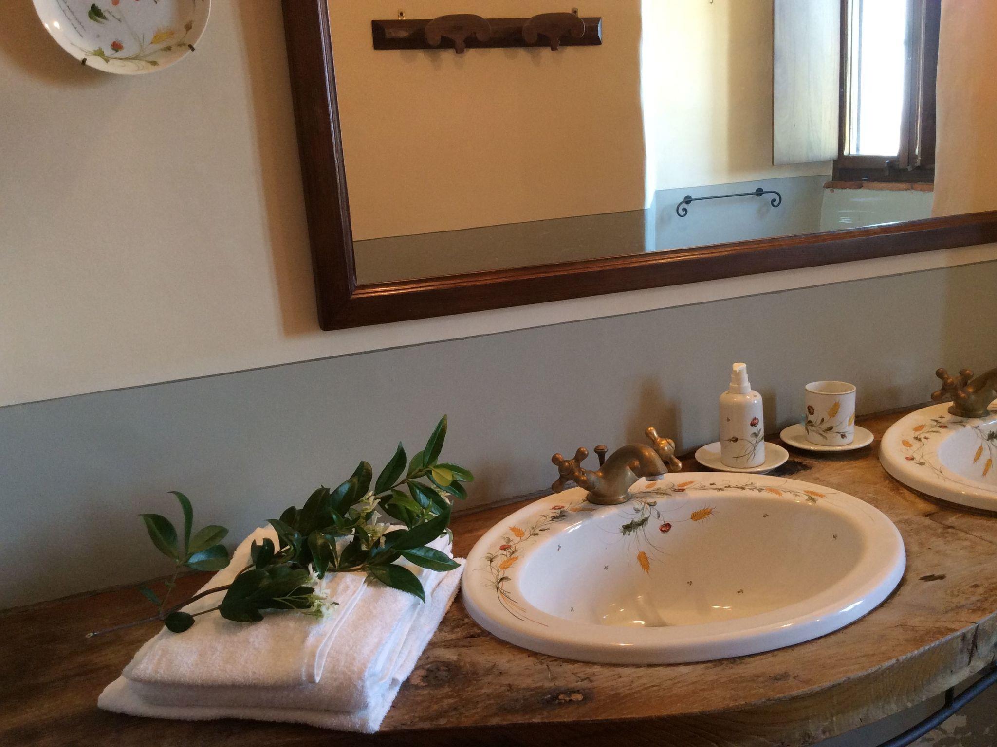 - Large living room with 2 sofas, satellite TV - Bathroom with shower - Service area with large shoe rack and large hand-painted wardrobe First floor "La Villa degli Ulivi": - Double bedroom (master) with terrace (2 windows and 1 door/window), mezzanine with large wardrobe, dresser and TV - Master bathroom with Turkish bath, 2 sinks and mirror for make-up and hair-drying - Triple bedroom with mezzanine: 1 double bed and 1 single bed on the mezzanine (2 windows), room/closet and TV - Bathroom with shower and 2 sinks - Living area with single bed that can be used as a sofa during the day (1 window and 2 doors/windows giving onto the terrace shared with the Double Room) Second attic floor "La Villa degli Ulivi":