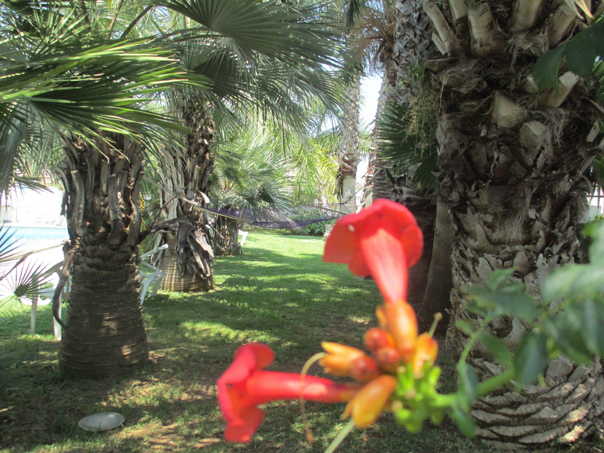 The Mediterranean-style building is surrounded by many varieties of palm trees that frame the swimming pool for the common use of holidaymakers.