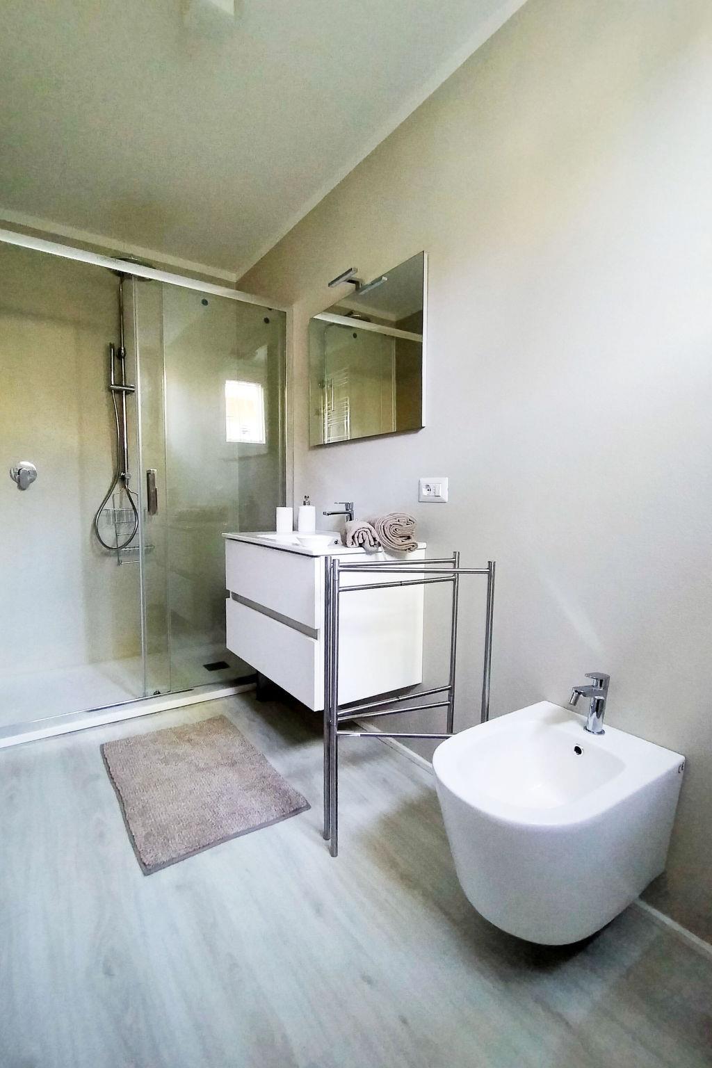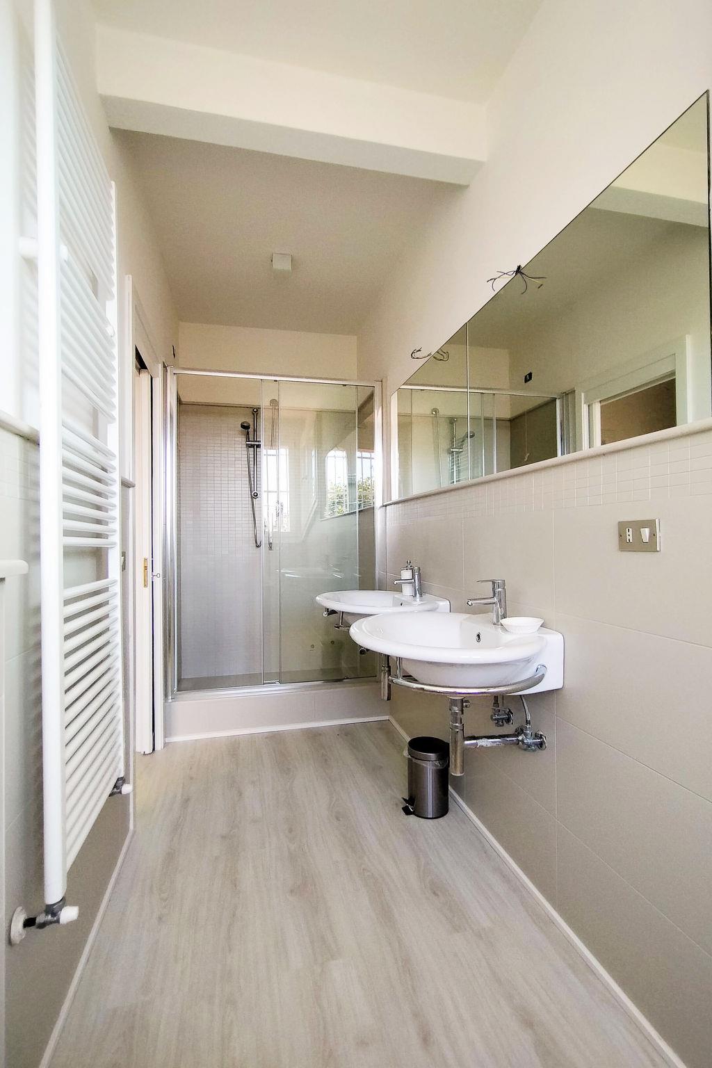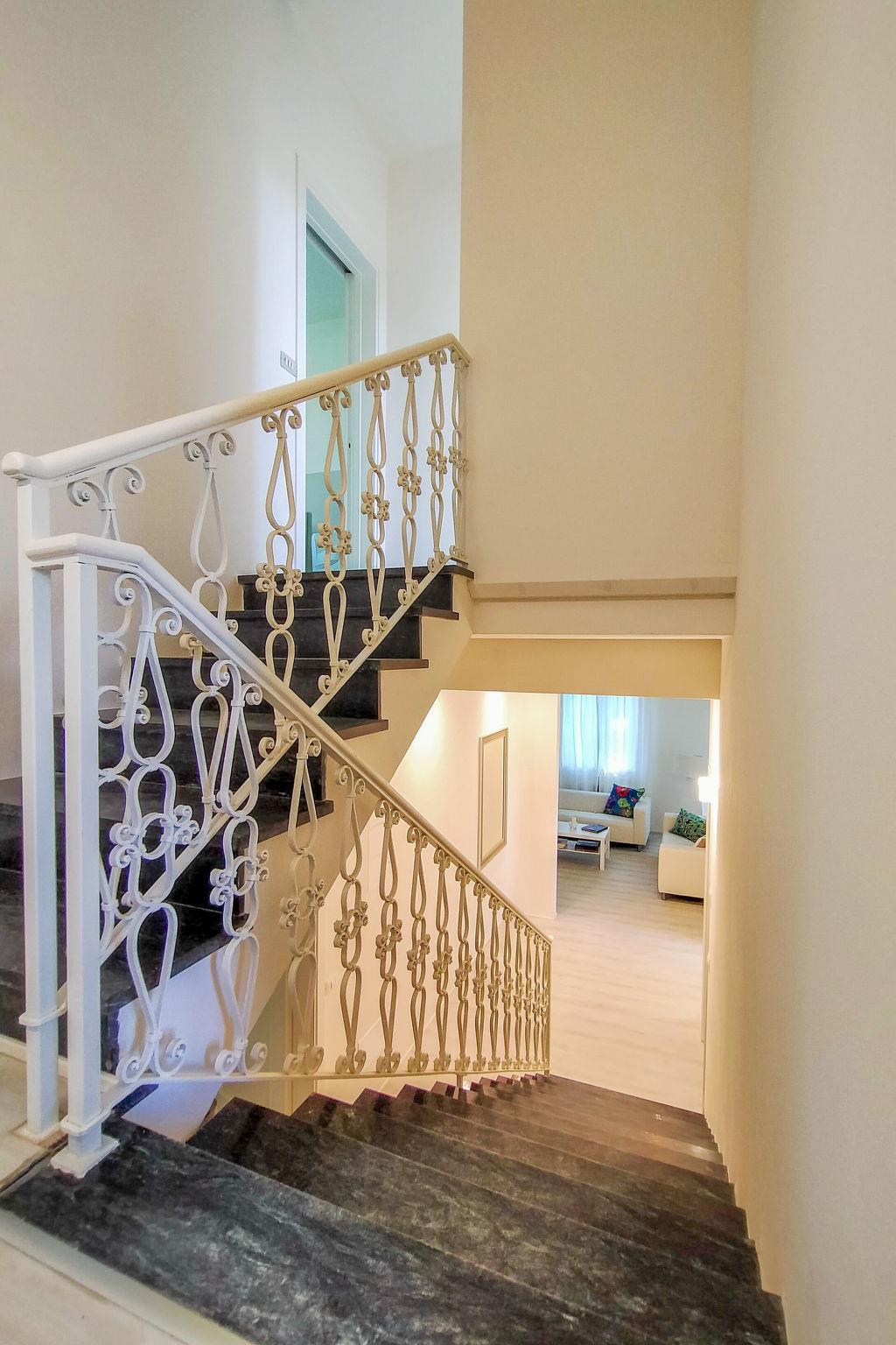 "Villa Martino", 7-room villa 230 m2 on 3 levels. Spacious and bright, fully renovated, very comfortable and modern furnishings: large living/dining room with digital TV and air conditioning. Exit to the garden. 1 room with 2 beds and shower. 1 large room with 1 french bed (140 cm, length 190 cm), shower/bidet/WC and TV (flat screen), air conditioning. 1 large room with 1 french bed (140 cm, length 190 cm), shower/bidet/WC and TV (flat screen), air conditioning. Large kitchen (4 hot plates, oven, dishwasher, microwave, freezer) with dining table, air conditioning. Sep. WC. Gas heating, air-conditioning. Heating available only from 01.11. to 15.04. Upper floor: 1 large double bedroom with shower/bidet/WC and TV (flat screen), air conditioning. 1 room with 2 beds, bath/bidet/WC and TV (flat screen), air conditioning. 2nd upper floor: 1 double bedroom with shower/bidet/WC and TV (flat screen), air conditioning. Studio. Large patio. Barbecue. Facilities: washing machine, dryer. Internet (WiFi, free). Parking (fenced 2 cars) at the house. Please note: suitable for families. Fire extinguisher. covered outdoor area, well equipped, ideal for having lunch and dinner outdoors. IT046013B436ABLMEO