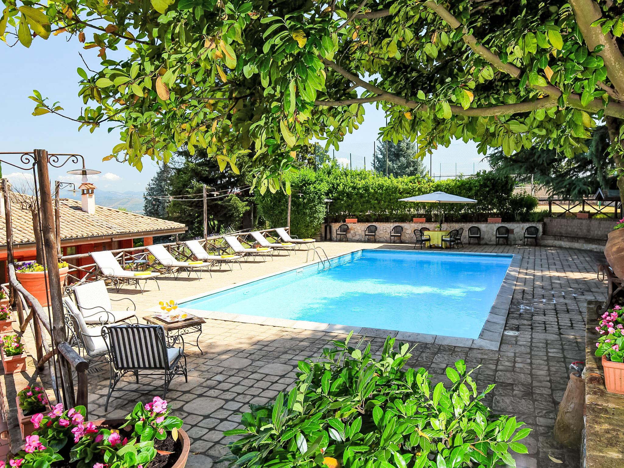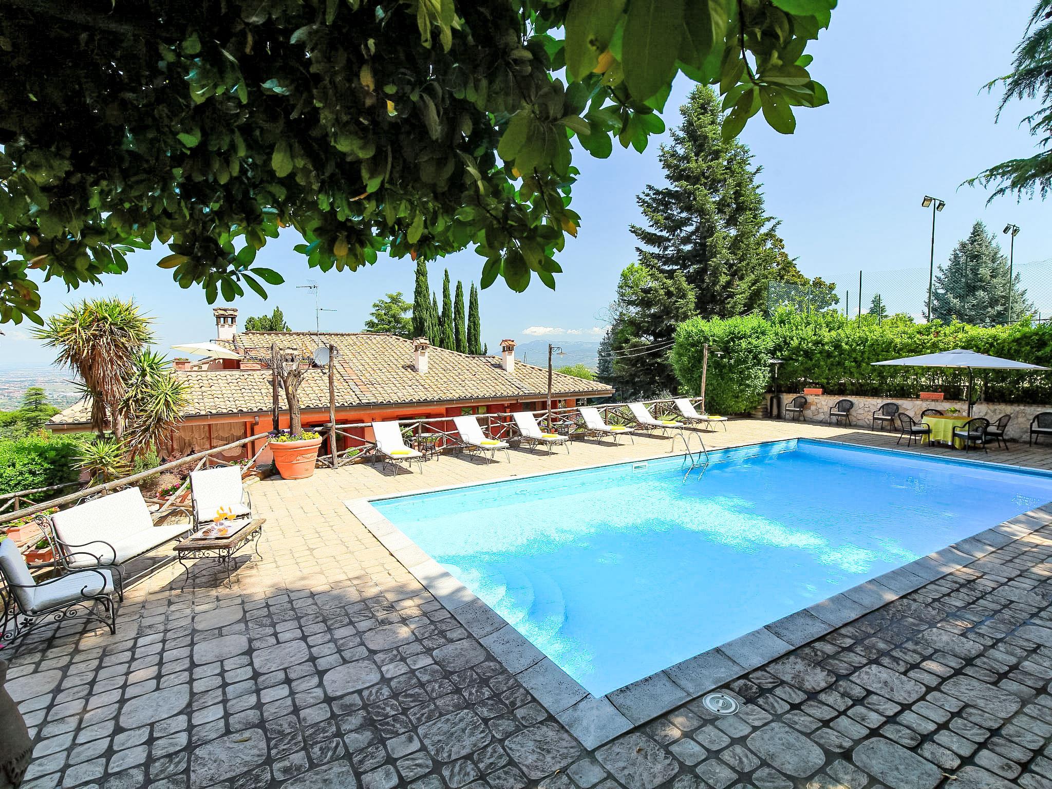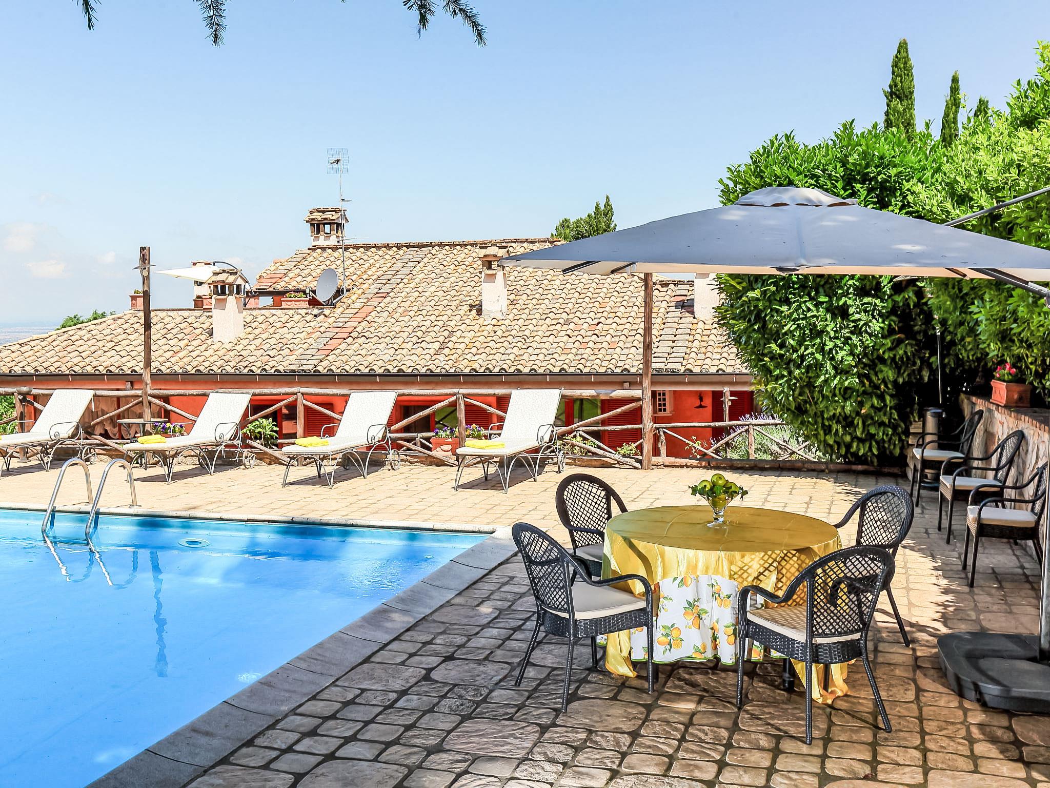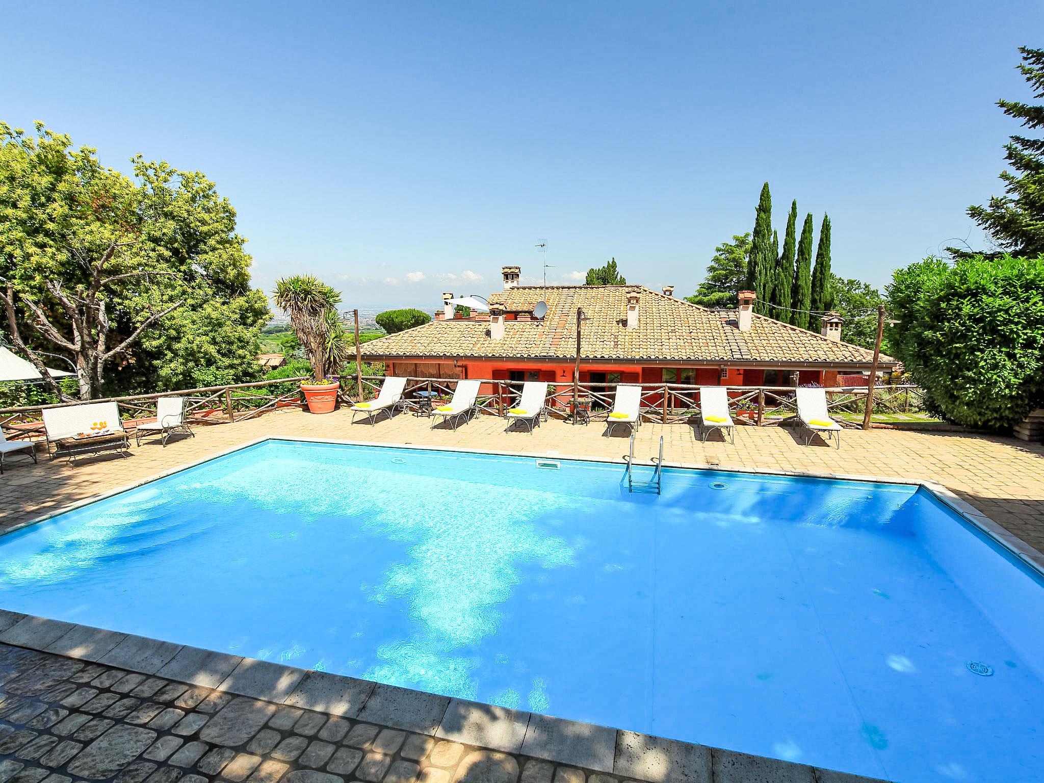 Montecomprati 7 km from Frascati: Cosy, luxurious villa "Villa Mina", 600 m a.s.l., detached. 35 km from the centre of Roma, 7 km from the centre of Frascati, in a quiet, sunny position residential area (villas), 30 km from the sea. Private: park 10'000 m2 (fenced), flowers and trees, beautiful garden to relax, swimming pool (6 x 12 m, depth 150 - 190 cm, seasonal availability: 01.May. - 31.Oct.). Outdoor shower, tennis (1 x hard court), patio, pergola, garden furniture, barbecue, barbecue house. In the house: central heating system, air conditioning, heating to be paid on the spot (01.Nov. - 01.Apr.). Towel change (suppl. charge extra). Room cleaning daily on request (extra). House maid daily on request (extra). Cook on request (extra). Pre-arrival grocery service. Airport transfer (extra). Parking (for 5 cars). Shop 3 km, grocery 3 km, supermarket 3 km, restaurant 3 km, bar 3 m, bakery 3 km, bus stop 1.5 km, railway station "Montecompatri (Roma Termini)" 1 km. Nearby attractions: Frascati 7 km, Castel Gandolfo 18 km, Parco Castelli Romani 14 km, Rocca di Papa 14 km, Ariccia 21 km, Grottaferrata 12 km. Well-known lakes can easily be reached: Lago Albano 18 km, Lago di Nemi 25 km. Please note: car recommended. Baby equipment on request. Groups of teenagers on request only. Suitable for events. Cooking courses bookable on request. On request: airport transfer to the holiday accommodation. The owner does not accept any groups. Motorway 5 km from the property. The caretakers live on the lower ground floor.