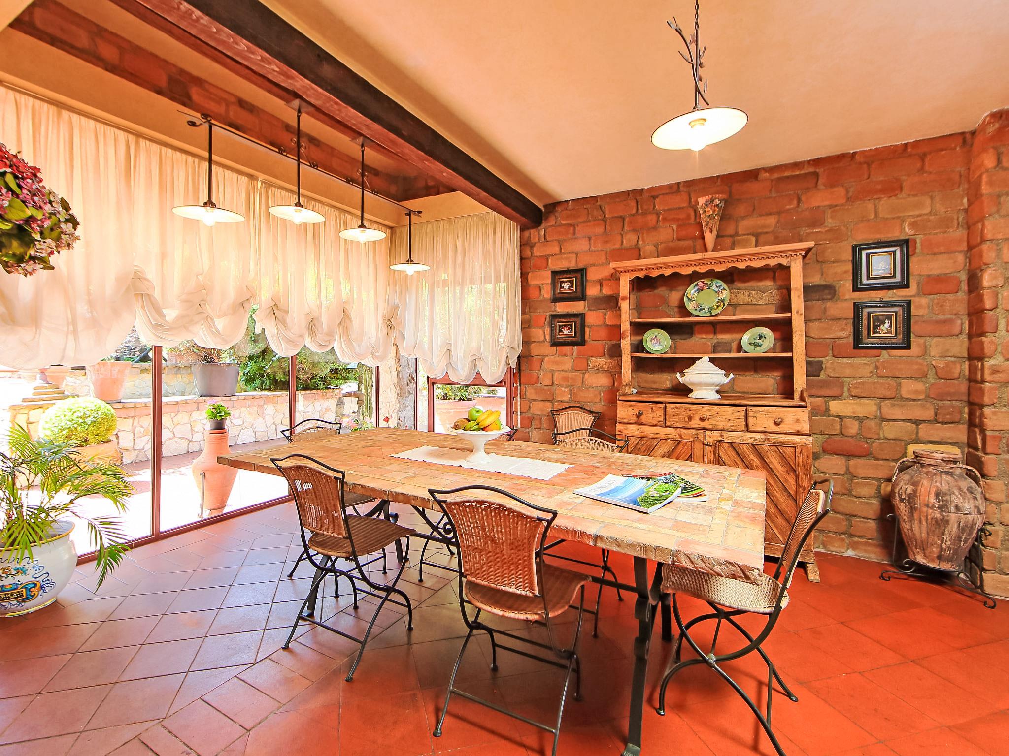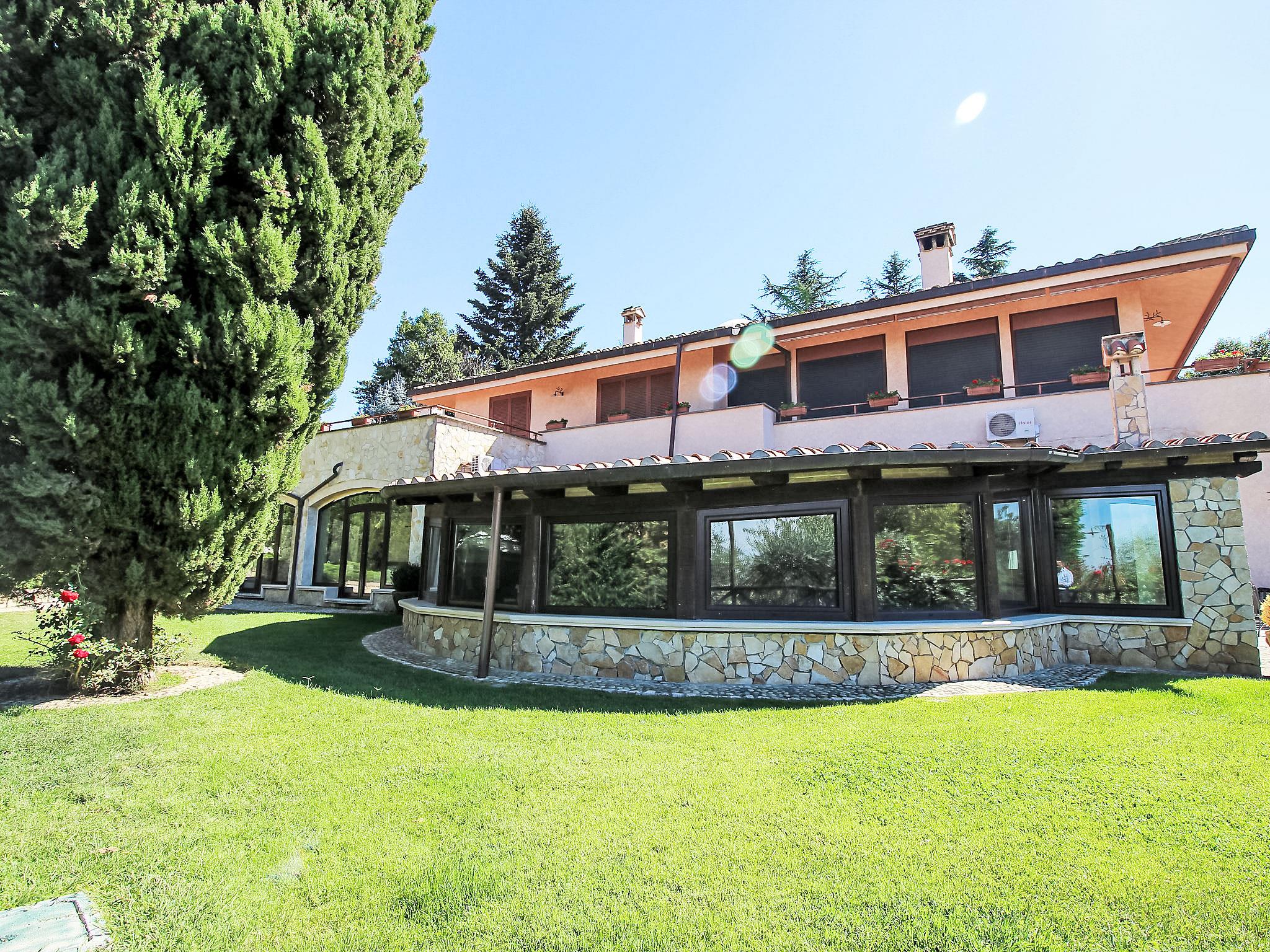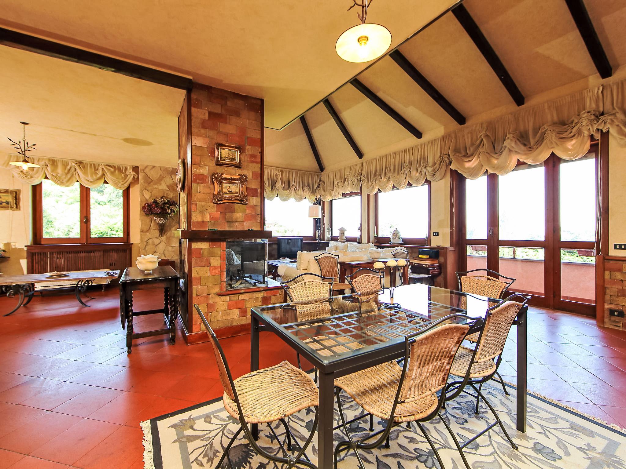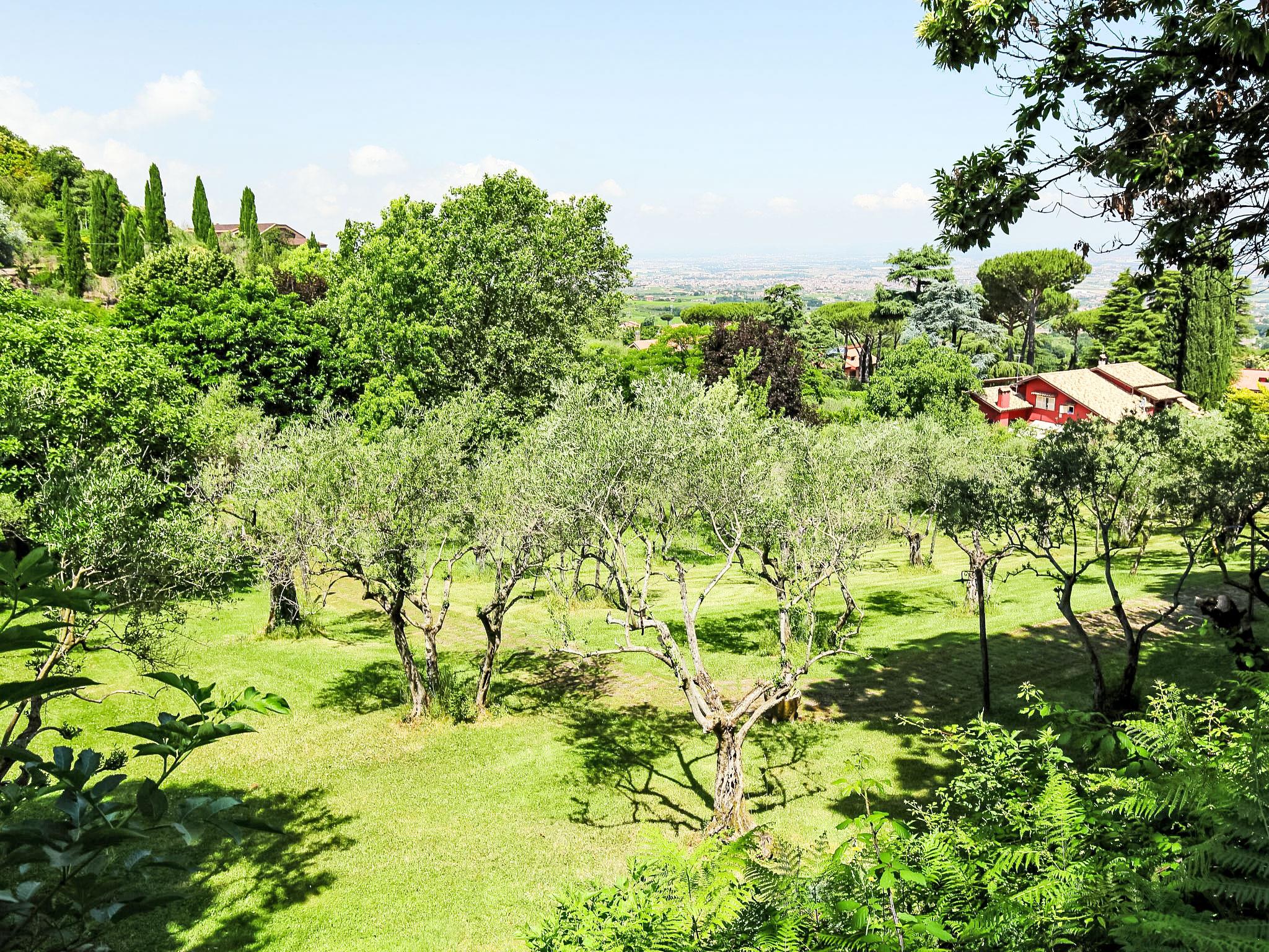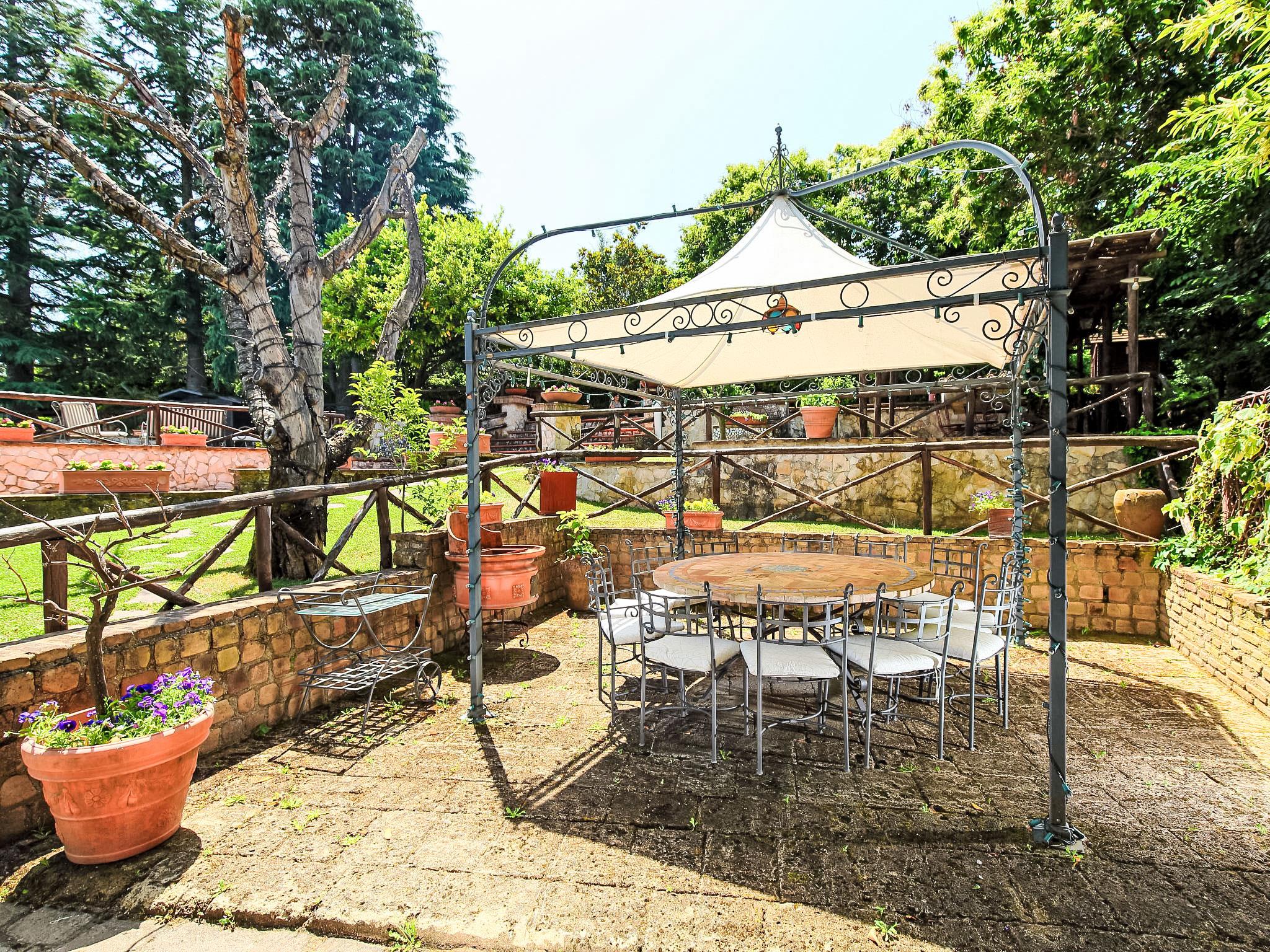 8-room villa 350 m2 on 3 levels. Spacious and bright, luxurious furnishings: large entrance hall. Open large living room with open-hearth fireplace, satellite TV, flat screen and air conditioning. Exit to the garden, to the terrace. Dining room with air conditioning. 2 rooms with sloping ceilings, each room with 1 bed (120 cm, length 190 cm), 1 french bed (140 cm, length 190 cm), air conditioning. Exit to the garden, to the terrace. 1 room with 1 double bed, bath/shower/bidet/WC, double hand-basin, hydro massage bath, TV and air conditioning. Exit to the balcony. Kitchen (6 hot plates, oven, dishwasher, toaster, kettle, microwave, freezer, electric coffee machine, Capsules for coffee machine (6) free). Exit to the garden. 2 showers/bidet/WC. Heating, air-conditioning. On the lower ground floor: large living/dining room with open-hearth fireplace, dining table, satellite TV and flat screen. Exit to the garden. Shower/bidet/WC. Upper floor: 1 large room with sloping ceilings with 1 double bed (160 cm, length 190 cm), TV (flat screen), air conditioning. Exit to the balcony. 1 room with sloping ceilings with (160 cm, length 190 cm), 1 double bed, TV, flat screen and air conditioning.) with dining table. Shower/bidet/WC. Large garden. Terrace furniture, barbecue. Very beautiful panoramic view of the countryside and Rome. Facilities: washing machine, iron, baby cot for up to 2 year olds, hair dryer. Internet (WiFi, free). Maximum 1 pet/ dog allowed. The master bathroom has a hydromassage tub. When there are less than the maximum number of guests staying at the property, not all of the bedrooms will be available for use. IT058060C2VEIARDR5