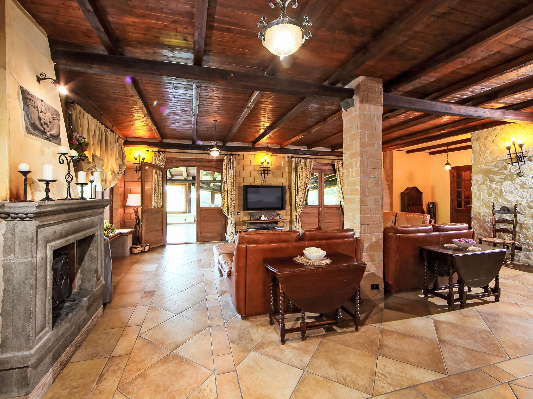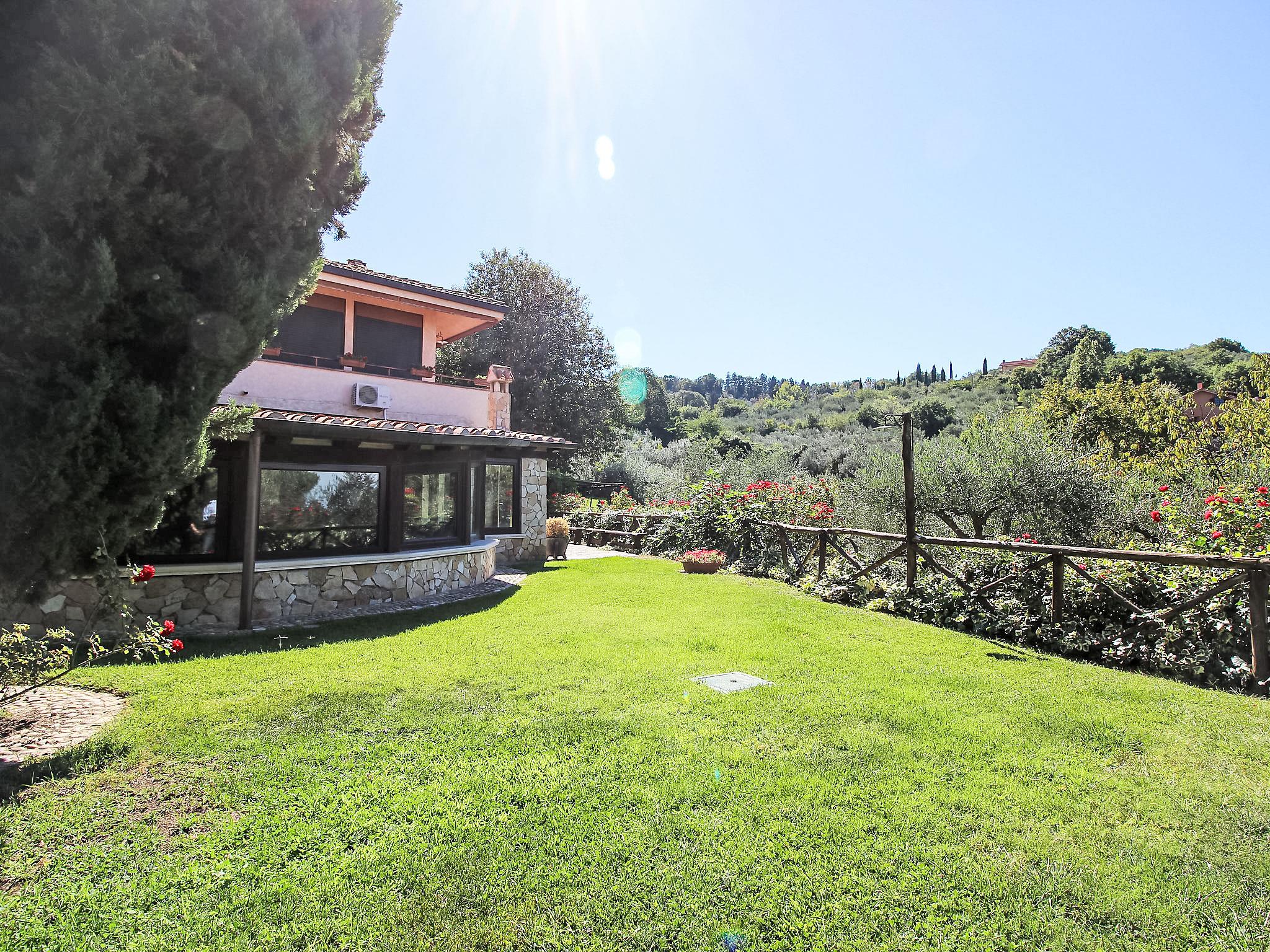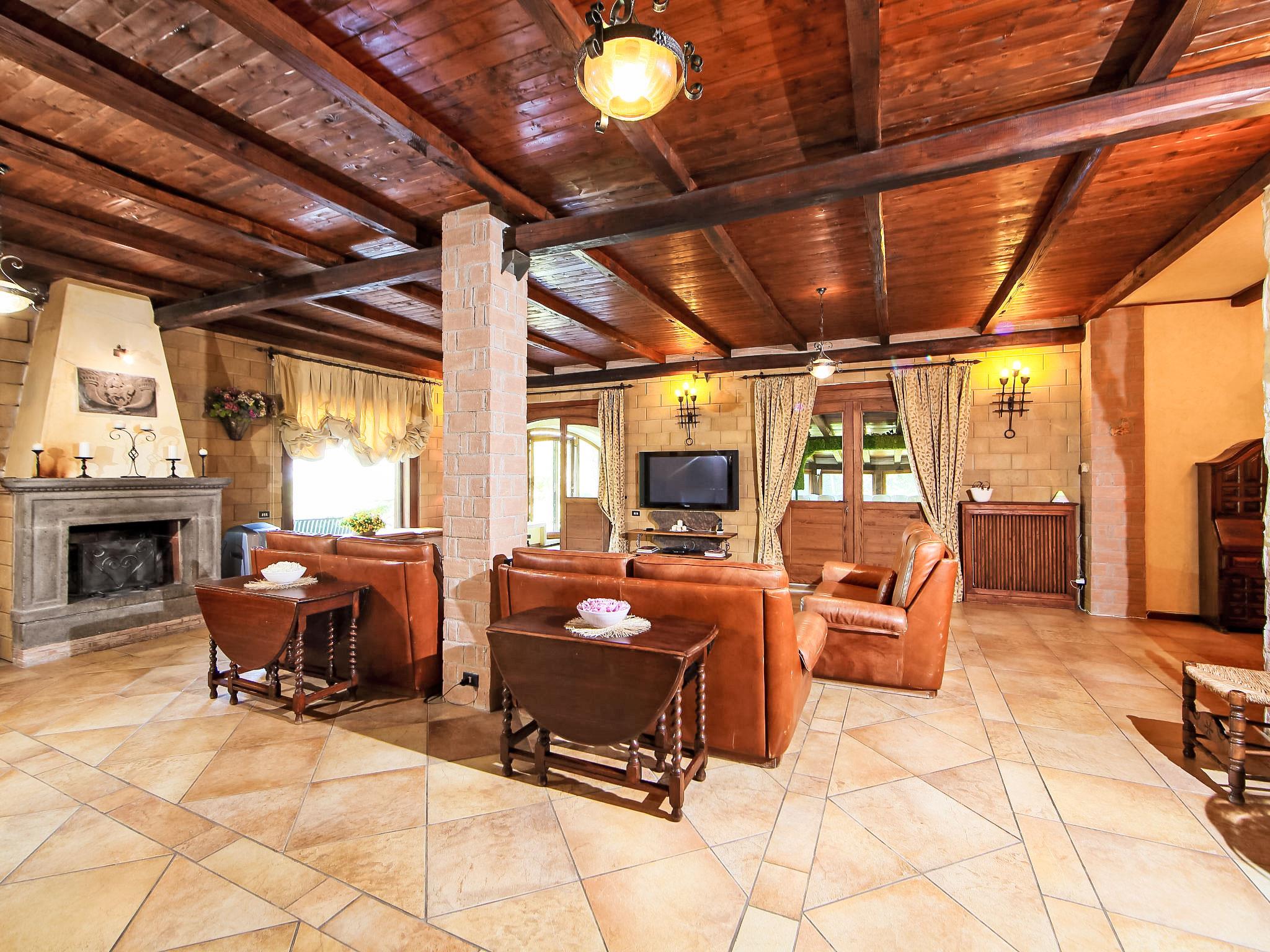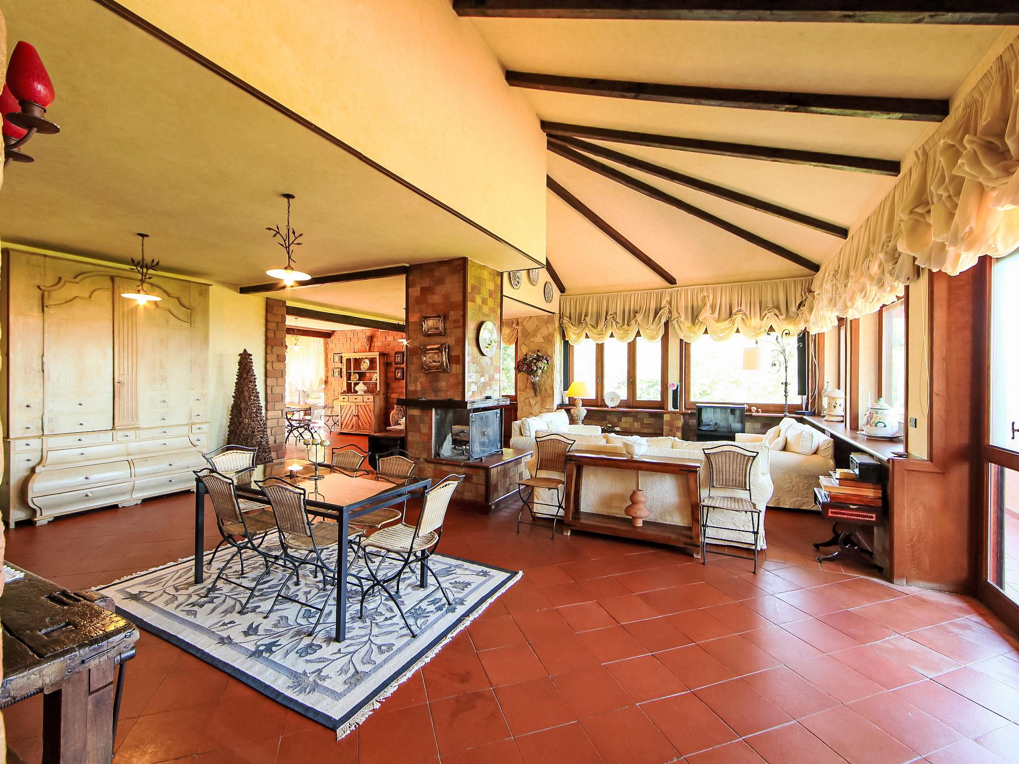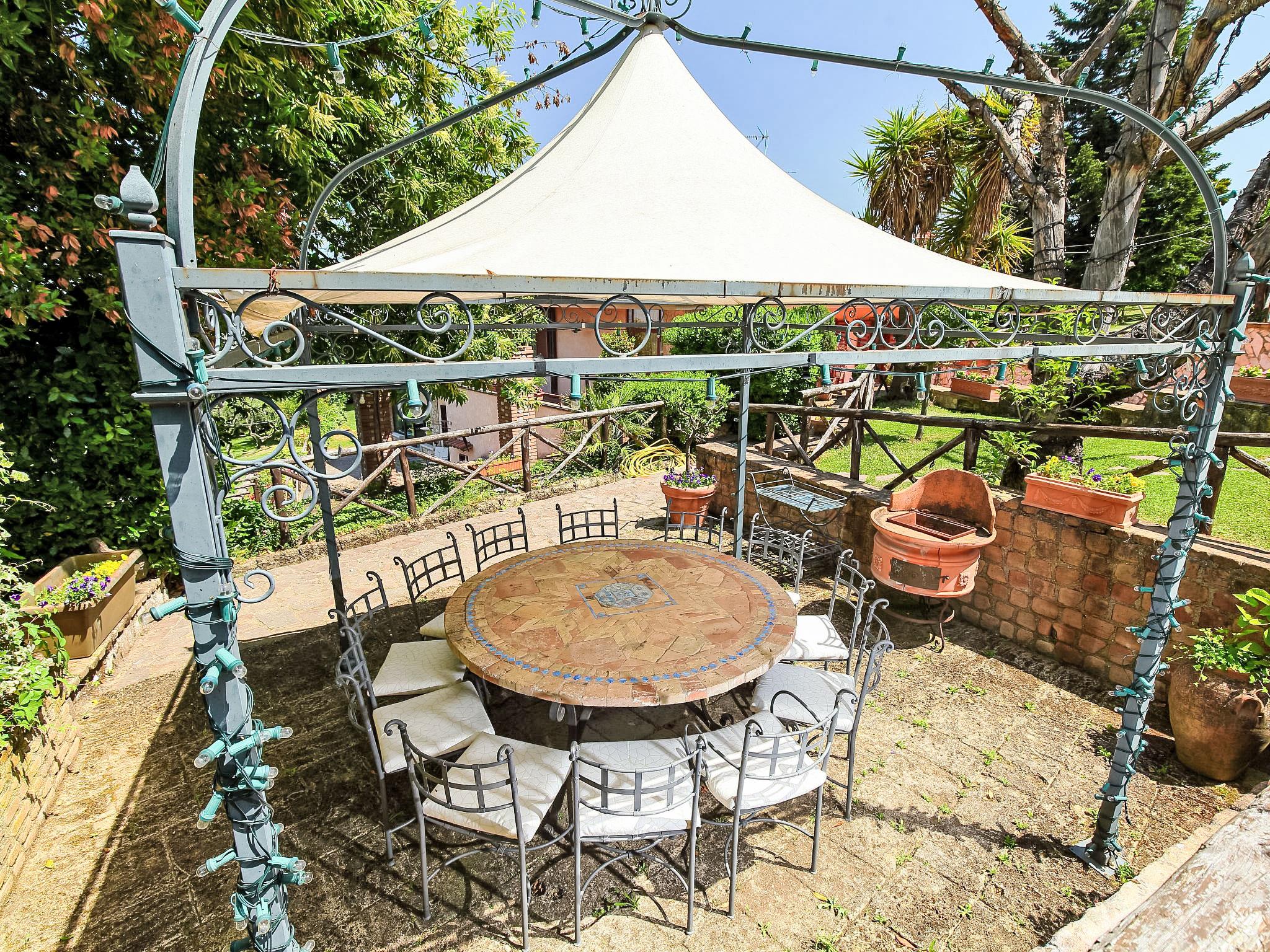 8-room villa 350 m2 on 3 levels. Spacious and bright, luxurious furnishings: large entrance hall. Open large living room with open-hearth fireplace, satellite TV, flat screen and air conditioning. Exit to the garden, to the terrace. Dining room with air conditioning. 2 rooms with sloping ceilings, each room with 1 bed (120 cm, length 190 cm), 1 french bed (140 cm, length 190 cm), air conditioning. Exit to the garden, to the terrace. 1 room with 1 double bed, bath/shower/bidet/WC, double hand-basin, hydro massage bath, TV and air conditioning. Exit to the balcony. Kitchen (6 hot plates, oven, dishwasher, toaster, kettle, microwave, freezer, electric coffee machine, Capsules for coffee machine (6) free). Exit to the garden. 2 showers/bidet/WC. Heating, air-conditioning. On the lower ground floor: large living/dining room with open-hearth fireplace, dining table, satellite TV and flat screen. Exit to the garden. Shower/bidet/WC. Upper floor: 1 large room with sloping ceilings with 1 double bed (160 cm, length 190 cm), TV (flat screen), air conditioning. Exit to the balcony. 1 room with sloping ceilings with (160 cm, length 190 cm), 1 double bed, TV, flat screen and air conditioning.) with dining table. Shower/bidet/WC. Large garden. Terrace furniture, barbecue. Very beautiful panoramic view of the countryside and Rome. Facilities: washing machine, iron, baby cot for up to 2 year olds, hair dryer. Internet (WiFi, free). Maximum 1 pet/ dog allowed. The master bathroom has a hydromassage tub. When there are less than the maximum number of guests staying at the property, not all of the bedrooms will be available for use. IT058060C2VEIARDR5