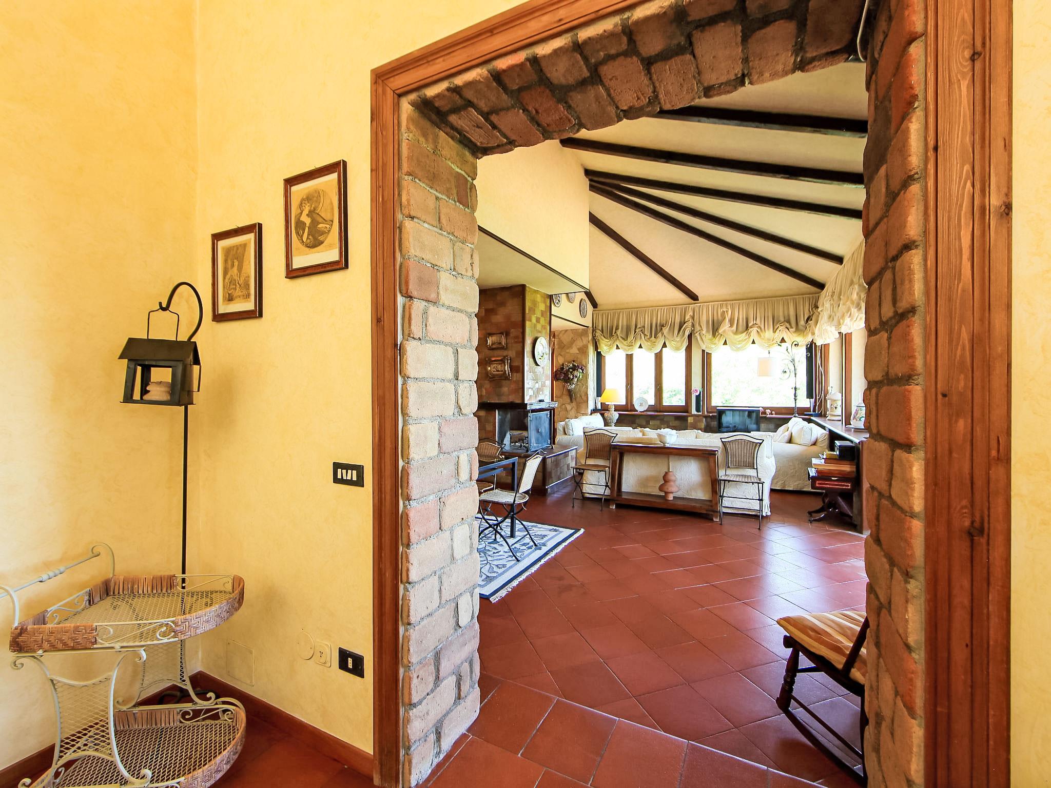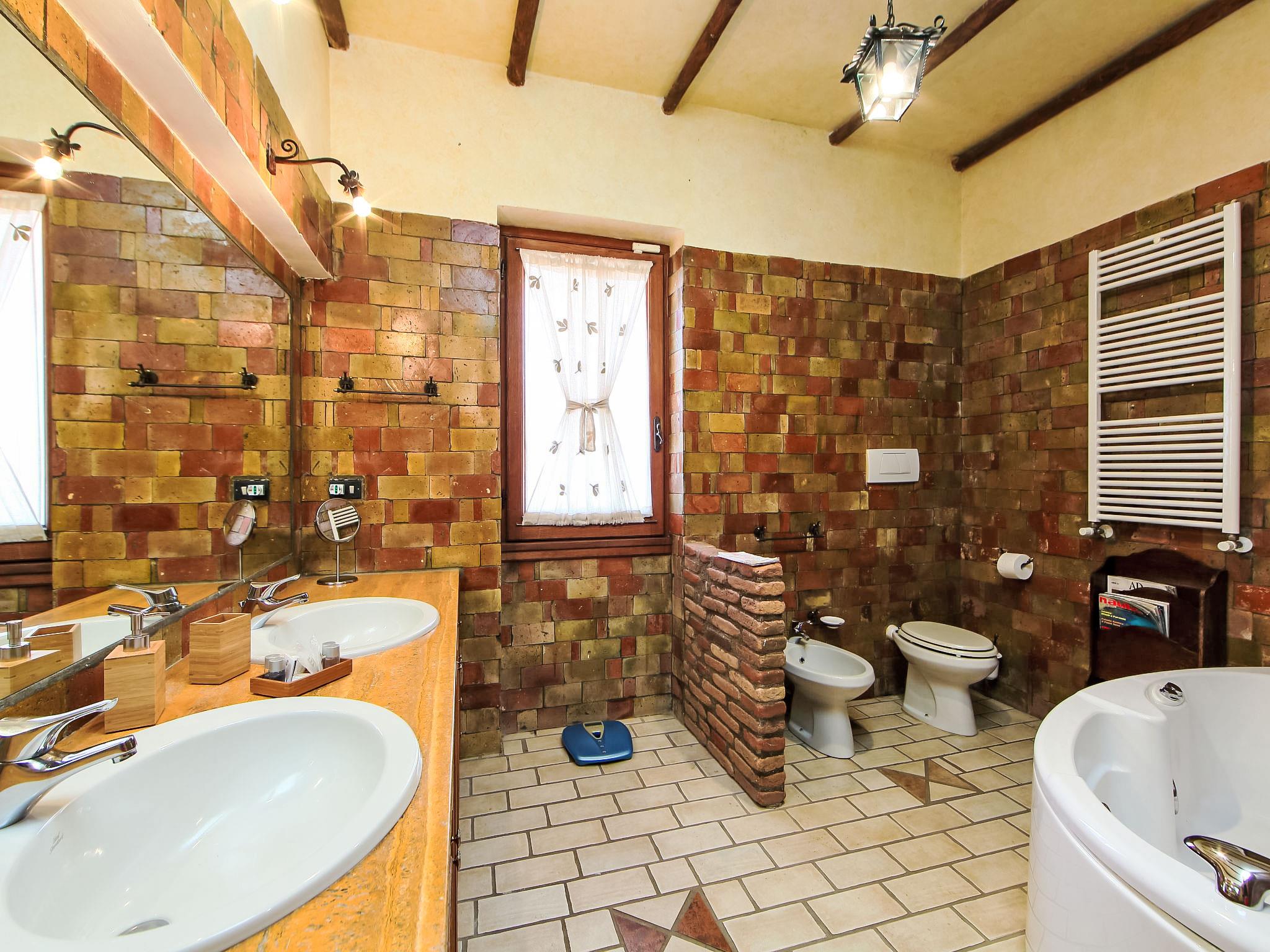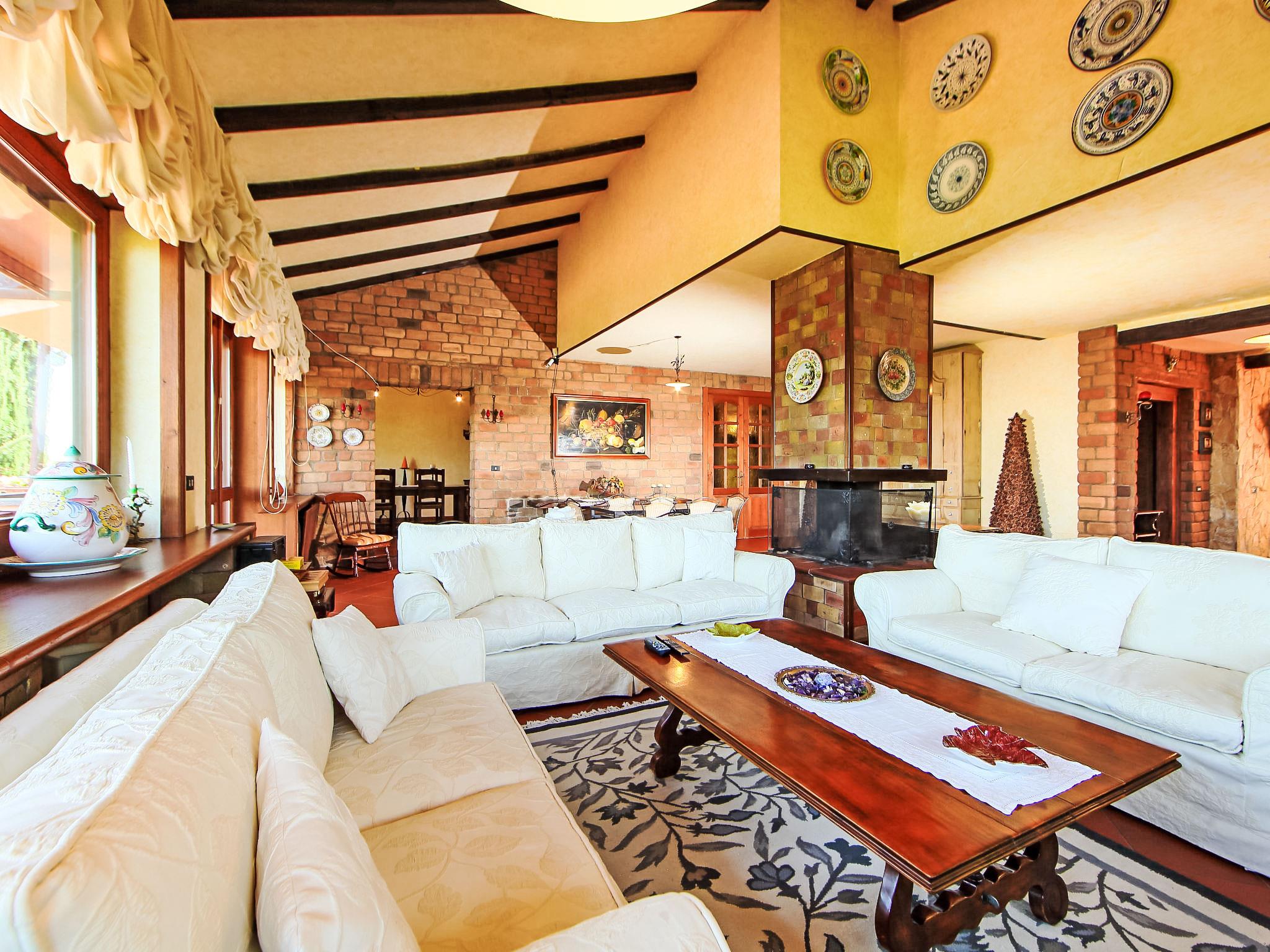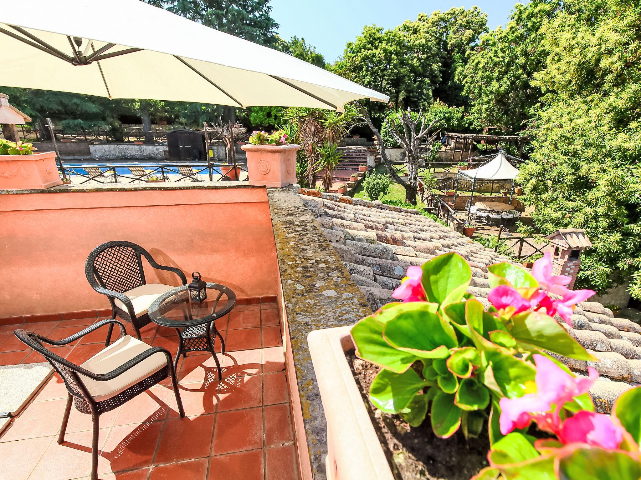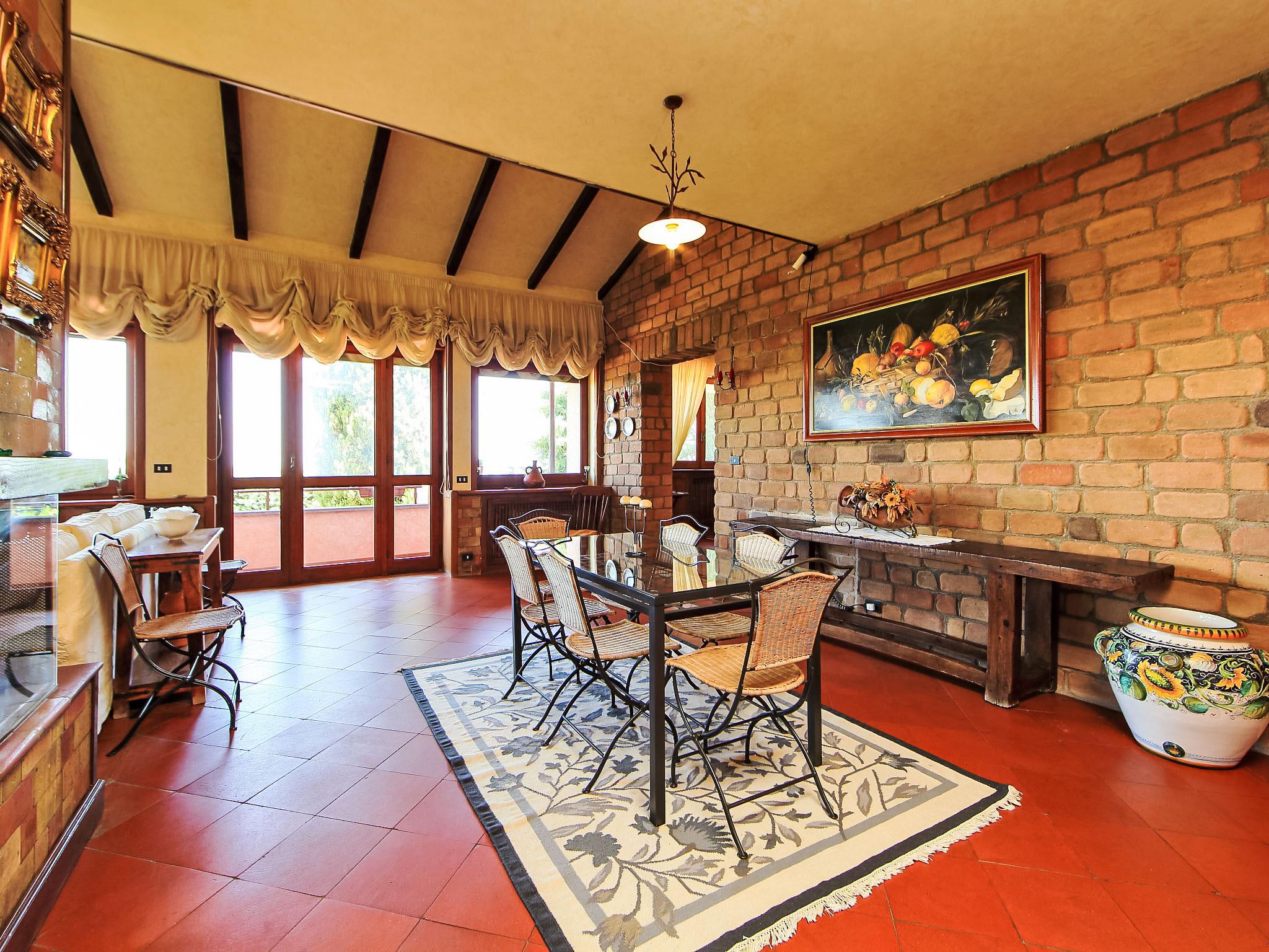 8-room villa 350 m2 on 3 levels. Spacious and bright, luxurious furnishings: large entrance hall. Open large living room with open-hearth fireplace, satellite TV, flat screen and air conditioning. Exit to the garden, to the terrace. Dining room with air conditioning. 2 rooms with sloping ceilings, each room with 1 bed (120 cm, length 190 cm), 1 french bed (140 cm, length 190 cm), air conditioning. Exit to the garden, to the terrace. 1 room with 1 double bed, bath/shower/bidet/WC, double hand-basin, hydro massage bath, TV and air conditioning. Exit to the balcony. Kitchen (6 hot plates, oven, dishwasher, toaster, kettle, microwave, freezer, electric coffee machine, Capsules for coffee machine (6) free). Exit to the garden. 2 showers/bidet/WC. Heating, air-conditioning. On the lower ground floor: large living/dining room with open-hearth fireplace, dining table, satellite TV and flat screen. Exit to the garden. Shower/bidet/WC. Upper floor: 1 large room with sloping ceilings with 1 double bed (160 cm, length 190 cm), TV (flat screen), air conditioning. Exit to the balcony. 1 room with sloping ceilings with (160 cm, length 190 cm), 1 double bed, TV, flat screen and air conditioning.) with dining table. Shower/bidet/WC. Large garden. Terrace furniture, barbecue. Very beautiful panoramic view of the countryside and Rome. Facilities: washing machine, iron, baby cot for up to 2 year olds, hair dryer. Internet (WiFi, free). Maximum 1 pet/ dog allowed. The master bathroom has a hydromassage tub. When there are less than the maximum number of guests staying at the property, not all of the bedrooms will be available for use. IT058060C2VEIARDR5