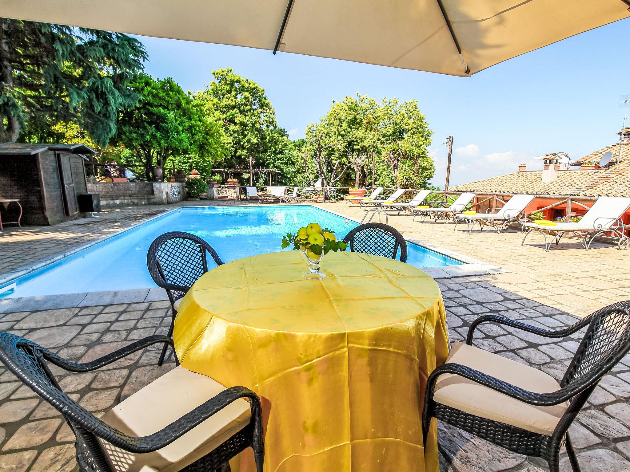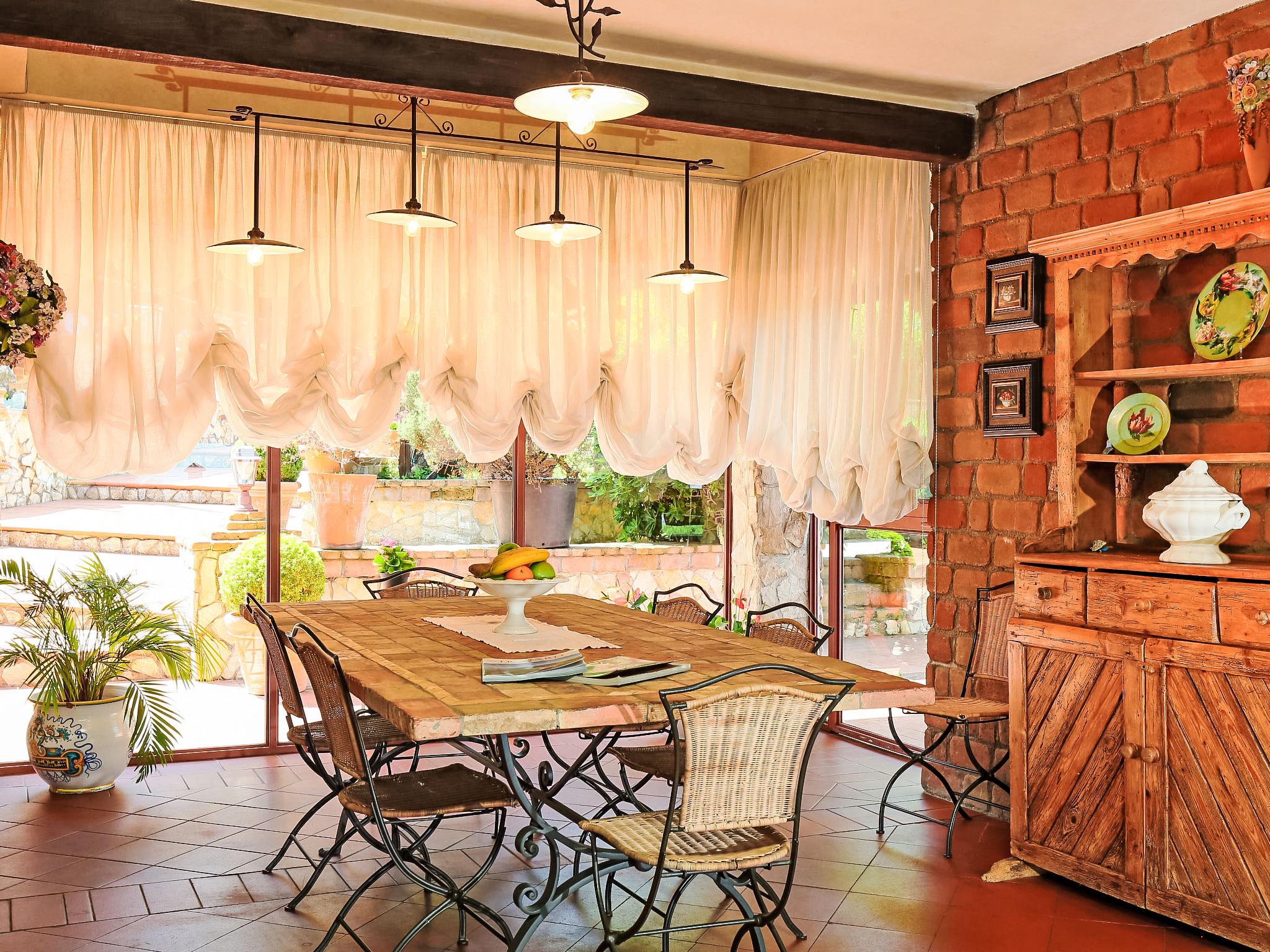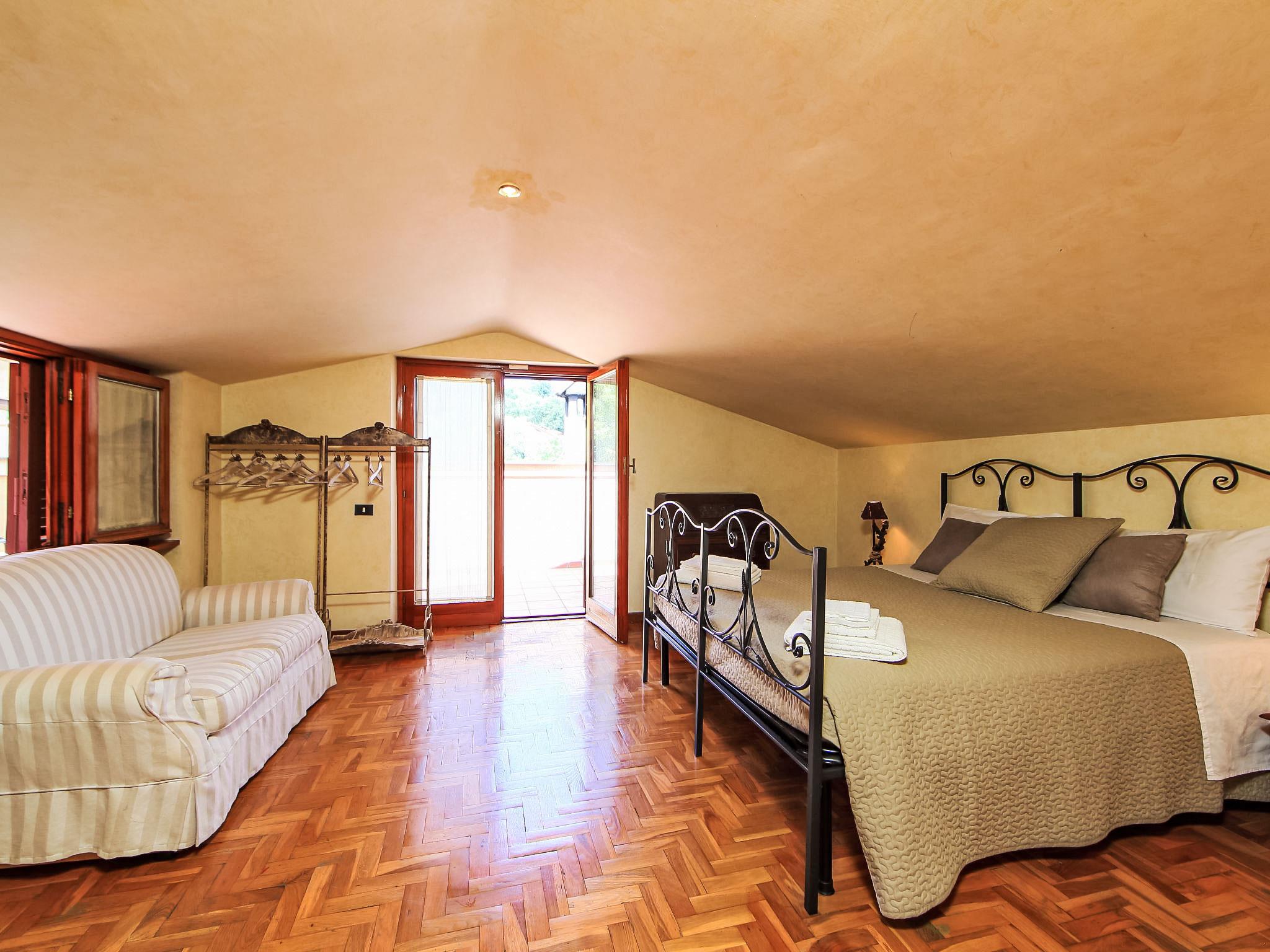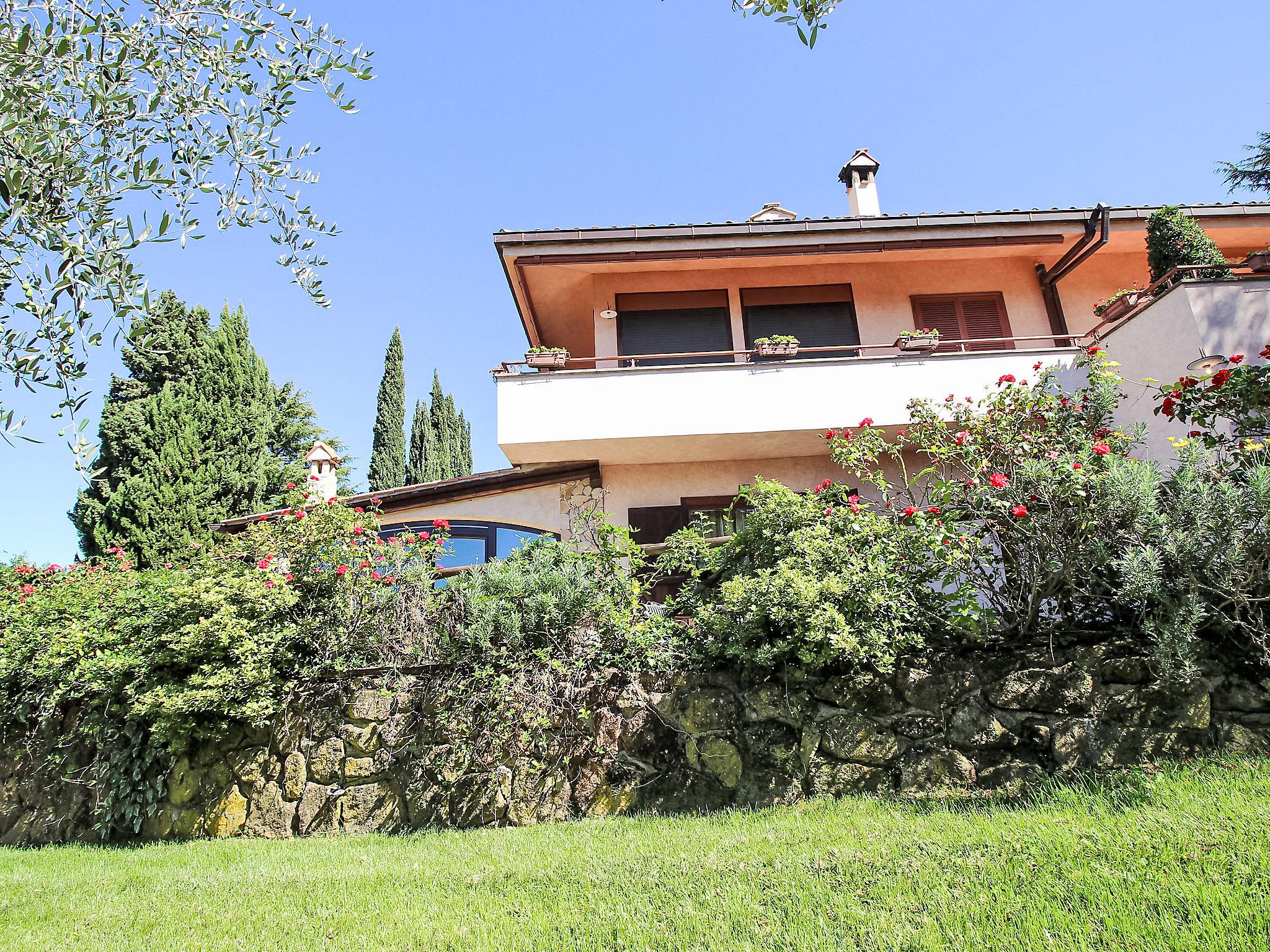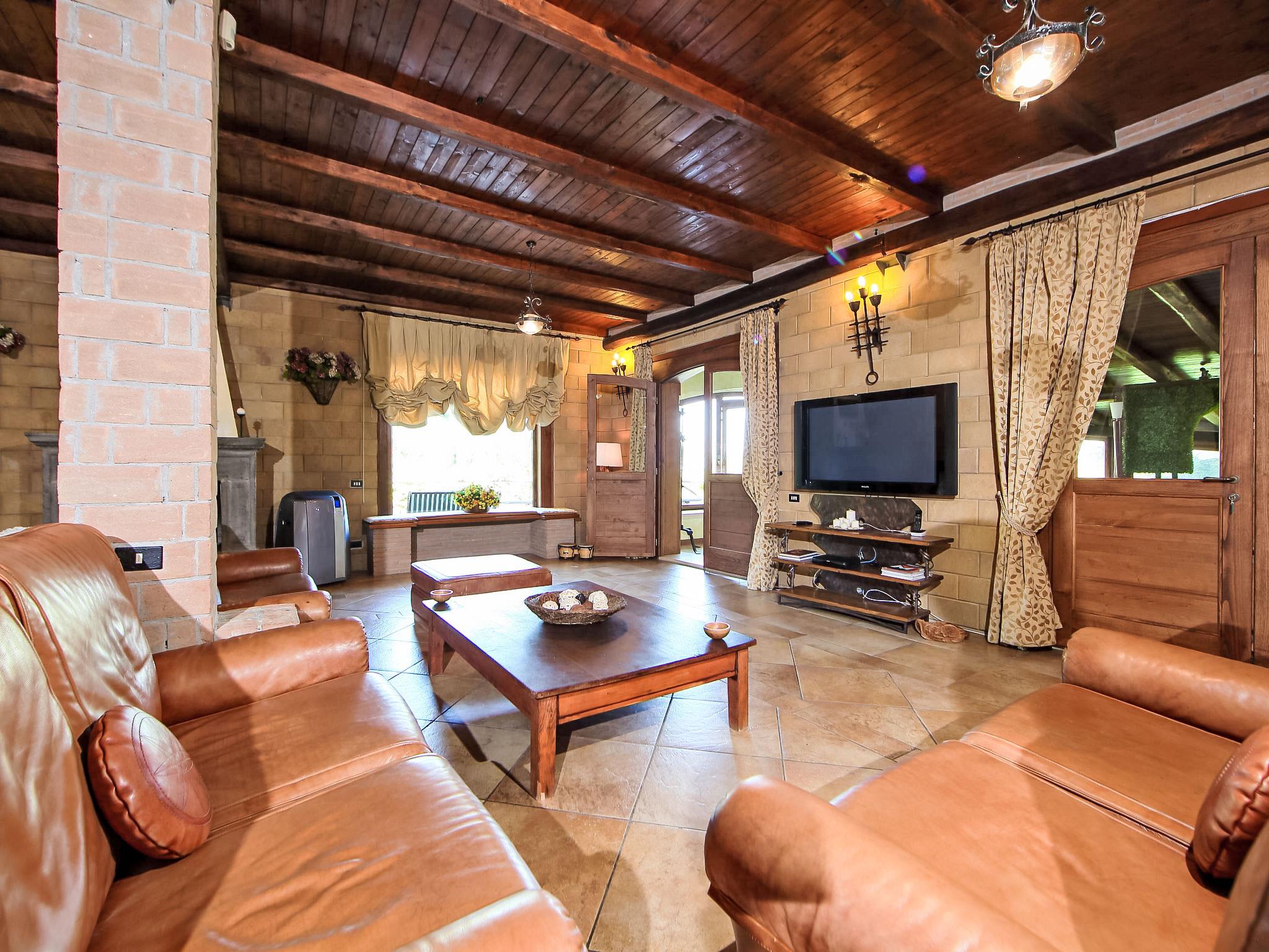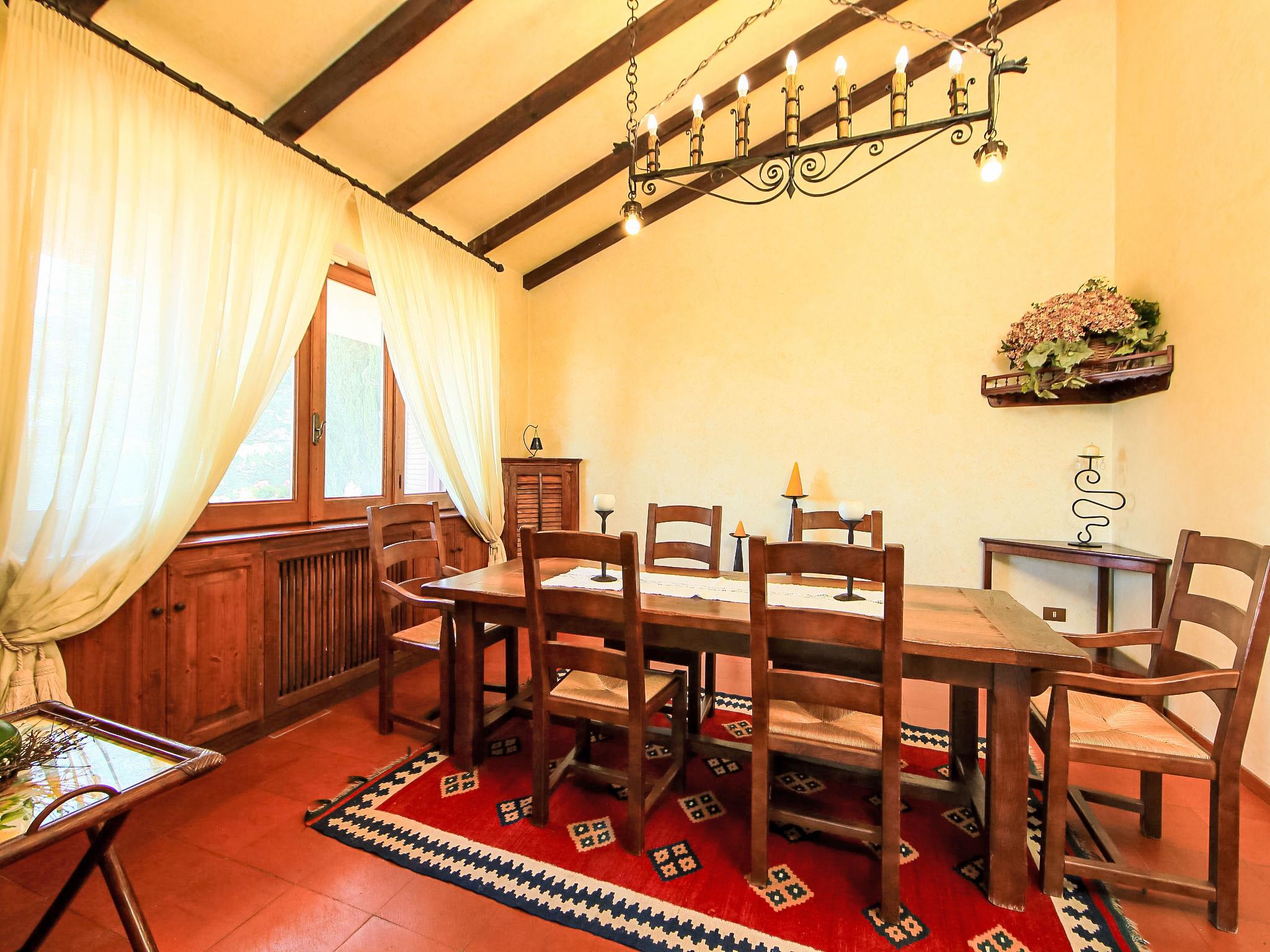 8-room villa 350 m2 on 3 levels. Spacious and bright, luxurious furnishings: large entrance hall. Open large living room with open-hearth fireplace, satellite TV, flat screen and air conditioning. Exit to the garden, to the terrace. Dining room with air conditioning. 2 rooms with sloping ceilings, each room with 1 bed (120 cm, length 190 cm), 1 french bed (140 cm, length 190 cm), air conditioning. Exit to the garden, to the terrace. 1 room with 1 double bed, bath/shower/bidet/WC, double hand-basin, hydro massage bath, TV and air conditioning. Exit to the balcony. Kitchen (6 hot plates, oven, dishwasher, toaster, kettle, microwave, freezer, electric coffee machine, Capsules for coffee machine (6) free). Exit to the garden. 2 showers/bidet/WC. Heating, air-conditioning. On the lower ground floor: large living/dining room with open-hearth fireplace, dining table, satellite TV and flat screen. Exit to the garden. Shower/bidet/WC. Upper floor: 1 large room with sloping ceilings with 1 double bed (160 cm, length 190 cm), TV (flat screen), air conditioning. Exit to the balcony. 1 room with sloping ceilings with (160 cm, length 190 cm), 1 double bed, TV, flat screen and air conditioning.) with dining table. Shower/bidet/WC. Large garden. Terrace furniture, barbecue. Very beautiful panoramic view of the countryside and Rome. Facilities: washing machine, iron, baby cot for up to 2 year olds, hair dryer. Internet (WiFi, free). Maximum 1 pet/ dog allowed. The master bathroom has a hydromassage tub. When there are less than the maximum number of guests staying at the property, not all of the bedrooms will be available for use. IT058060C2VEIARDR5