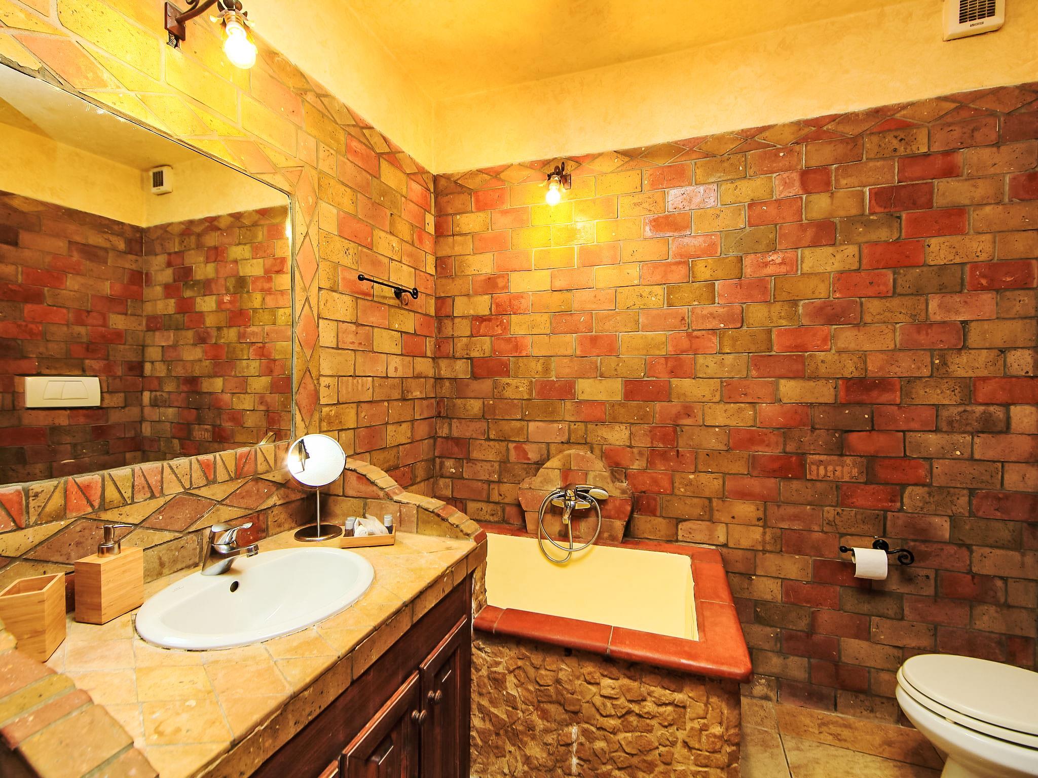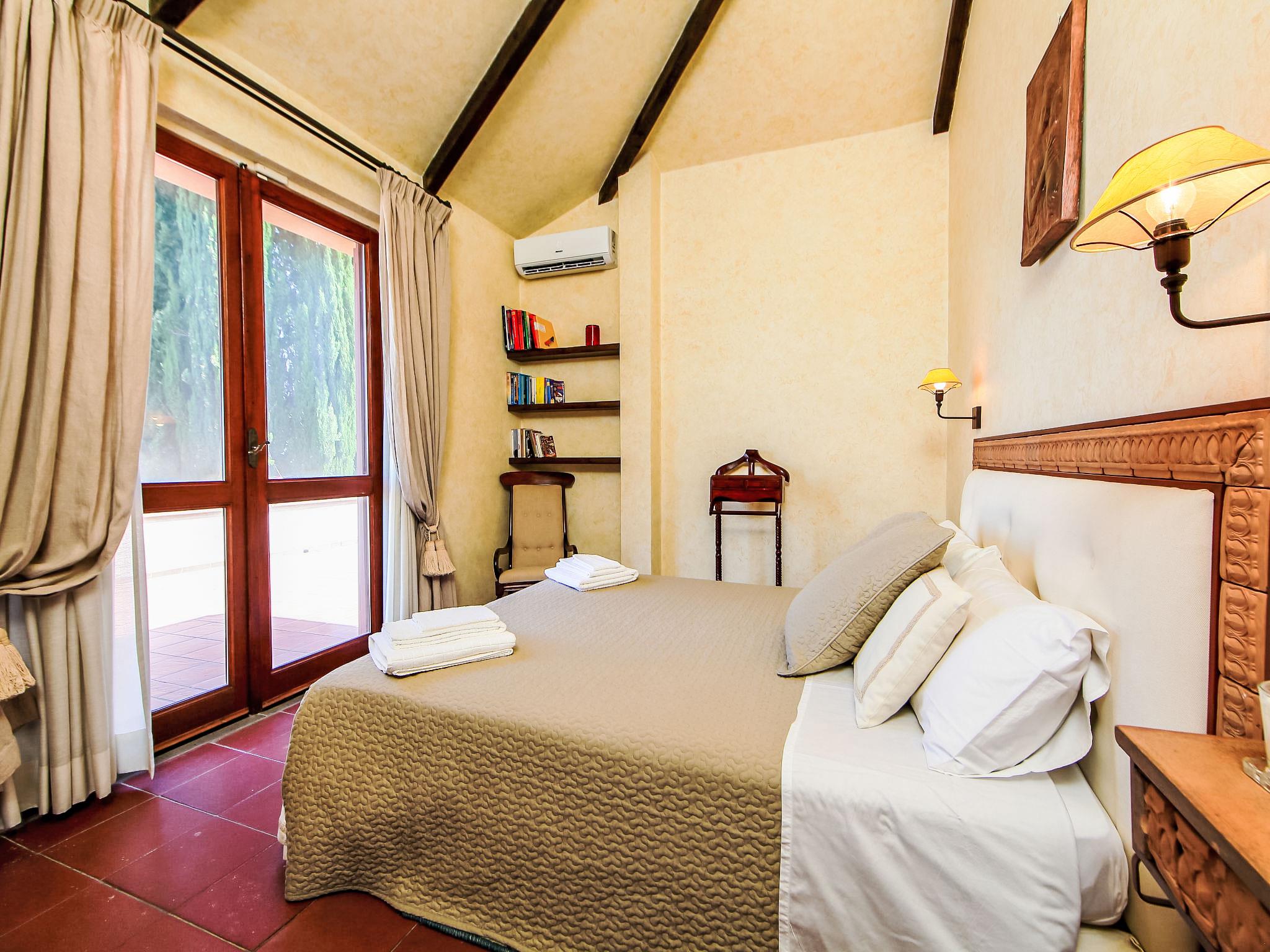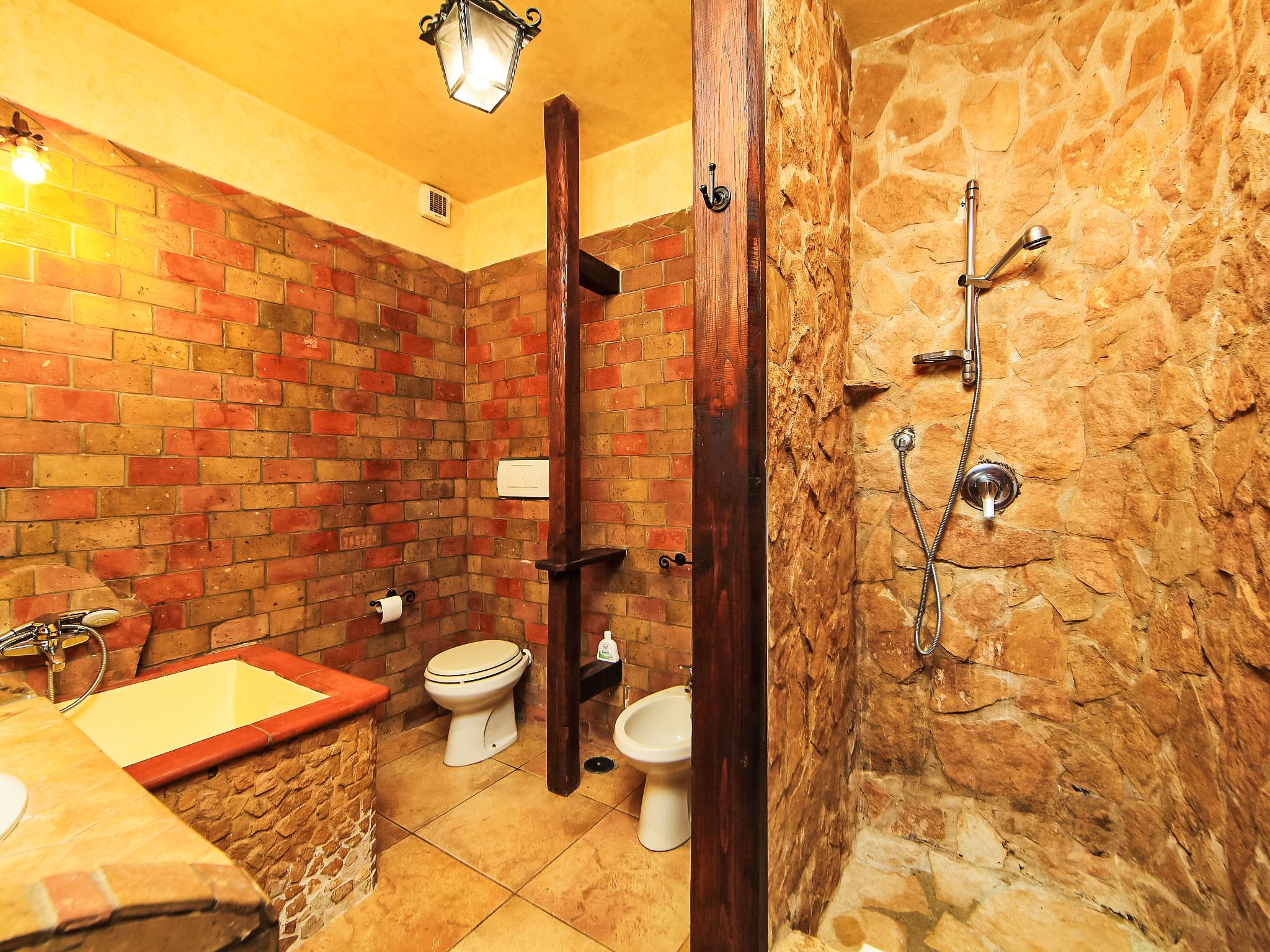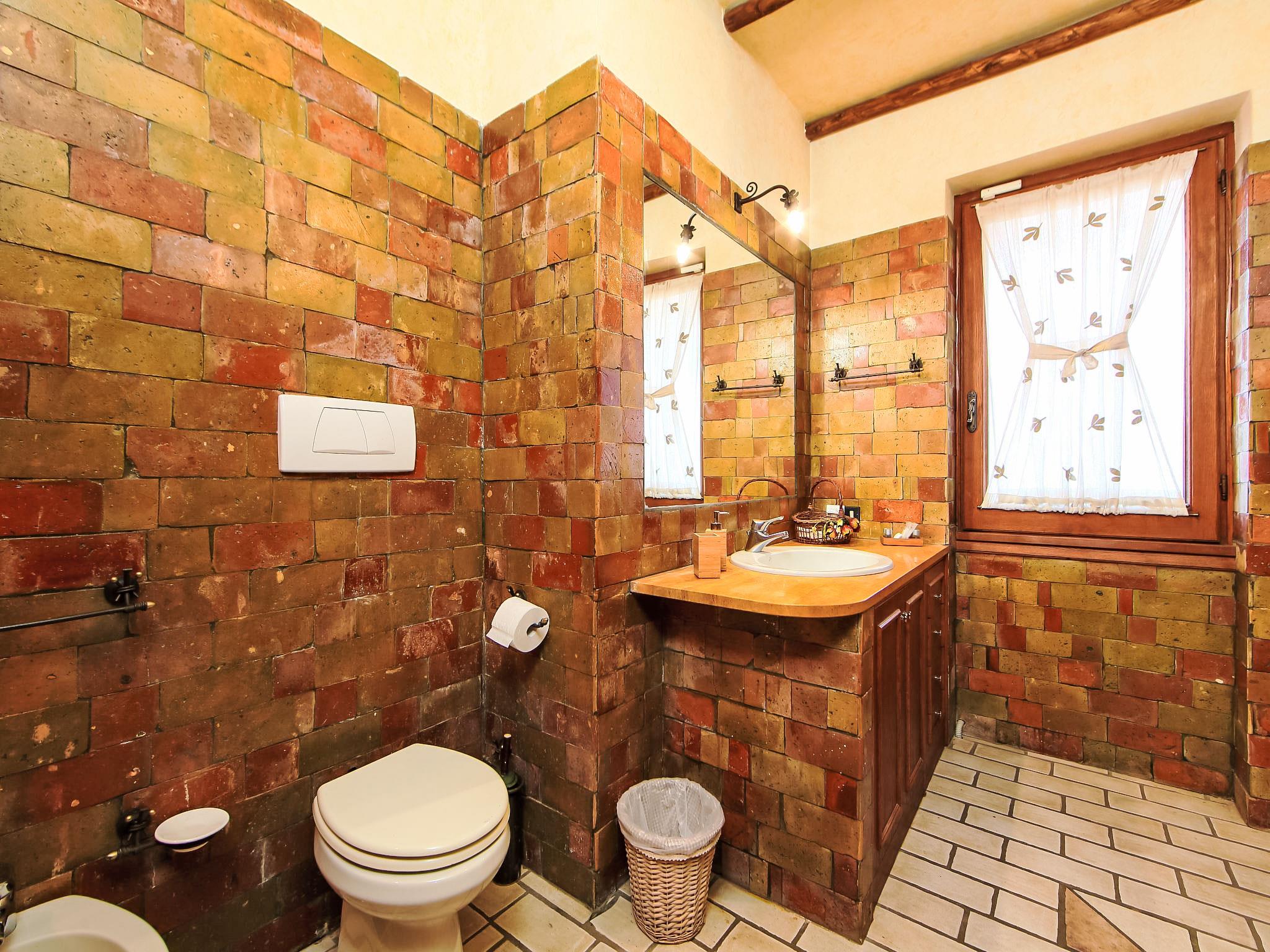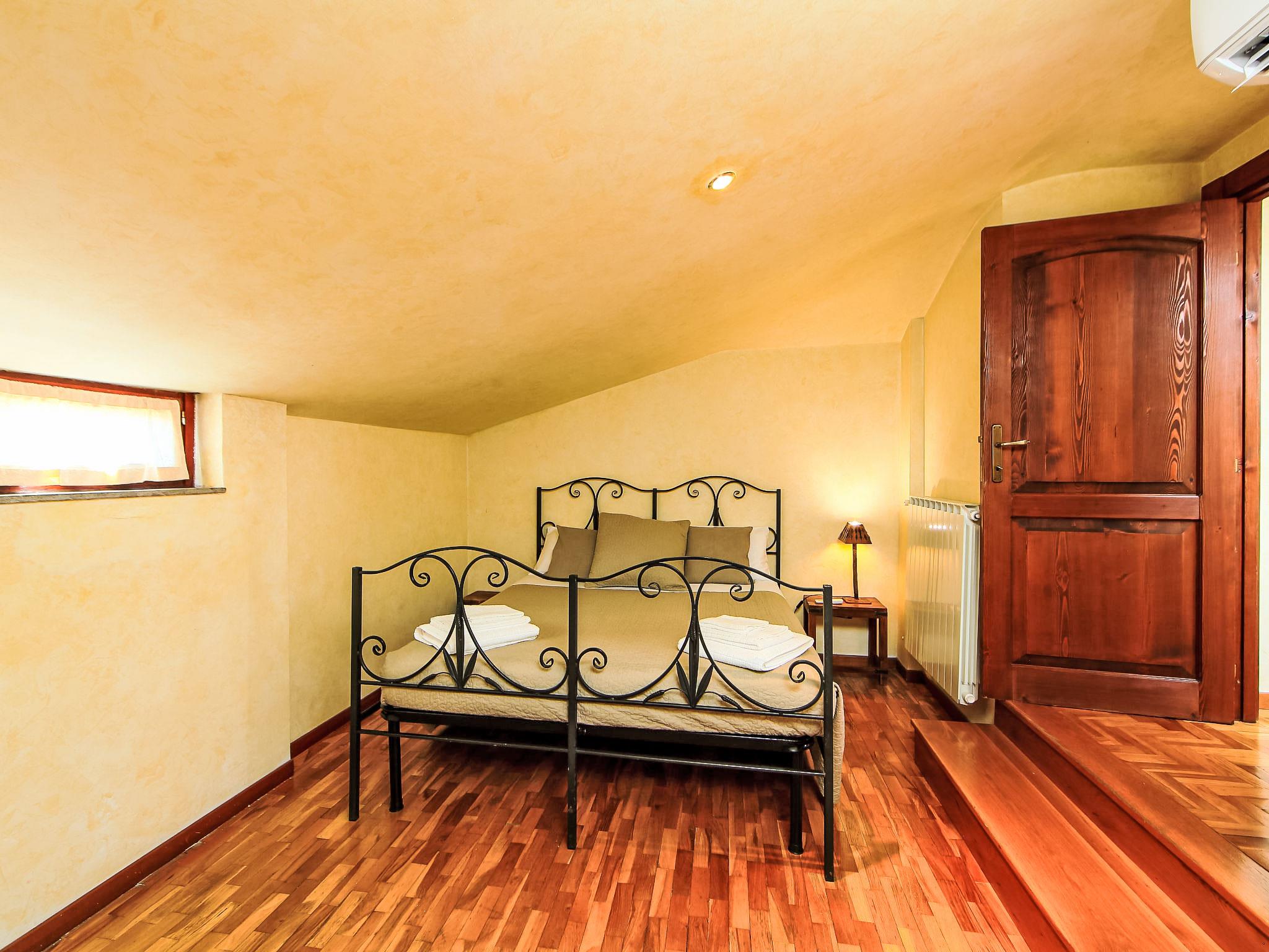 8-room villa 350 m2 on 3 levels. Spacious and bright, luxurious furnishings: large entrance hall. Open large living room with open-hearth fireplace, satellite TV, flat screen and air conditioning. Exit to the garden, to the terrace. Dining room with air conditioning. 2 rooms with sloping ceilings, each room with 1 bed (120 cm, length 190 cm), 1 french bed (140 cm, length 190 cm), air conditioning. Exit to the garden, to the terrace. 1 room with 1 double bed, bath/shower/bidet/WC, double hand-basin, hydro massage bath, TV and air conditioning. Exit to the balcony. Kitchen (6 hot plates, oven, dishwasher, toaster, kettle, microwave, freezer, electric coffee machine, Capsules for coffee machine (6) free). Exit to the garden. 2 showers/bidet/WC. Heating, air-conditioning. On the lower ground floor: large living/dining room with open-hearth fireplace, dining table, satellite TV and flat screen. Exit to the garden. Shower/bidet/WC. Upper floor: 1 large room with sloping ceilings with 1 double bed (160 cm, length 190 cm), TV (flat screen), air conditioning. Exit to the balcony. 1 room with sloping ceilings with (160 cm, length 190 cm), 1 double bed, TV, flat screen and air conditioning.) with dining table. Shower/bidet/WC. Large garden. Terrace furniture, barbecue. Very beautiful panoramic view of the countryside and Rome. Facilities: washing machine, iron, baby cot for up to 2 year olds, hair dryer. Internet (WiFi, free). Maximum 1 pet/ dog allowed. The master bathroom has a hydromassage tub. When there are less than the maximum number of guests staying at the property, not all of the bedrooms will be available for use. IT058060C2VEIARDR5