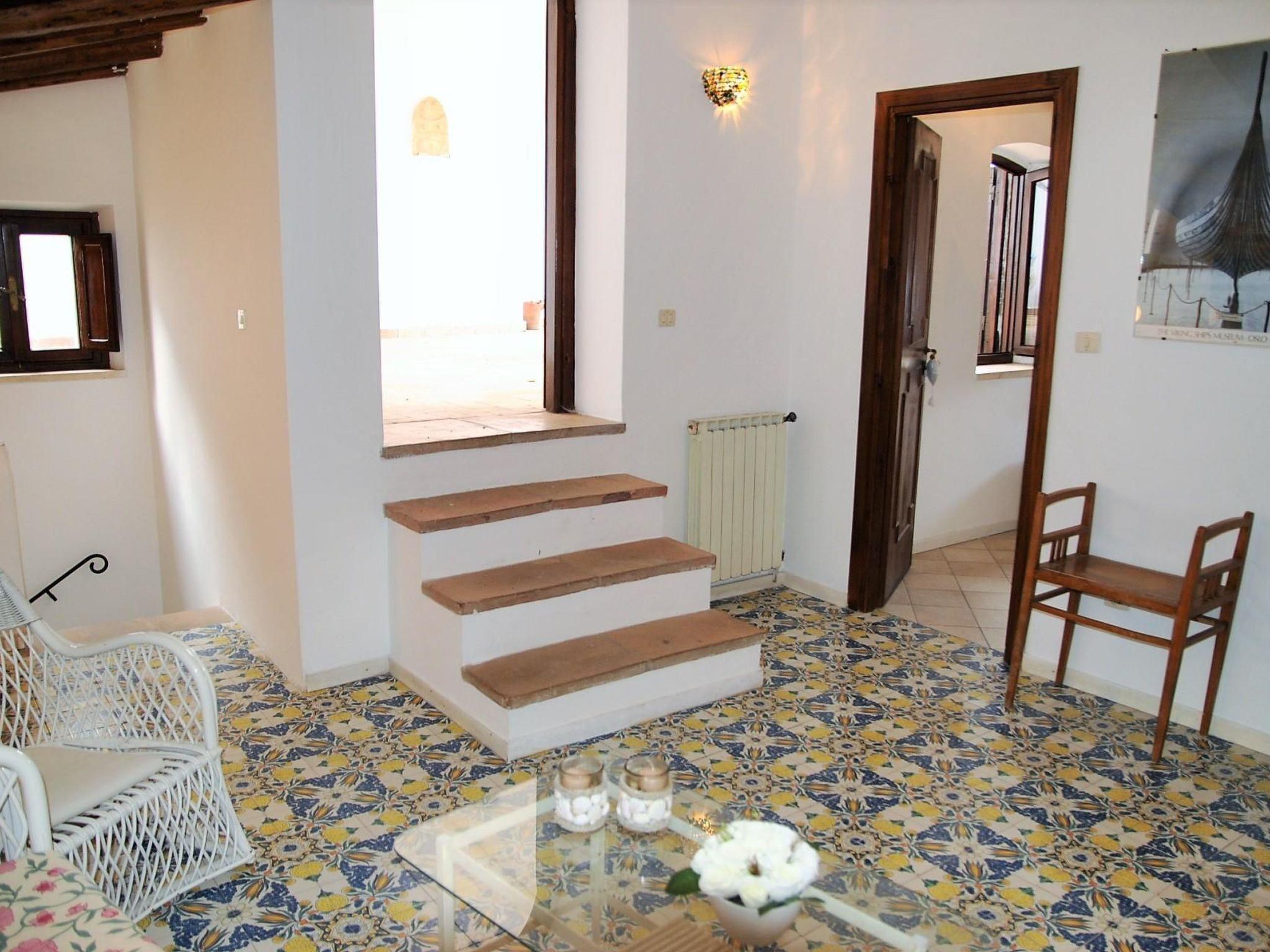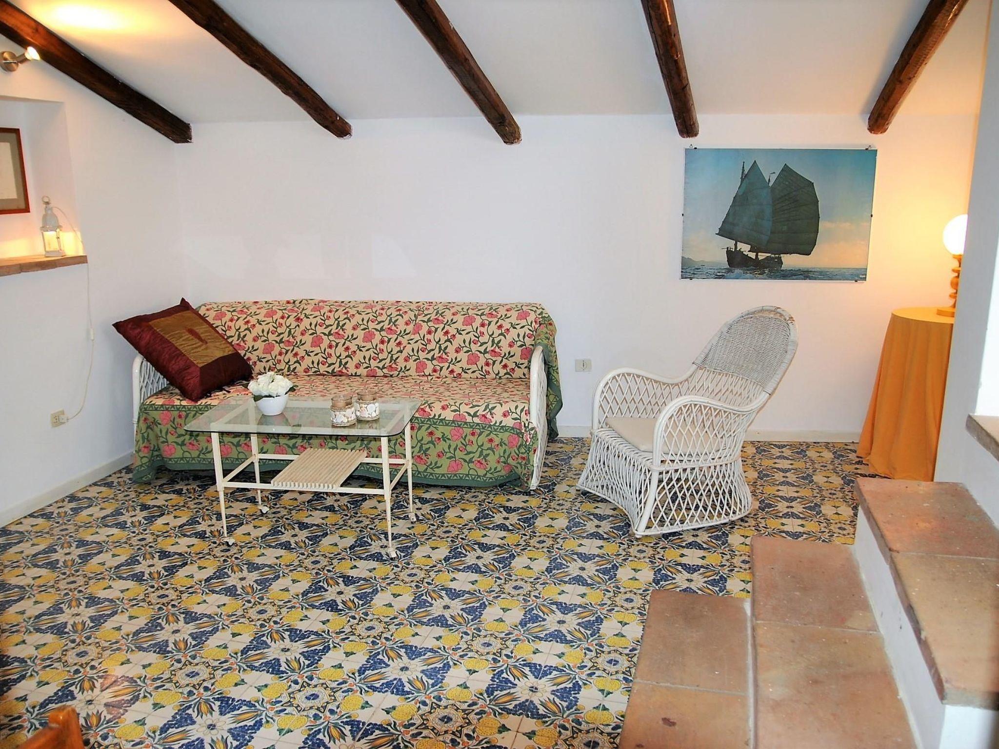 The flat is on two levels: from the street level you go up to the first level composed of living room with sofa bed and TV, dining area, small equipped kitchen, large double bedroom and 2 bathrooms with shower. On the upper floor living area with sofa, double bedroom and bathroom with hydro-massage shower. Large terrace, partly covered, equipped with tables, chairs and outdoor sink. With wood-beamed ceilings and vietri ceramic floors, the flat is particularly suitable for guests who appreciate the charm of historic residences, accompanied by an exceptional view of monuments and landscape and a comfortable set of amenities. In fact, the house is equipped with a television, washing machine, dishwasher, refrigerator, hob, oven and air conditioning in the living area. Small animals are allowed on request. The flat is suitable for a family of up to 7 persons.