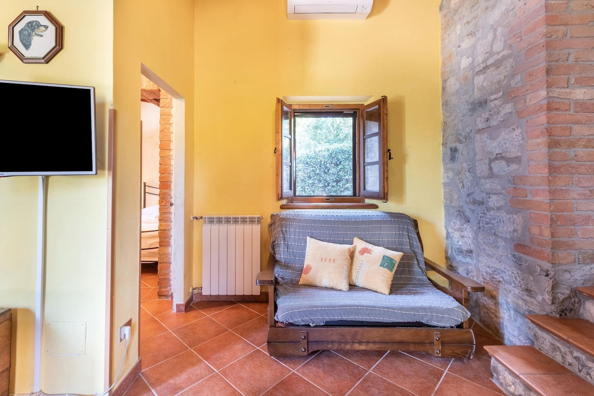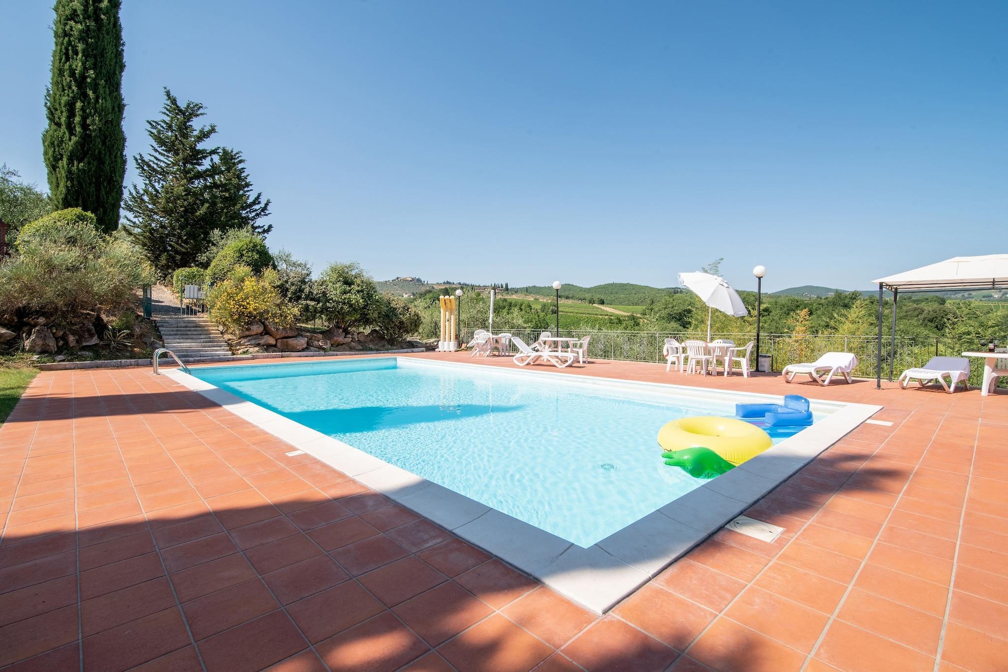 Ferie i hjertet af Chianti Classico i Gaiole in Chianti. Autentisk og charmerende feriehus omgivet af en have, hvor udsigten fortaber sig i bølgende bakker dækket af rækker af vinstokke og oliventræer. _x000D_ _x000D_ Indånd duften af træet, der er rigt på stenege, enebær og eg. Oplev de smukkeste kunstbyer og historiske landsbyer i Toscana: Gaiole in Chianti (15 km), Radda in Chianti (20 km), Castellina in Chianti (27 km), Panzano (30 km. ); Monteriggioni (33 km), Siena (20 km), San Gimignano (55 km), Firenze (80 km), Arezzo (70 km). Ejeren vil måske give dig en rundvisning, hvor du kan smage den himmelske vin._x000D_ _x000D_ En fortryllende udsigt over slottet Brolio er en fryd fra poolen. Udenfor er der en stor terrasse udstyret til at spise frokost med din familie og venner. Stuehuset ender med en del af et rækkehus beboet af en reserveret familie, der ikke vil invadere dit privatliv. Børn, kæledyr er velkomne, og gratis Wi-Fi sikrer jævn surfing og mulighed for at arbejde eksternt.