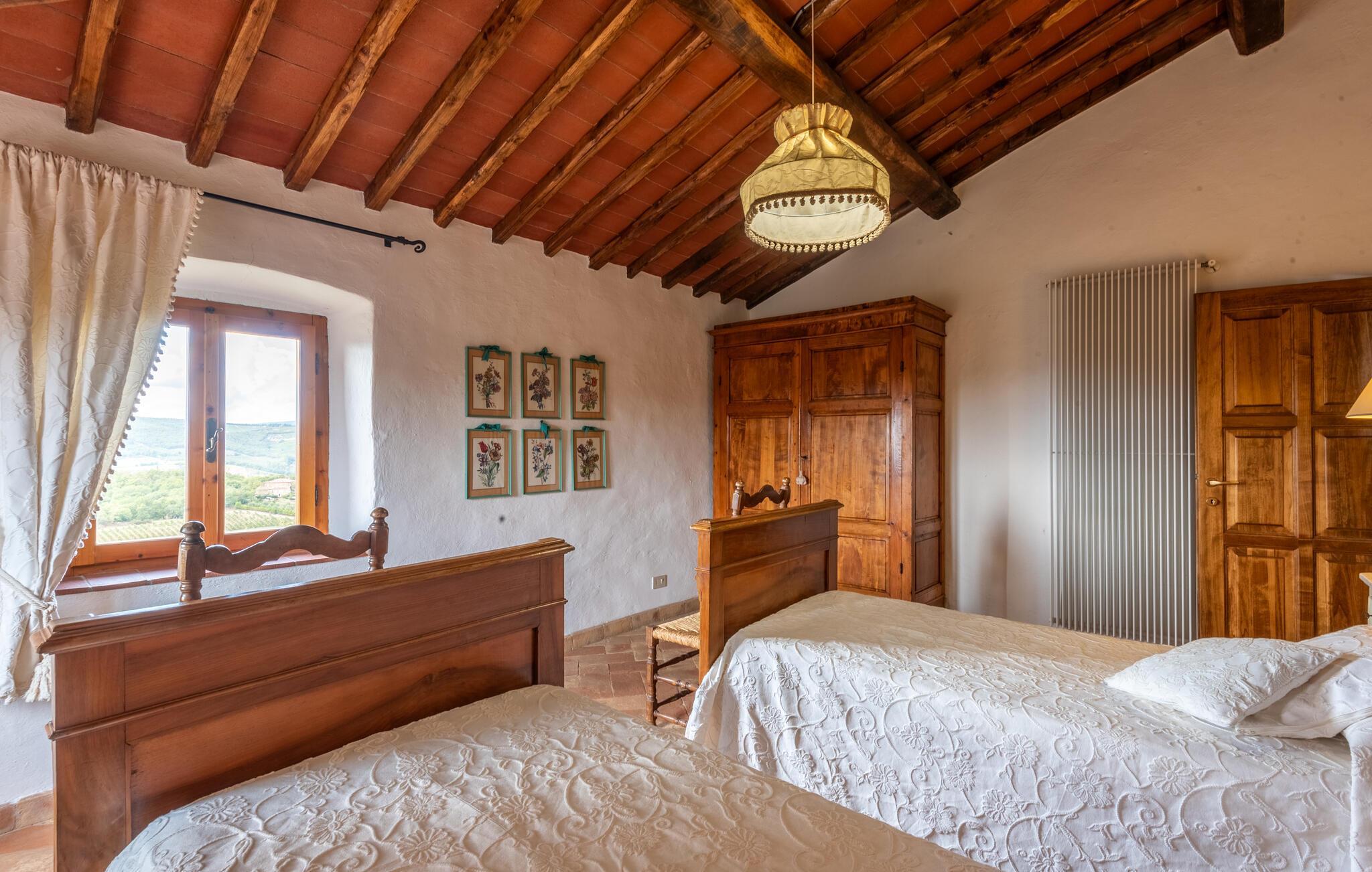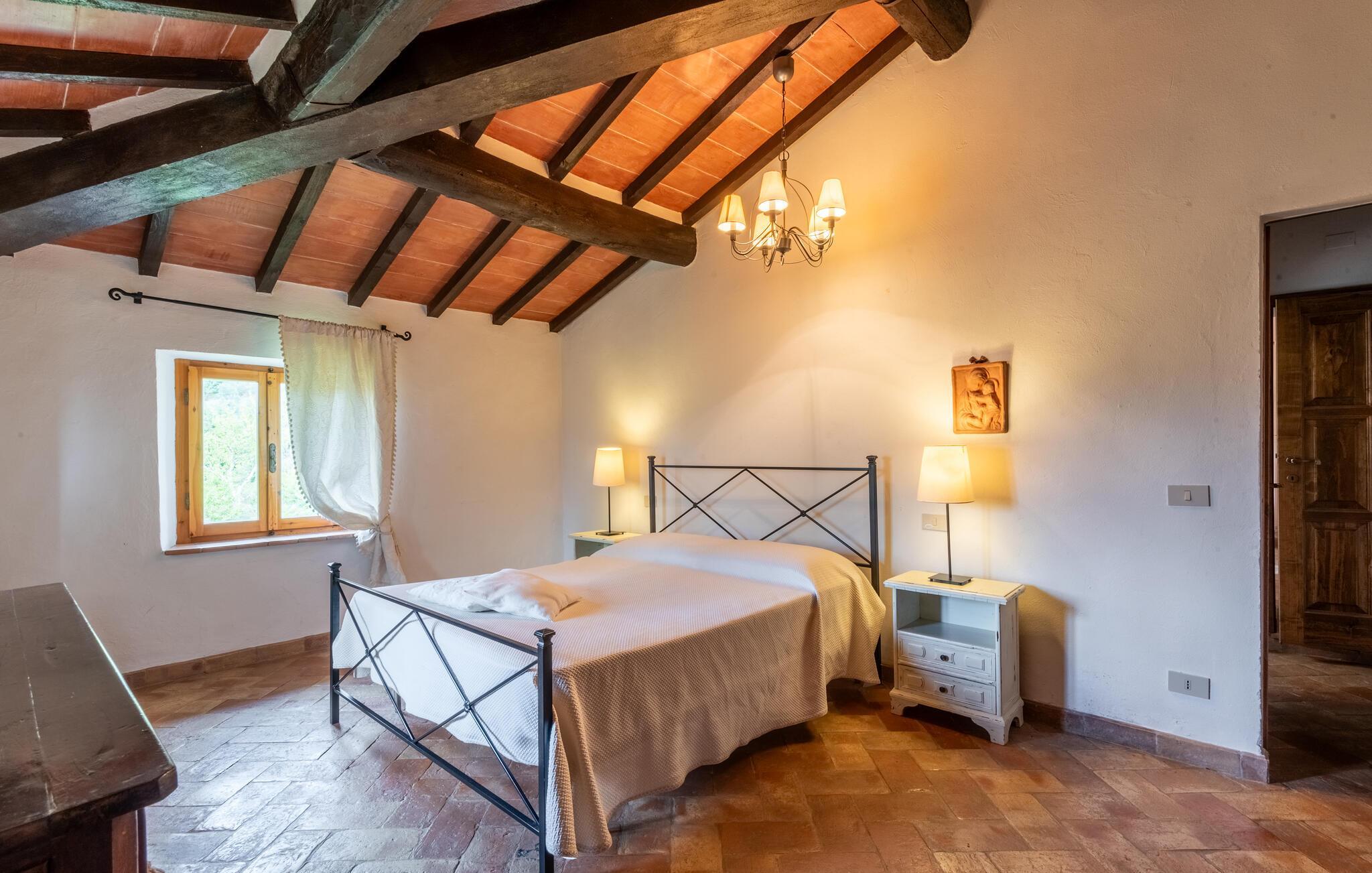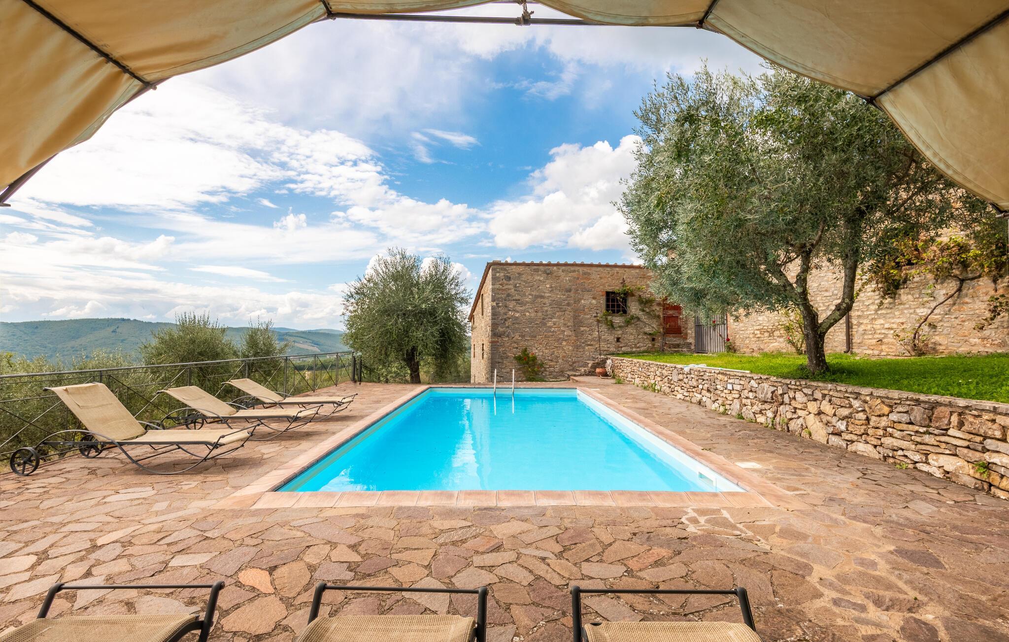 Smuk fritliggende feriehus af sten med privat pool, husets oprindelse går tilbage til år 1500, der ligger i Chianti Classicos bløde bakker i ugenerte omgivelser med udsigt over dalen, vinmarker og olivenlunde i nærheden af landsbyen Gaiole. Denne typiske ejendom ligger i et af de mest eksklusive områder i Chianti Classico. Fra huset, der ligger på en bakke, er der en smuk panoramaudsigt og det er hyggeligt indrettet i typisk toskansk stil. Det ligger på en stor grund, hvor der er legeplads, volleyballnet, basketball og petanquekugler. Lad jer betage af den enestående udsigt når I slapper af i haven og svømmer i den udendørs swimmingpool. Der et anneks i haven med bord, stole og grill. Perfekt til interessante udflugter: Gaiole in Chianti 2 km, Radda in Chianti 11 km, Greve 29 km, Siena 33 km, Firenze 68 km, San Gimignano 56 km, Volterra 77 km, Terme di Rapolano 43 km, og Bagnaiagolfen 50 km. Der er kun 11 km til vinslottet Brolio i hvis kældre, det er muligt at smage gode vine. Chianti er berømt for både landskabet og områdets udsøgte vine er kendt verden over.