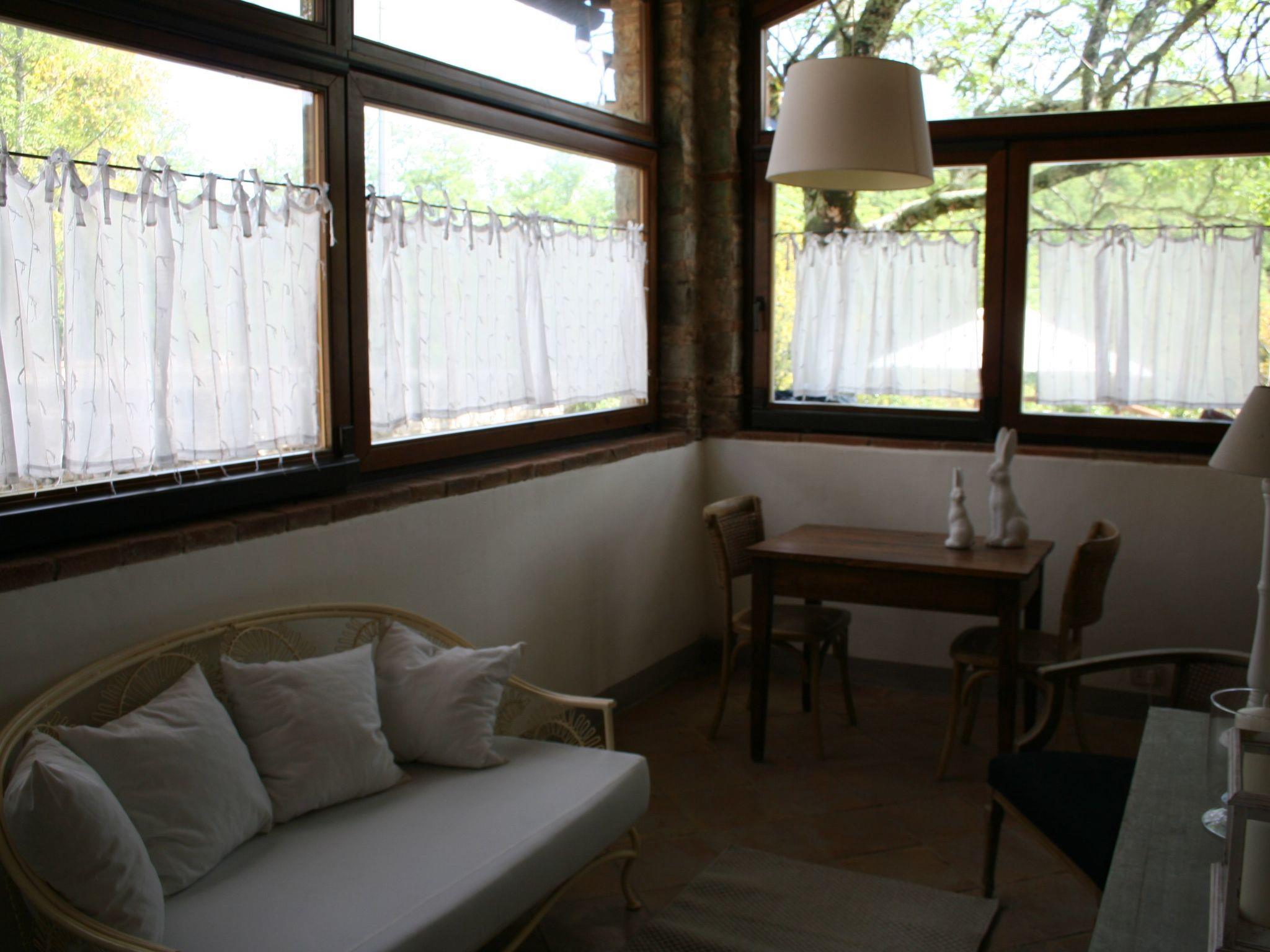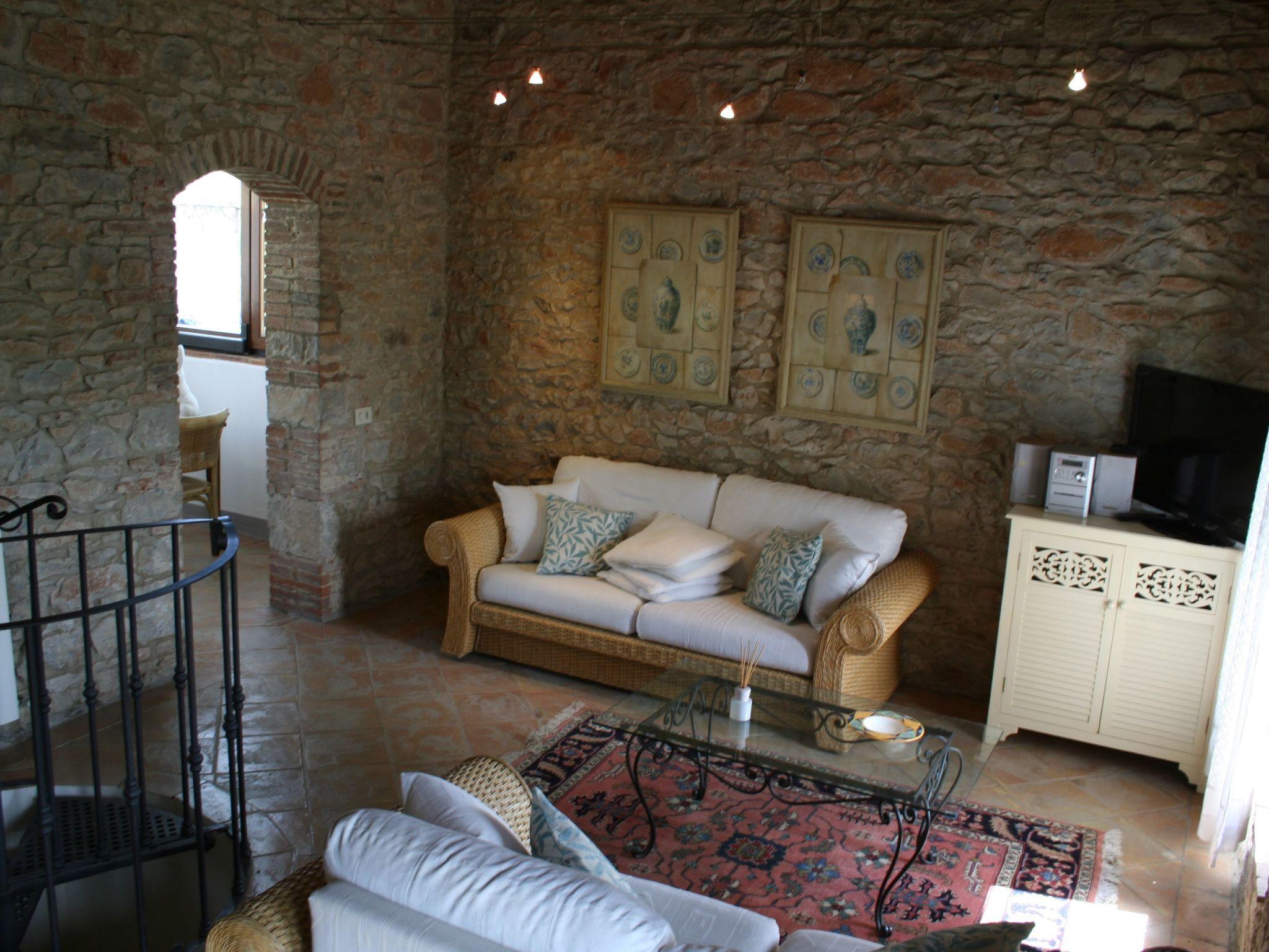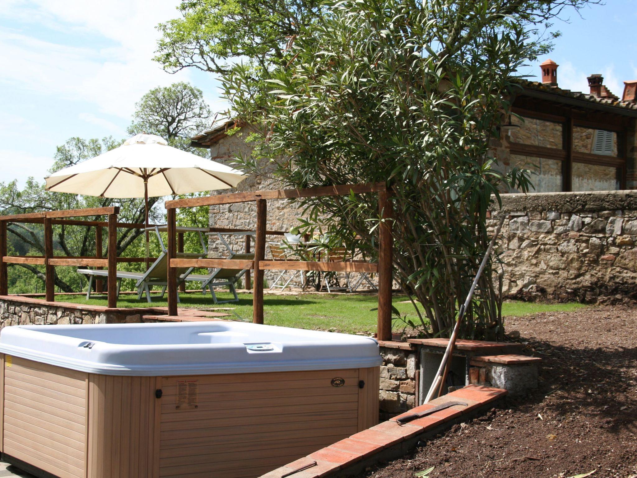 The impressive design continues outside. The sloping property allows direct access from both the ground floor and the first floor. A terrace, offering picturesque views of the Chianti hills and furnished with a table and two sun loungers, invites you to relax. A highlight is the outdoor hot tub, an attractive alternative to traditional small pools. Guests also have exclusive use of a private 5-meter diameter pool.