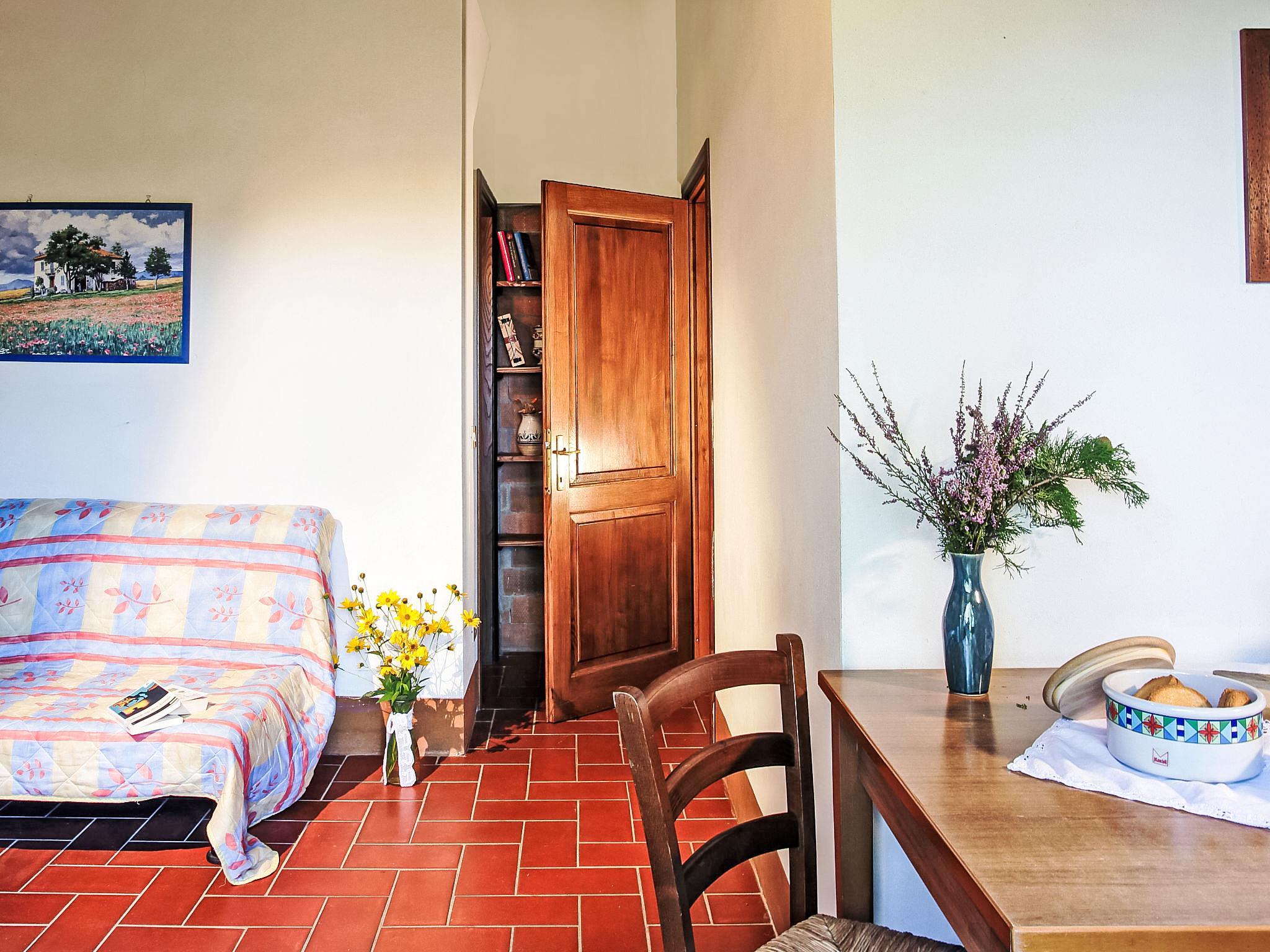 Carefully renovated "Podere La Massa" consists of a detached house and 8 apartments. It is surrounded by olive groves, fields and it enjoys a wonderful view over the Chianti hills. It is a very quiet position, ideal for nature lovers to enjoy walks or bicycle runs in the surroundings area. Each apartment has its private outdoor area fenced by hedges. A few kilometres away there are the Castello di Brolio (18 km), Meleto (14 km), Vertine (12 km) and Badia a Coltibuono and Spaltenna. Volley ball court and mini-football pitch. Children playground. Rustic, simple large working farm "La Massa". 10 km from the centre of Gaiole in Chianti, 13.5 km from the centre of Radda in Chianti, 43 km from the centre of Siena, in a secluded, quiet, elevated position, in the countryside. For shared use: natural garden 2 ha, swimming pool (14 x 7 m, depth 100 - 250 cm, seasonal availability: 03.May. - 27.Sep.). Outdoor shower, volleyball court, garden furniture, children's playground (slide). In the complex: WiFi, central heating system, washing machine (for shared use), heating to be paid on the spot, heating available only from 01.Nov. - 07.Apr.. Bread roll service on request. Motor access to the house (4 km via unmade road). Parking at the house. Shop 5 km, restaurant 5 km, bus stop 7.5 km, railway station "Montevarchi" 10 km, thermal baths "Rapolano Terme" 45 km. Nearby attractions: Castelnuovo Berardenga 19 km, Castellina in Chianti 24 km, Greve in Chianti, San Donato 30 km, Badia a Passignano 34 km, San Gimignano 52 km, Firenze 65 km. Please note: car recommended. Local sale of farm products.