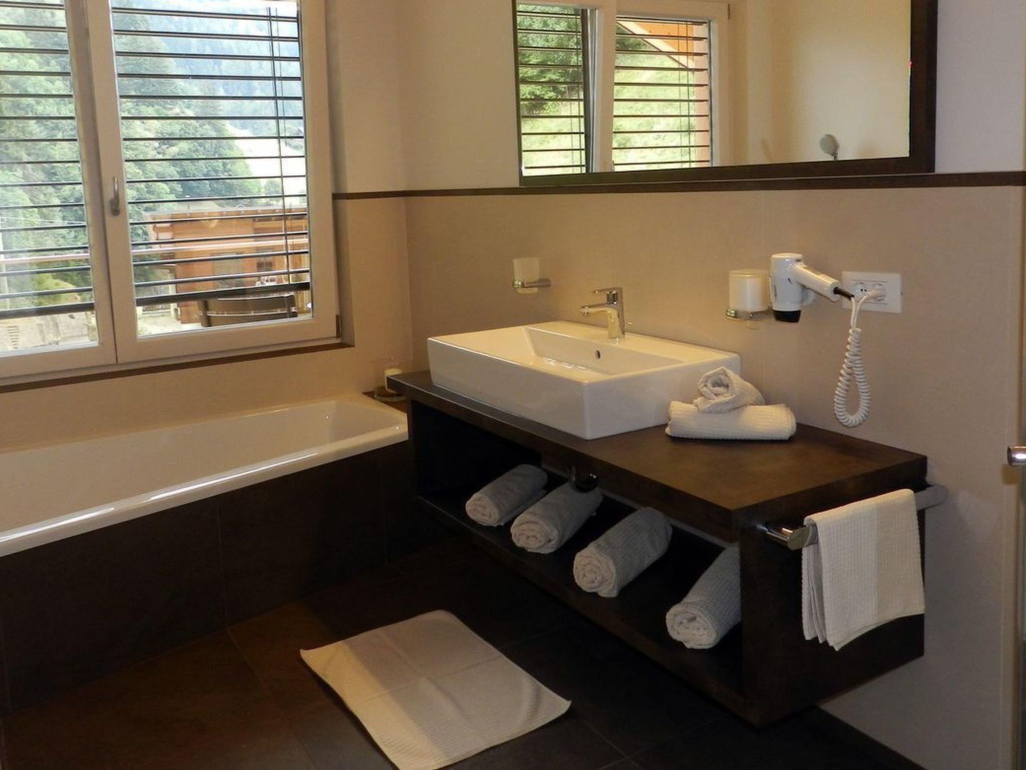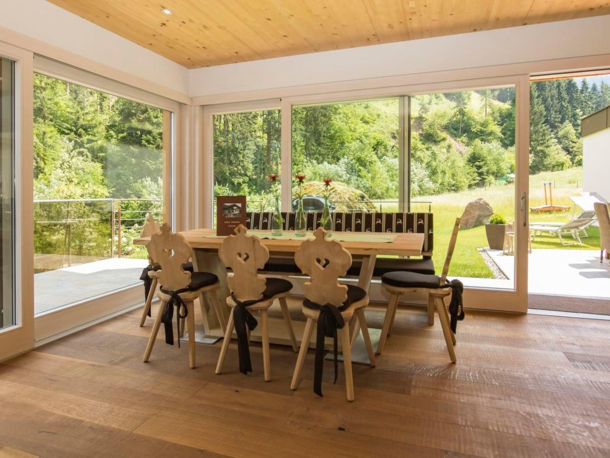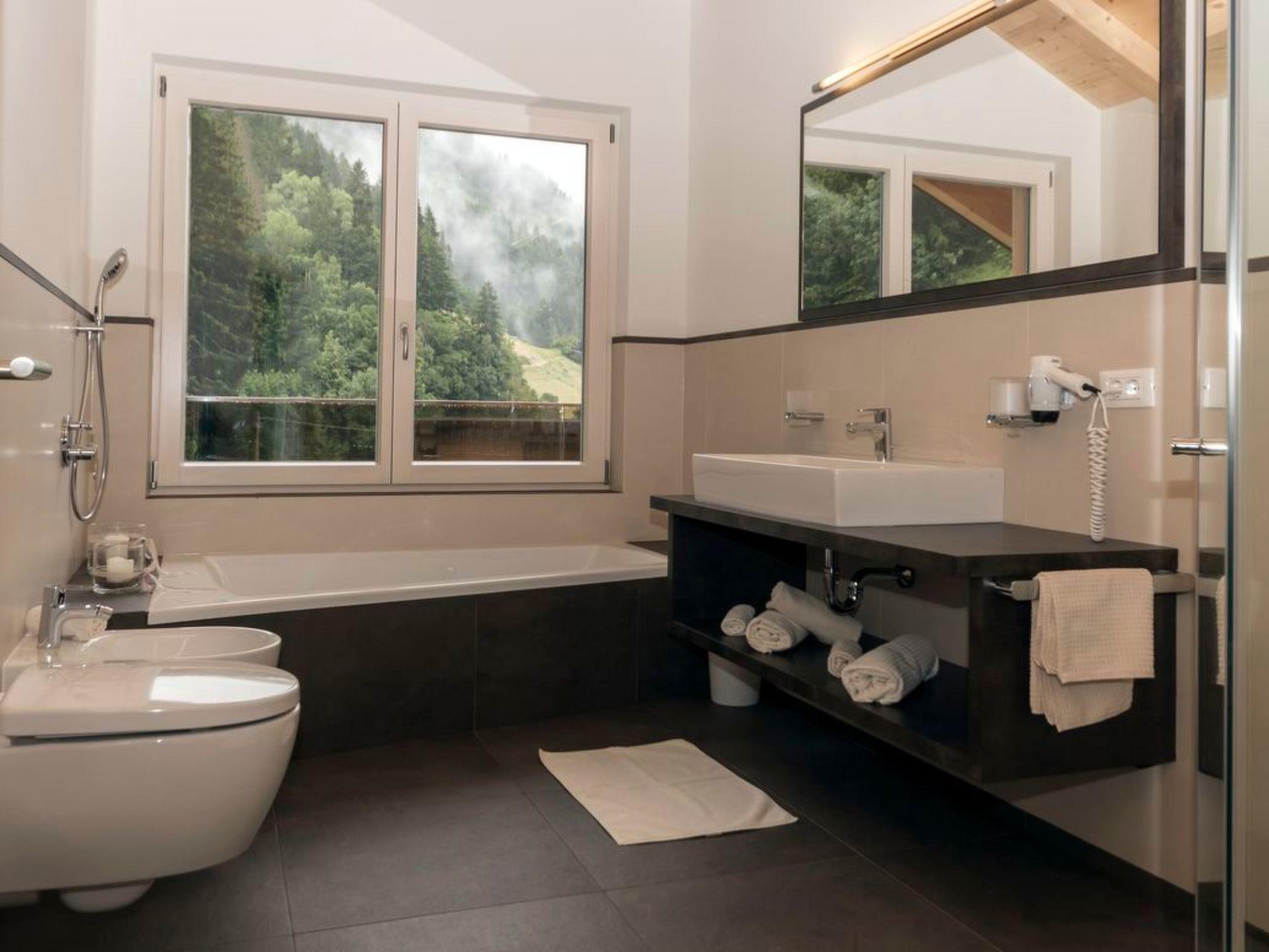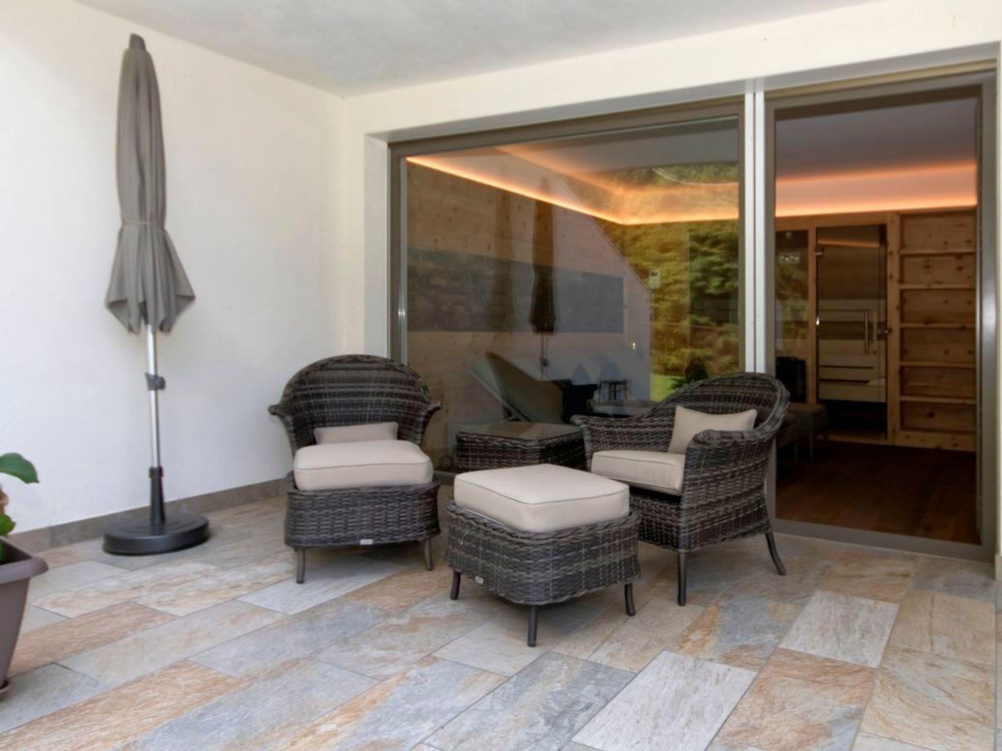 The owners have decided to build this new chalet in a natural and sustainable way, and the chalet and furnishings have been created with great attention to detail, tradition and a touch of luxury. The chalet offers enough space for up to eight people, making it an ideal place to spend your holiday with the whole family or with friends. Built in 2015, the holiday home has a living space of 170 m². On the ground floor, you will find a light-flooded communal area consisting of a comfortable living room, a cosy dining area and a modern cooking area. There is also a guest WC and a cloakroom, from where the staircase branches off to the upper floor. The upper floor includes a hallway from where the three double bedrooms and two bathrooms are individually accessible. In the basement you will find a small wellness area and a laundry room with washing machine and tumble dryer. The three bedrooms are each furnished with an indirectly lit, comfortable double bed with a width of 200 cm and are approx. 1.60 m below the sloping roof at the lowest point. Each bedroom has a wardrobe, a desk and a flat-screen TV with satellite channels. While one bathroom is designed as a full bathroom with shower cubicle, bathtub and bidet, the second bathroom has a shower. Both bathrooms have a WC. The open-plan kitchen with its spacious cooking island invites you to cook together: The gas hob and raised oven are a dream for amateur chefs. A dishwasher, a fridge with freezer compartment and the usual small electrical appliances are of course also available. Take a seat at the solid dining table on a bench and four traditionally designed wooden chairs. During your meal, you can enjoy a far-reaching view of the natural surroundings through the floor-to-ceiling, almost continuous glass front. Past the wood-burning stove, which provides cosy warmth in winter, you reach the living area, where you can relax together on a corner sofa after a day out. A sauna and relaxation loungers await you in the basement.