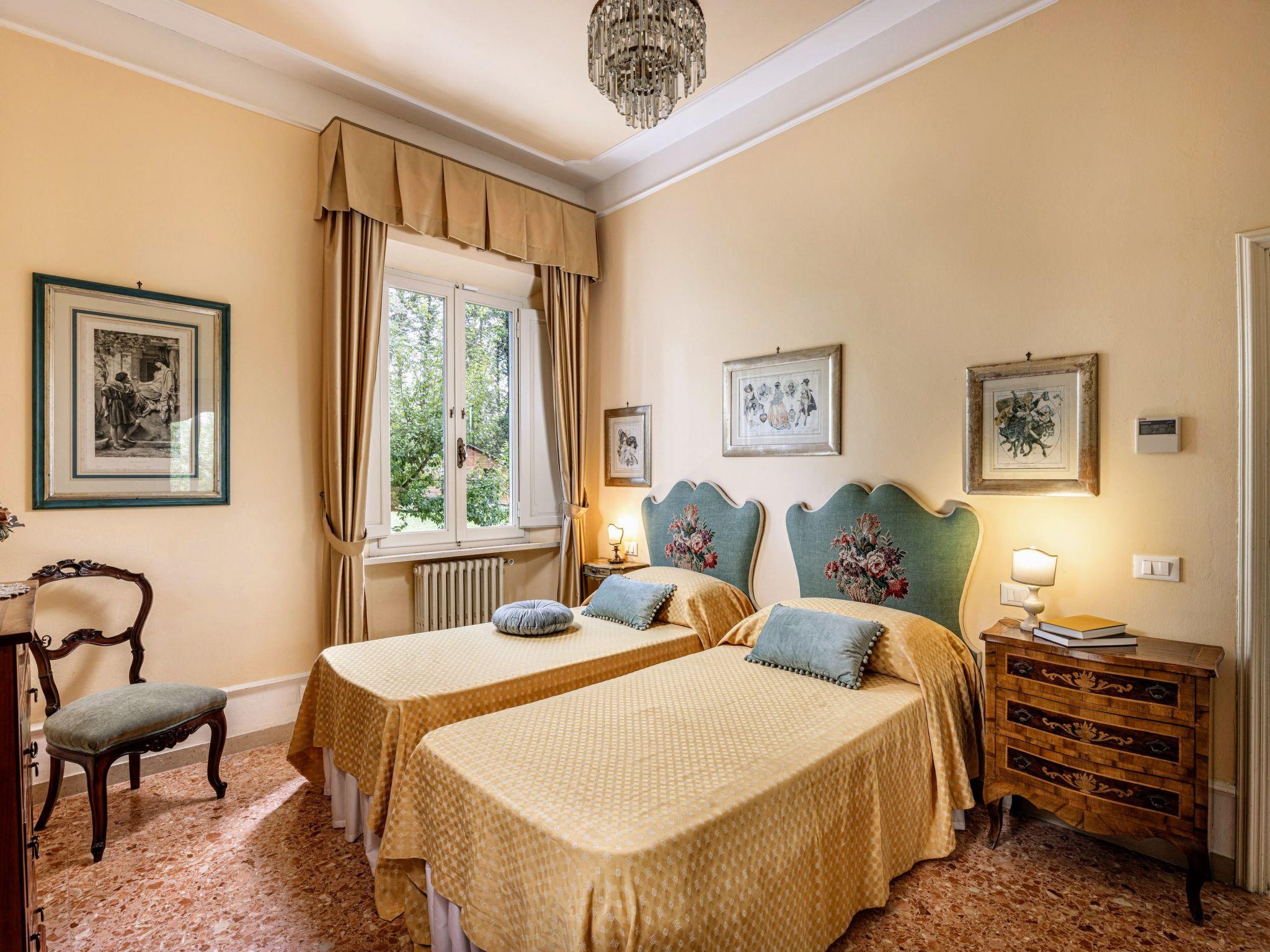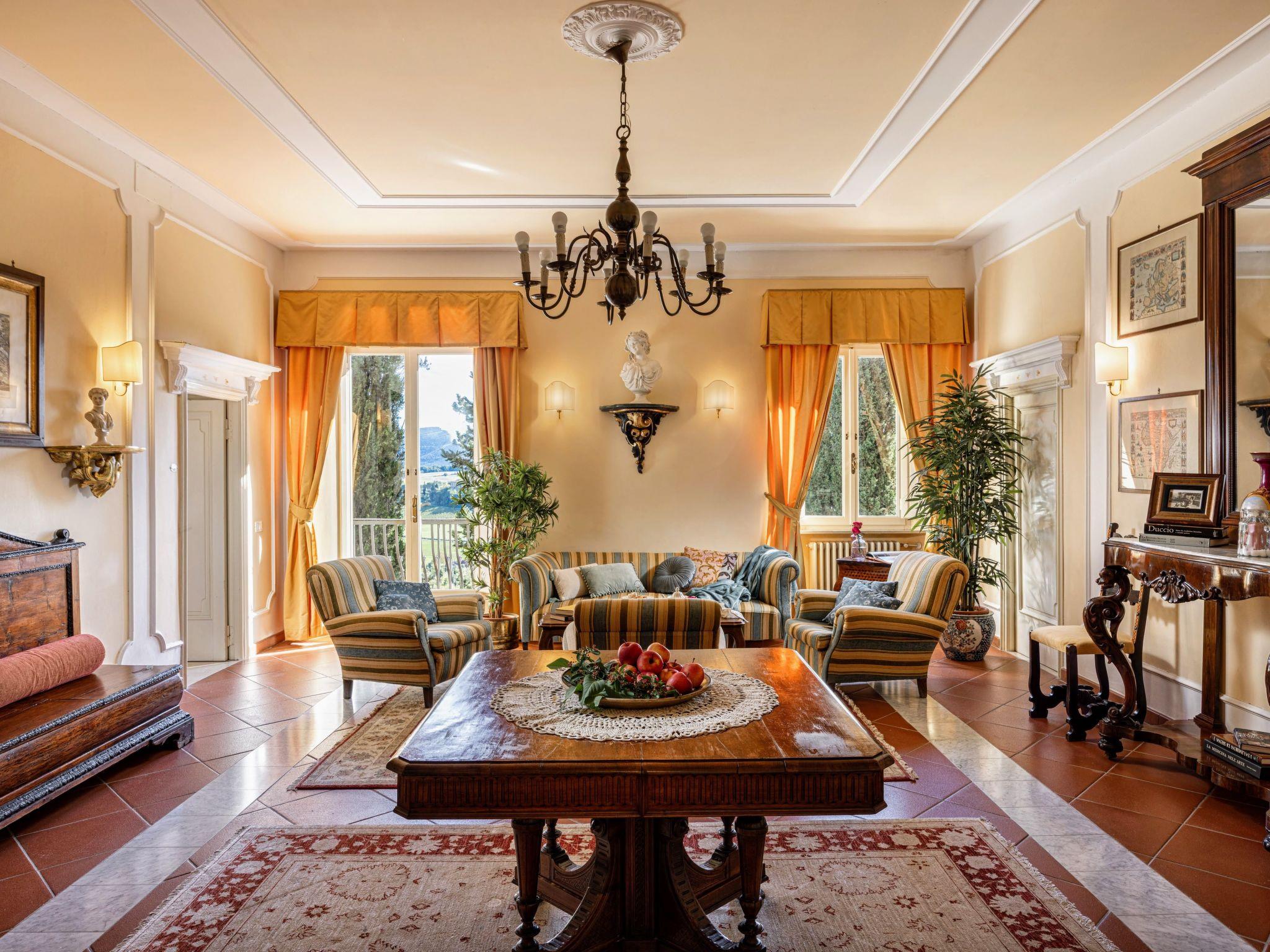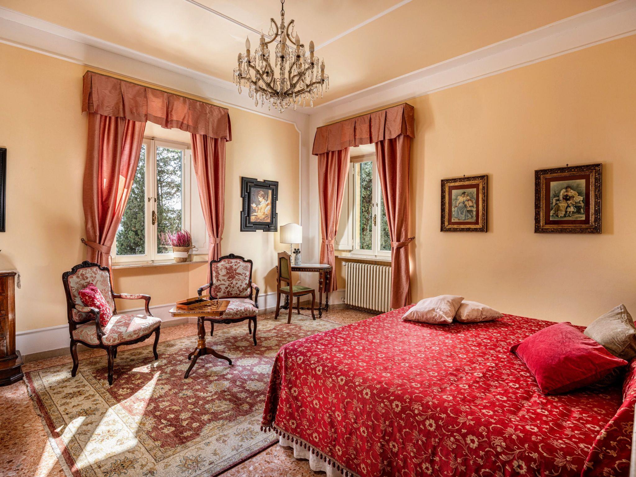 Inside, the villa features an inviting and carefully curated décor. On the ground floor, a spacious and light-filled living room greets you with traditional high ceilings, an elegant fireplace and refined antique furnishings. To the right of the entrance, an elegant and easily accessible bedroom with en-suite bathroom offers comfort and privacy. The bright, refined dining room opens onto picturesque views, while the fully equipped modern kitchen promises effortless culinary experiences. On the first floor, a second cosy living room with a private balcony leads to a collection of bedrooms, each with its own bathroom, furnished with exquisite taste and the warmth that only a Tuscan villa can offer.
