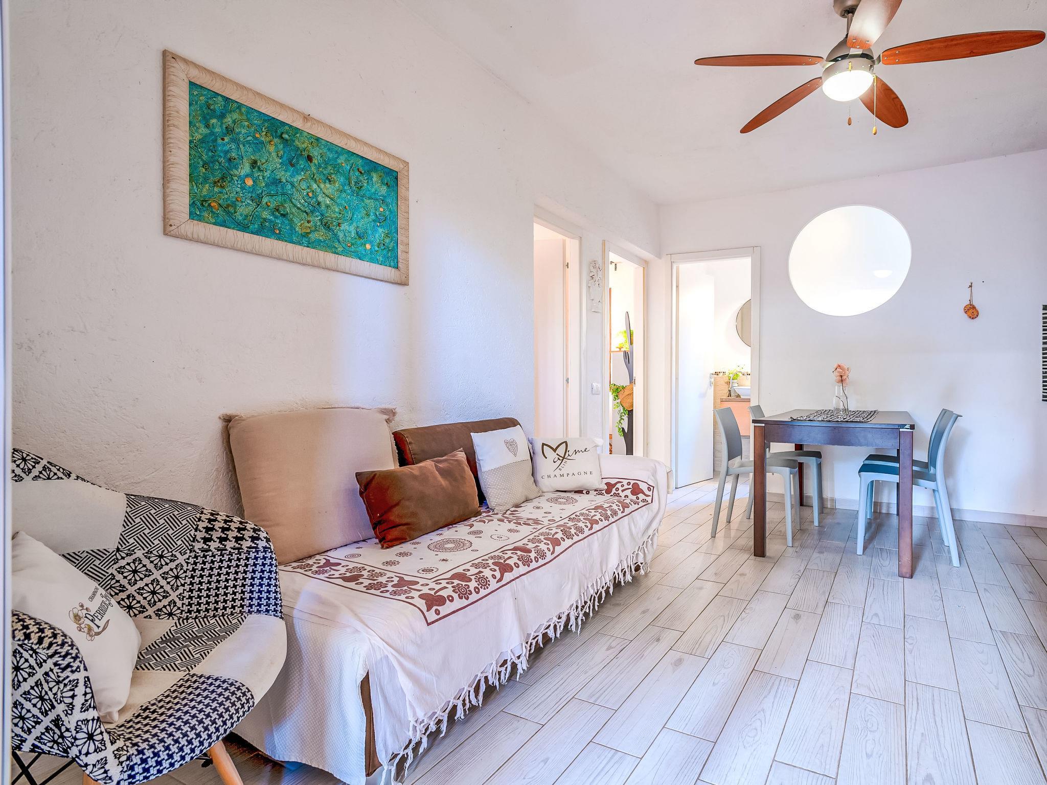 "D4 - I1, Baia de Bahas", 3-room apartment on the ground floor. Comfortable and cosy furnishings: living/dining room with 1 double sofabed (120 cm, length 180 cm), TV and fan. Exit to the terrace. 1 double bedroom. Exit to the terrace. 1 room with 2 beds. Kitchenette (oven, dishwasher, 4 gas rings, toaster, kettle). Shower/bidet/WC. Air-conditioning, forced-air heating. Heating not available in all rooms. Terrace roofed, garden. Terrace furniture. Facilities: washing machine, iron, hair dryer. Maximum 1 pet/ dog allowed. IT090063C2000R7898