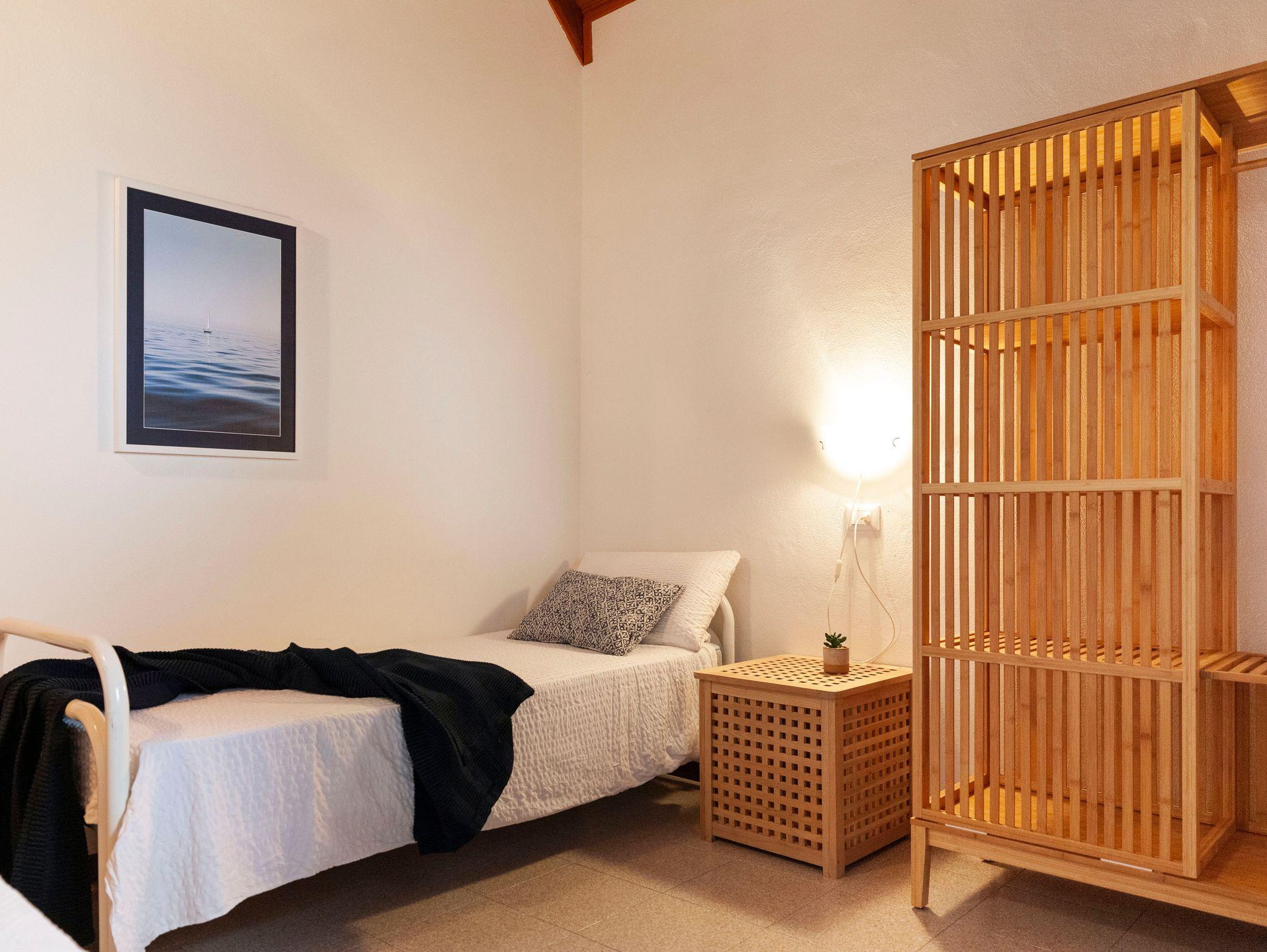 • Ein Schlafzimmer mit Doppelbett, Klimaanlage, Blick in den Garten und eigenem Bad (Dusche, WC und Bidet)