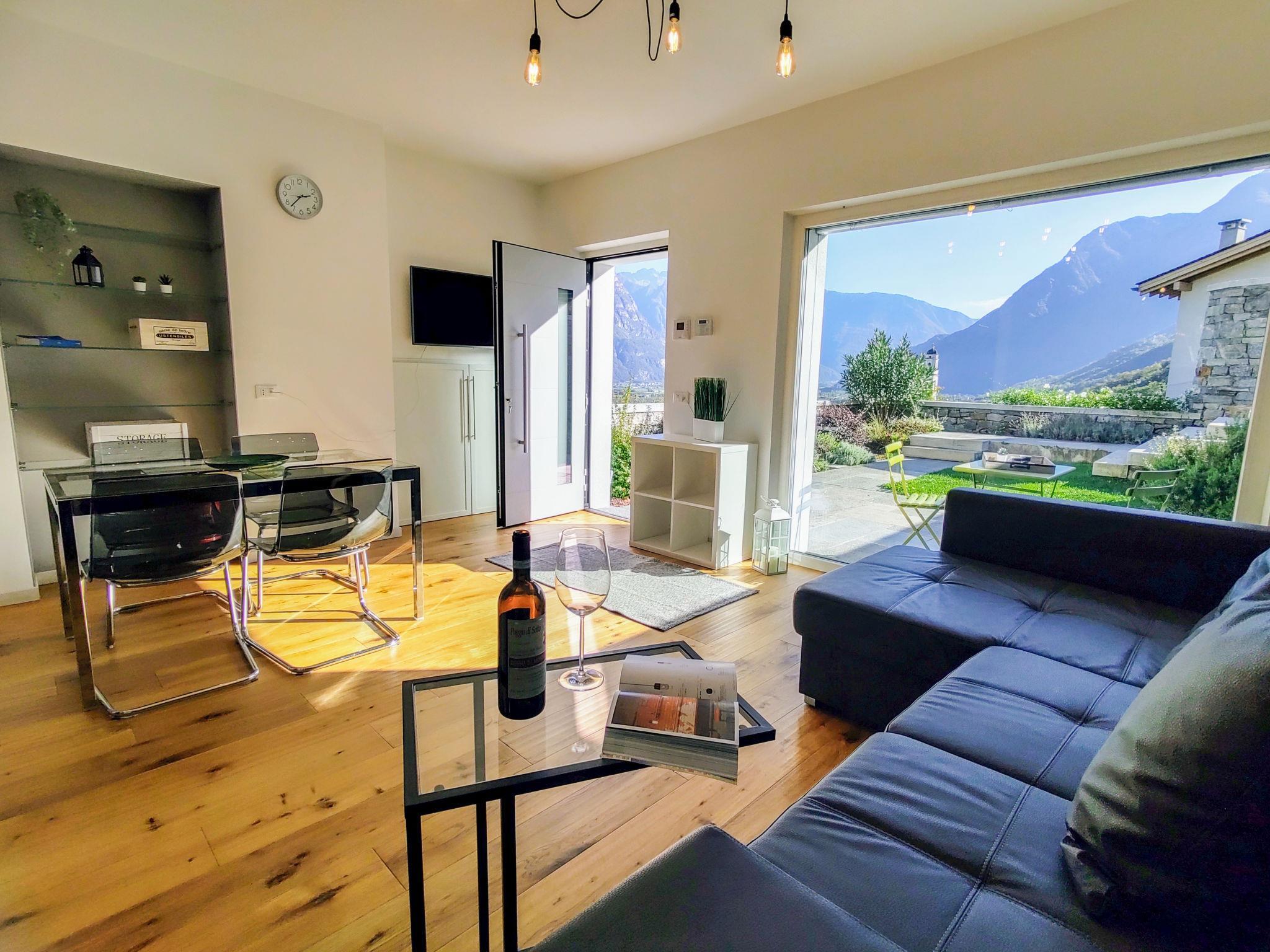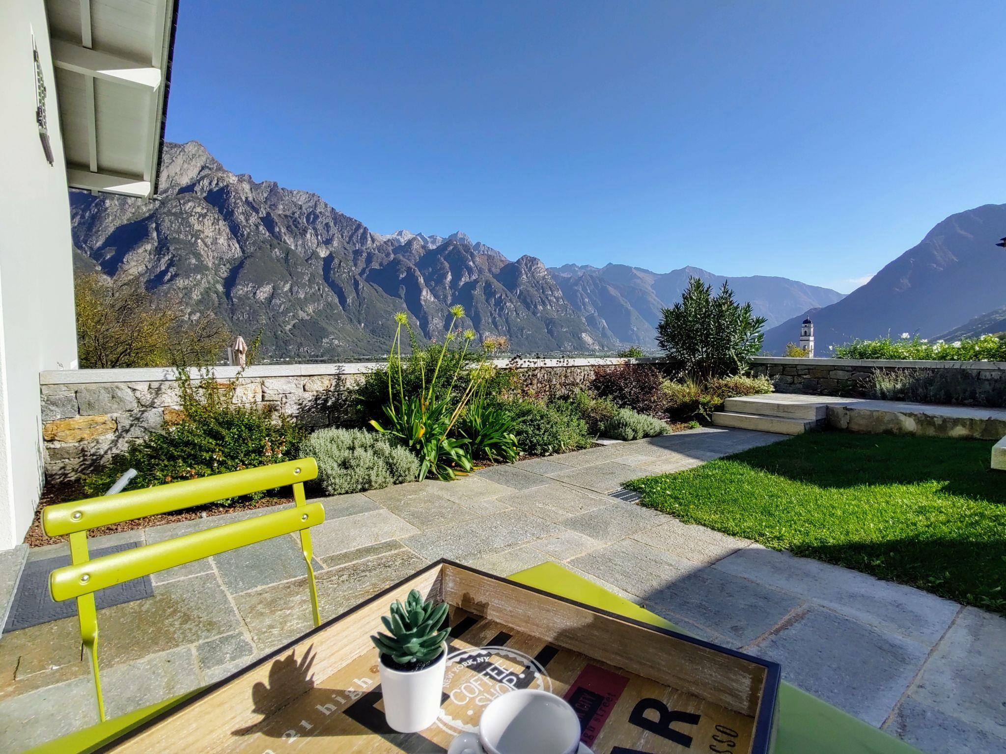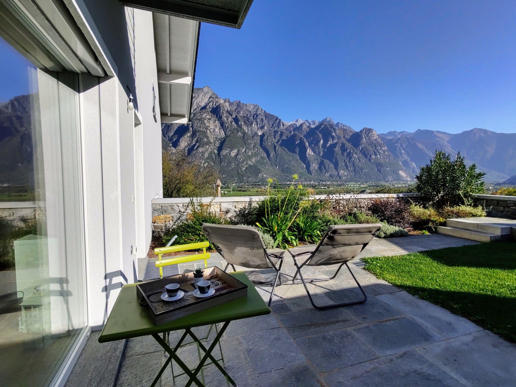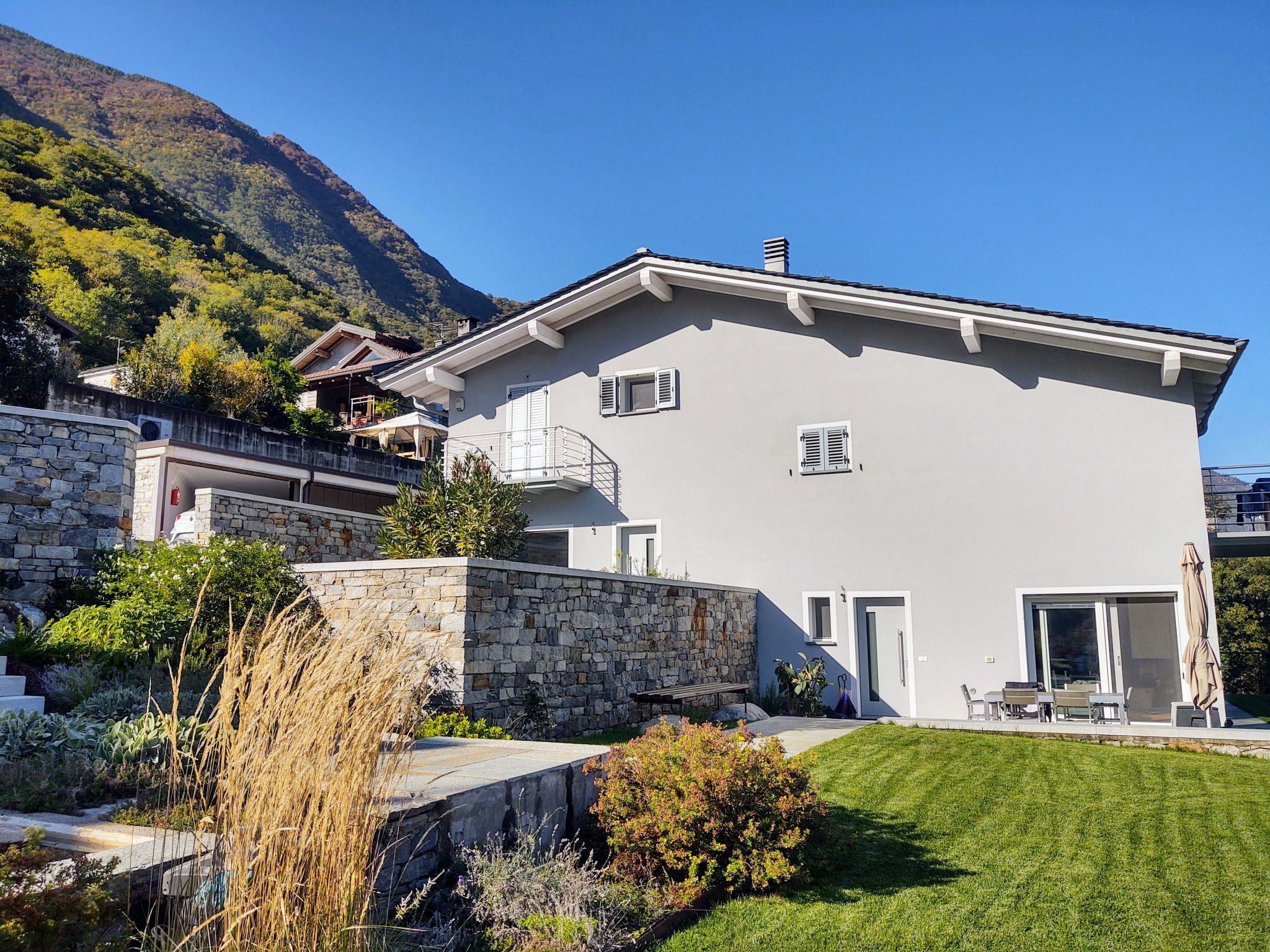 Modern 2-family house "Ronscione Bellavista". In the district of San Pietro 9 km from the centre of Novate Mezzola, 14 km from the centre of Chiavenna, 90 km from the centre of Como, in a quiet, sunny, elevated position, 10 km from the lake, in the countryside. For shared use: property 7'000 m2, large, well-kept terraced garden (not fenced) with lawn and trees. Private: garden 60 m2. In the house: storage room for bicycles. Storeroom available. 200 m long steep, narrow motor access to the house. Stepped path to the house. Parking on the premises. Supermarket 500 m, restaurant 1 km, bar 1 km, bus stop 650 m, railway station "Novate Mezzola" 10 km, sandy beach "Lido di Novate" 10 km pebble beach "La Punta (Lago di Como)" 20 km. Walking paths from the house 20 m, cycle lane 1 km. Nearby attractions: Cascata di Boggia 6 km, Torre di Segname 3 km, Chiavenna 9 km, casa Pipeta. Well-known ski regions can easily be reached: Madesimo 28 km. Well-known lakes can easily be reached: Lago di Mezzola 10 km, Lago di Como 20 km. Hiking paths: Sentiero Valtellina, Sentiero Tracciolino. Object suitable for 2 adults + 2 children. Please note: the owner lives in the same residence.