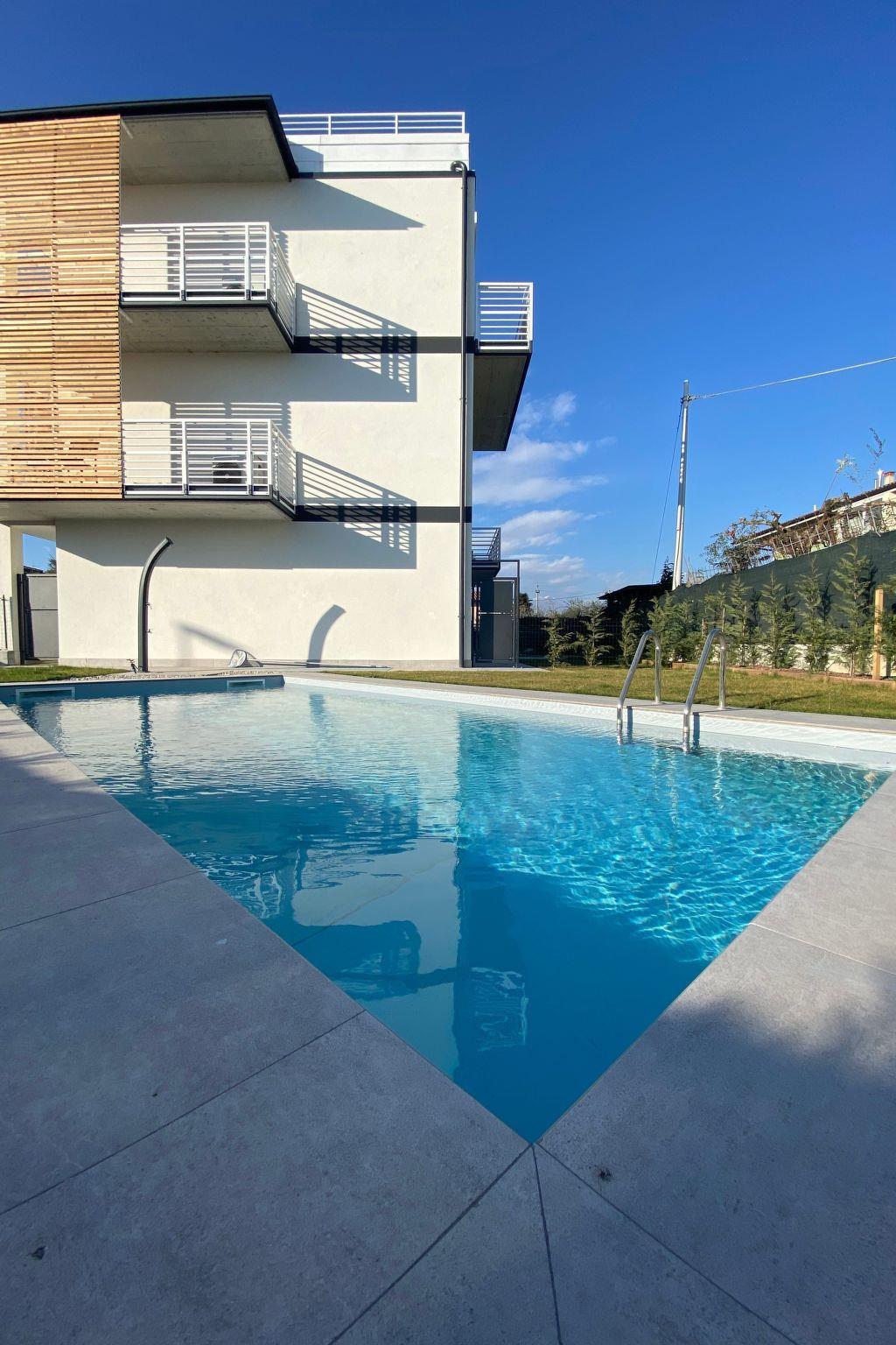 In the common area there is a beautiful swimming pool with a garden where sun loungers can be placed. Sun loungers can be hired on site for a fee. The area is also equipped with a convenient shower.The flat also has a large covered garage closed with an automatic gate, with a private parking space for your car (maximum height 202cm).A large balcony characterises the architectural line of the property. The generous dimensions allow for pleasant moments to be spent in good company, enjoying good food or sipping a cool aperitif.The entire block of flats is fenced off and access is closed by a gate, as is access to the entrance hall, which is closed by a main door.The aesthetic line of the property is fresh and modern, characterised by a contemporary style embellished by warm wooden inserts, making the visible impact very pleasant and harmonious. The house is also completed with hedges and gardens that enhance the overall impression.