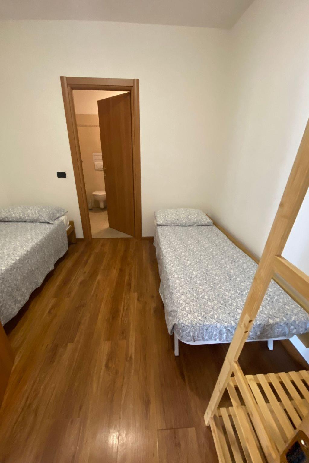 Internally, the flat covers approximately 110 square metres of well-organised and cosy space, capable of accommodating up to 9 adults in total comfort. The layout includes two large bedrooms and a smaller one with two single beds, along with two modernly equipped bathrooms with showers. The large living room with a fully equipped kitchen invites for convivial moments, while air conditioning (available at an extra charge if used), a washing machine, TV and Wi-Fi internet access guarantee a stay filled with every modern comfort.