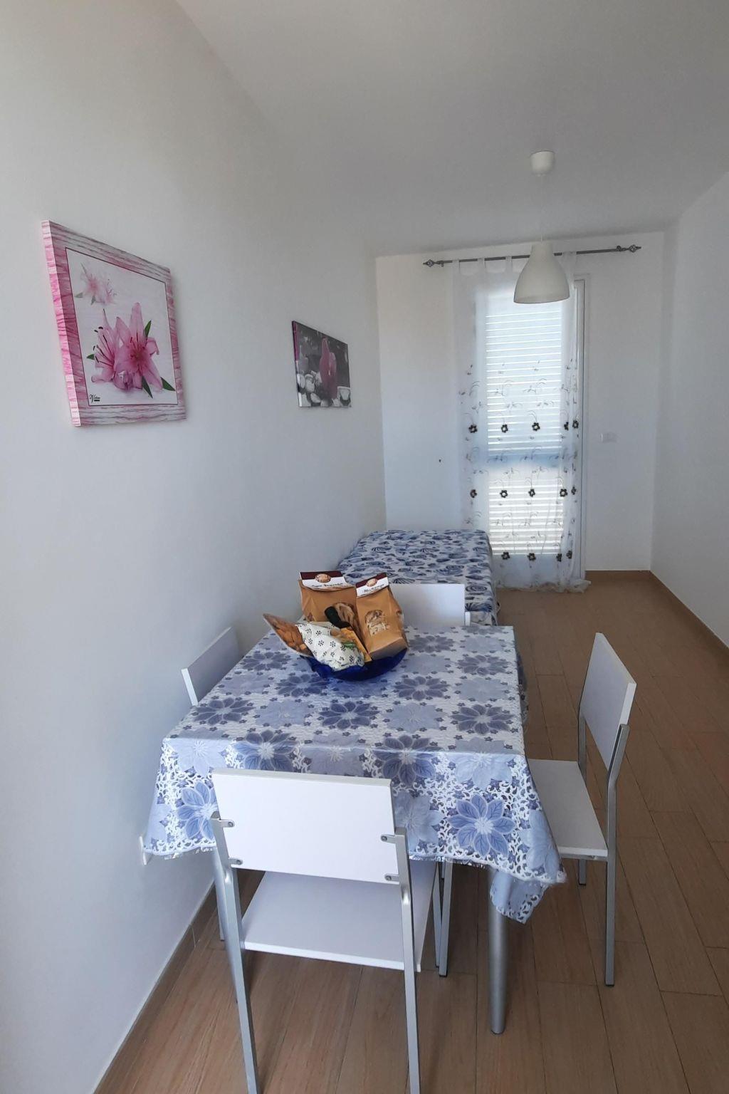 The air-conditioned flat is located on the first floor. It consists of a kitchen-living room, a double bedroom and a bathroom with shower. The kitchen-living room has a dining table with chairs, a double sofa bed for an additional sleeping place and an LED TV. The kitchen is fully equipped with pots and pans, as well as a refrigerator with freezer compartment and a four-burner gas hob.