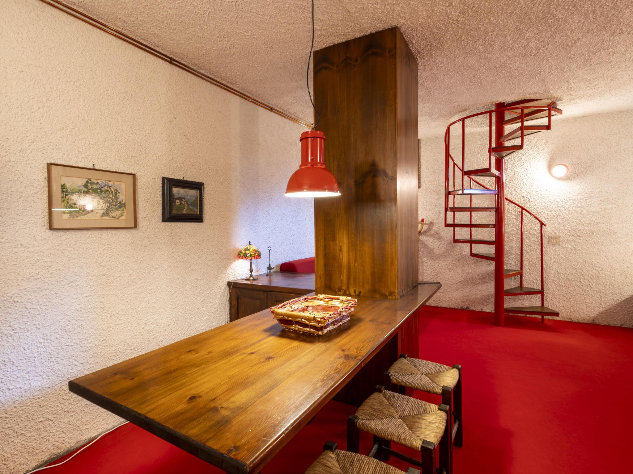 2-room apartment 60 m2 on 2 levels, on the upper ground floor, east facing position. Practical and comfortable furnishings: large living/dining room with dining table and TV. Exit to the garden, to the terrace. Small, open kitchen (oven, 4 gas rings, toaster, kettle, electric coffee machine, Capsules for coffee machine (Nespresso) free). Bath/bidet/WC. On the lower ground floor: (spiral staircase), 1 large room with 1 double sofabed (160 cm, length 190 cm), 1 x 3 bunk beds, shower/WC. Carpet. Large terrace. Terrace furniture, deck chairs (4). View of the mountains and the garden. Facilities: children's high chair, baby cot, hair dryer. Internet (WiFi, free). Please note: non-smoking house. Maximum 1 pet/ dog allowed. Smoke alarm, fire extinguisher. IT014035C2HGWFNX3G