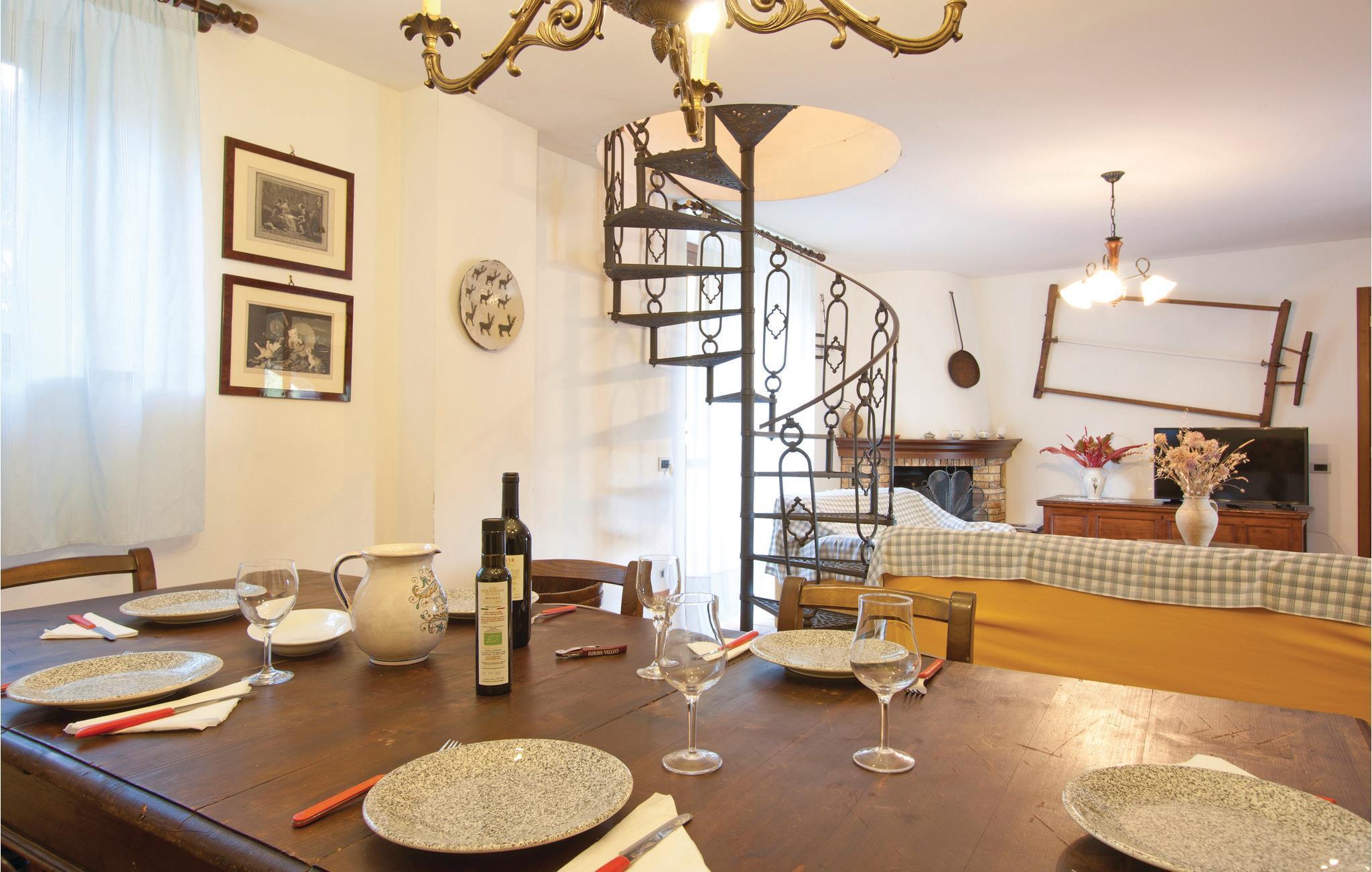 Et dobbelthus, i en idyllisk kuperet beliggenhed, der er del af en gård, der producerer vin og olivenolie. Foran stuen i stueetagen er den overdækkede terrasse. Poolområdet er fælles for alle gæster. På den store naturgrund er der en tennisbane og en lille legeplads med et træhus. Barneseng på anmodning. Ideel til familier, der elsker kontakten med naturen og motion: Fra hyttestierne føres du ind i skoven og til søen søen. Ideel til mountainbikere. I lejlighedens stueetage er der en stor stue med pejs, et badeværelse, et rummeligt køkken, en møbleret veranda og adgang til en stor have. Den øverste etage er tilgængelig via en vindeltrappe. Her er tre store soveværelser. Et med to dobbeltsenge, pejs og badeværelse med badekar. Et dobbeltværelse med en tredje seng og et andet dobbeltværelse med badeværelse i gangen med badekar og bruser. Ikke-asfalteret adgangsvej. Se også IUT179.