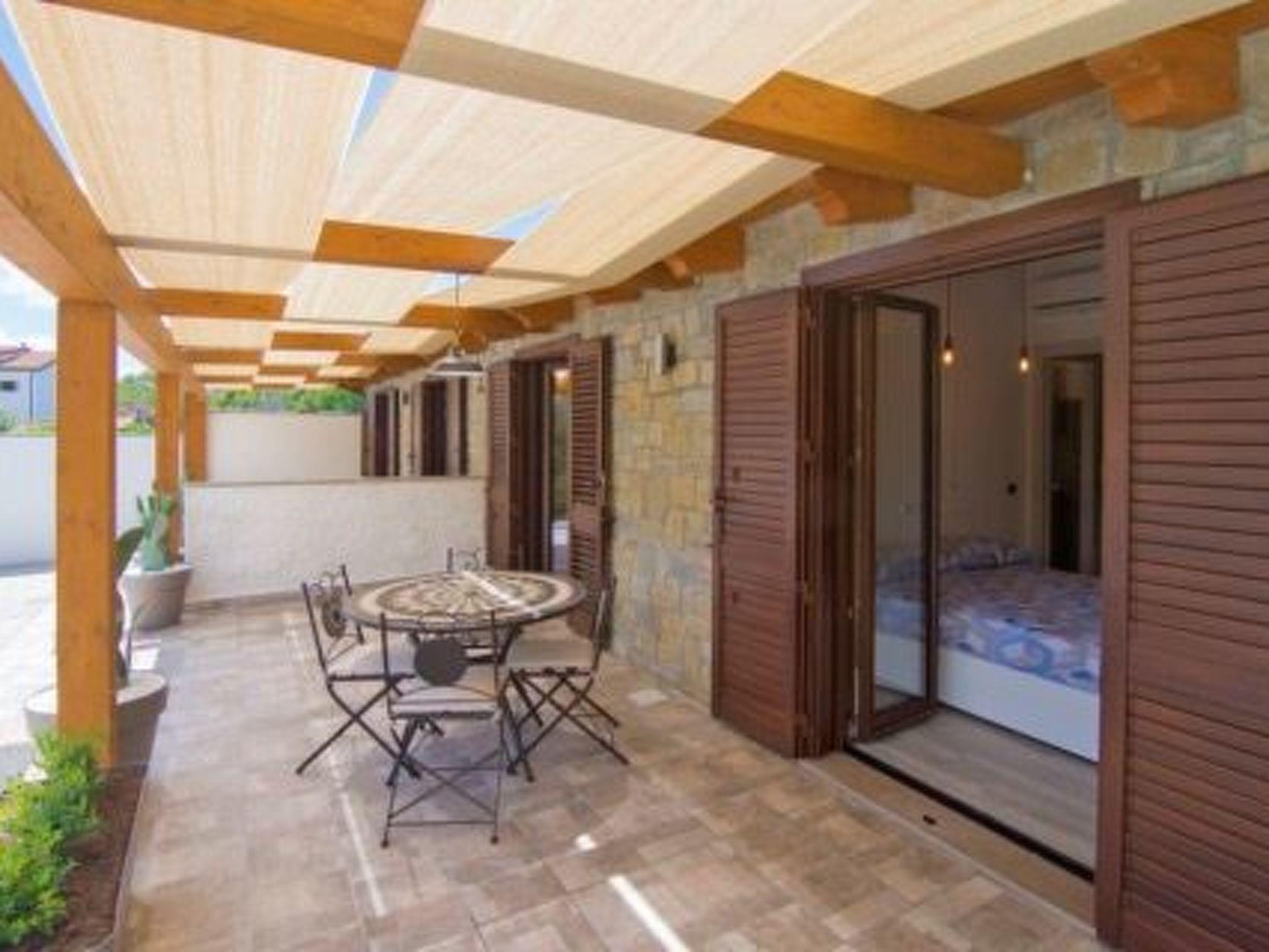 The large covered terrace at the entrance is furnished with a table and chairs. A parking space is available outside. Guests can use the shower with hot water and the shared barbecue.