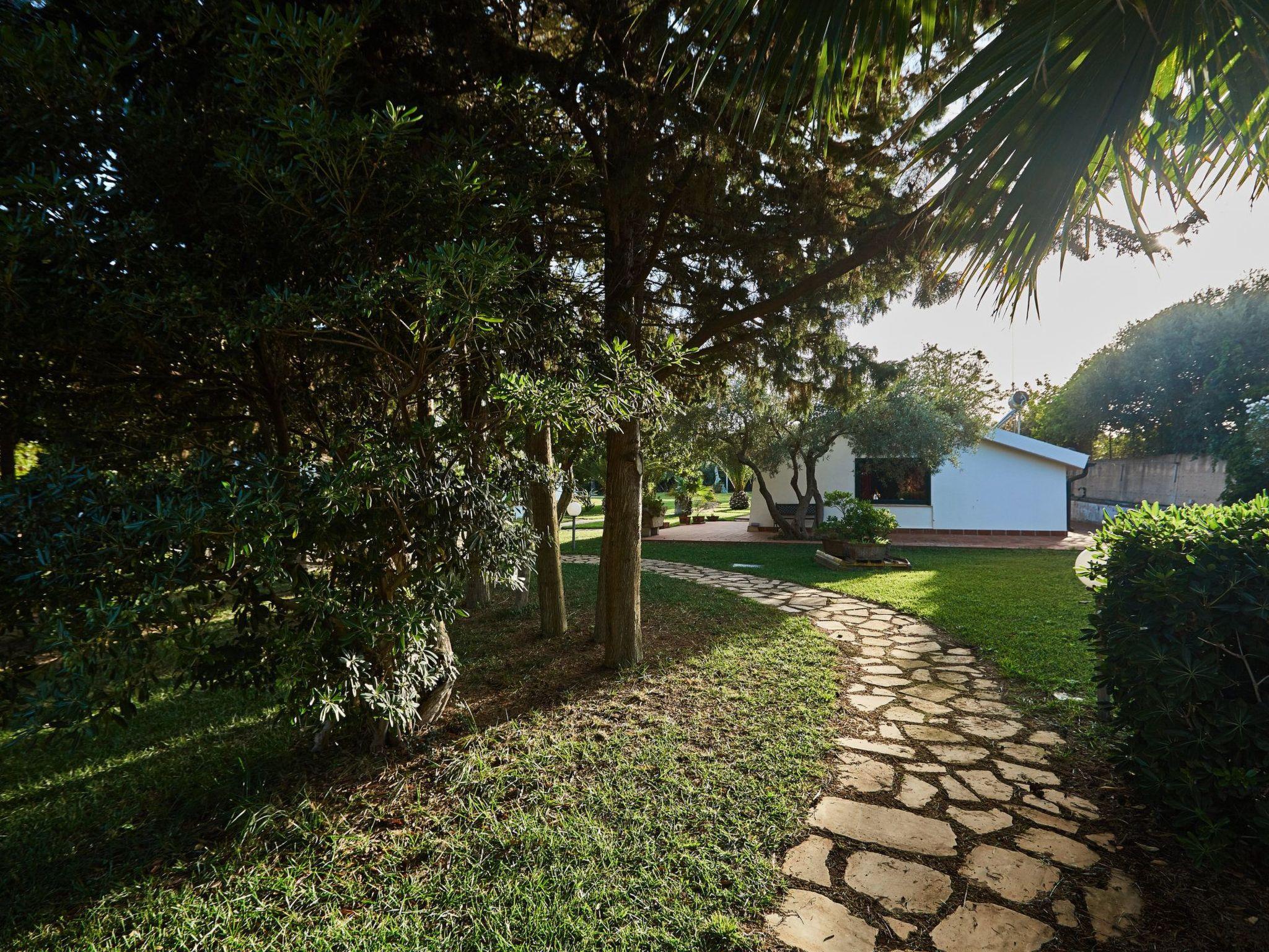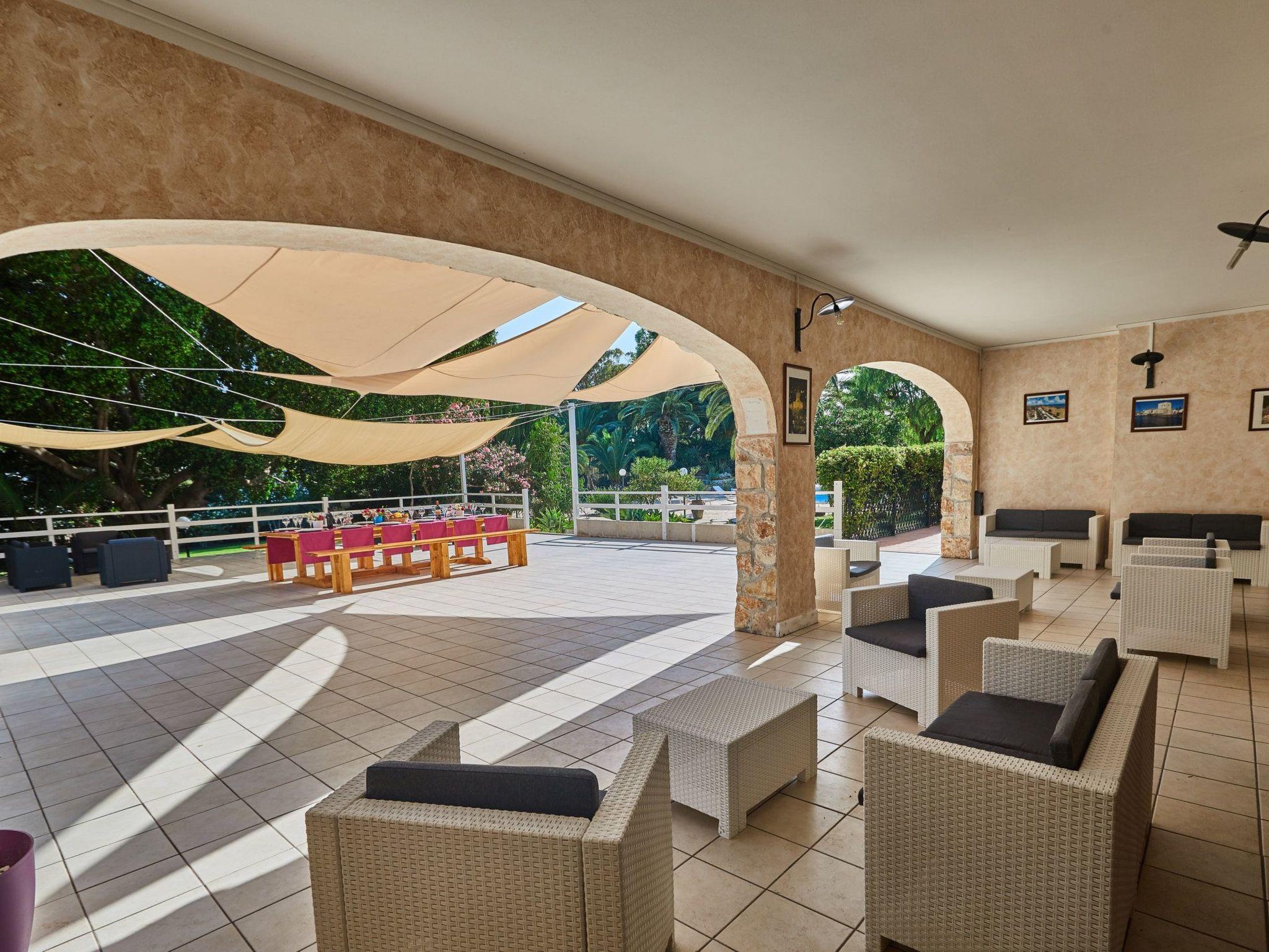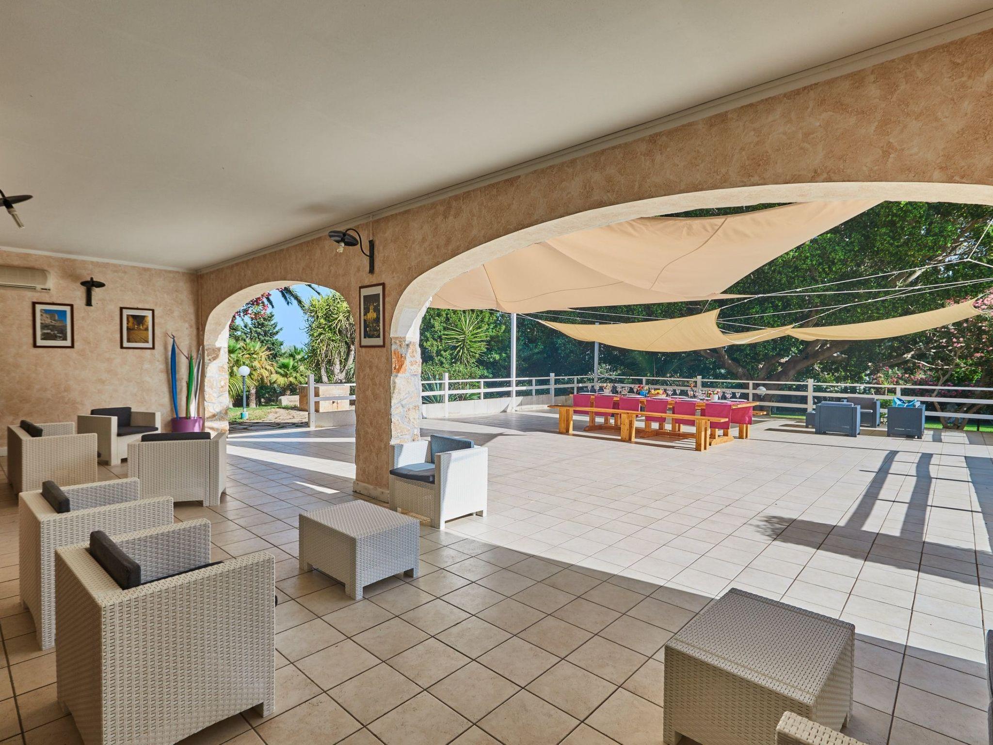 Leaving the room where there is the large table, there is a patio of about 50 square metres furnished with polirattan lounges and a table for 20 people where you can dine in the evening enjoying the coolness of the park. As soon as you pass through the entrance gate you have the feeling that you have arrived in a wonderful place, at guests' disposal there is a 10,000 square metre lawn, decorated and embellished with palm trees and centuries-old carob trees as well as many other species of Mediterranean plants. The park is criss-crossed with lanes of local white stone so that it already looks like a painting. Then we find a gazebo with a very large wooden table for sitting at the barbecue and in the immediate vicinity bordering on another area where there is a nice table tennis table, and further on, to the delight of the little ones, there is a small recreation area. Continuing the walk, we come to the centrepiece of the park, a large inregular swimming pool and all around sun loungers with sunshades and 2 round wrought-iron tables with chairs so that you can spend days in absolute relaxation. About 15 metres away is a semi-covered terrace with sails and furnished with polirattan loungers, all adjacent to the kitchen.