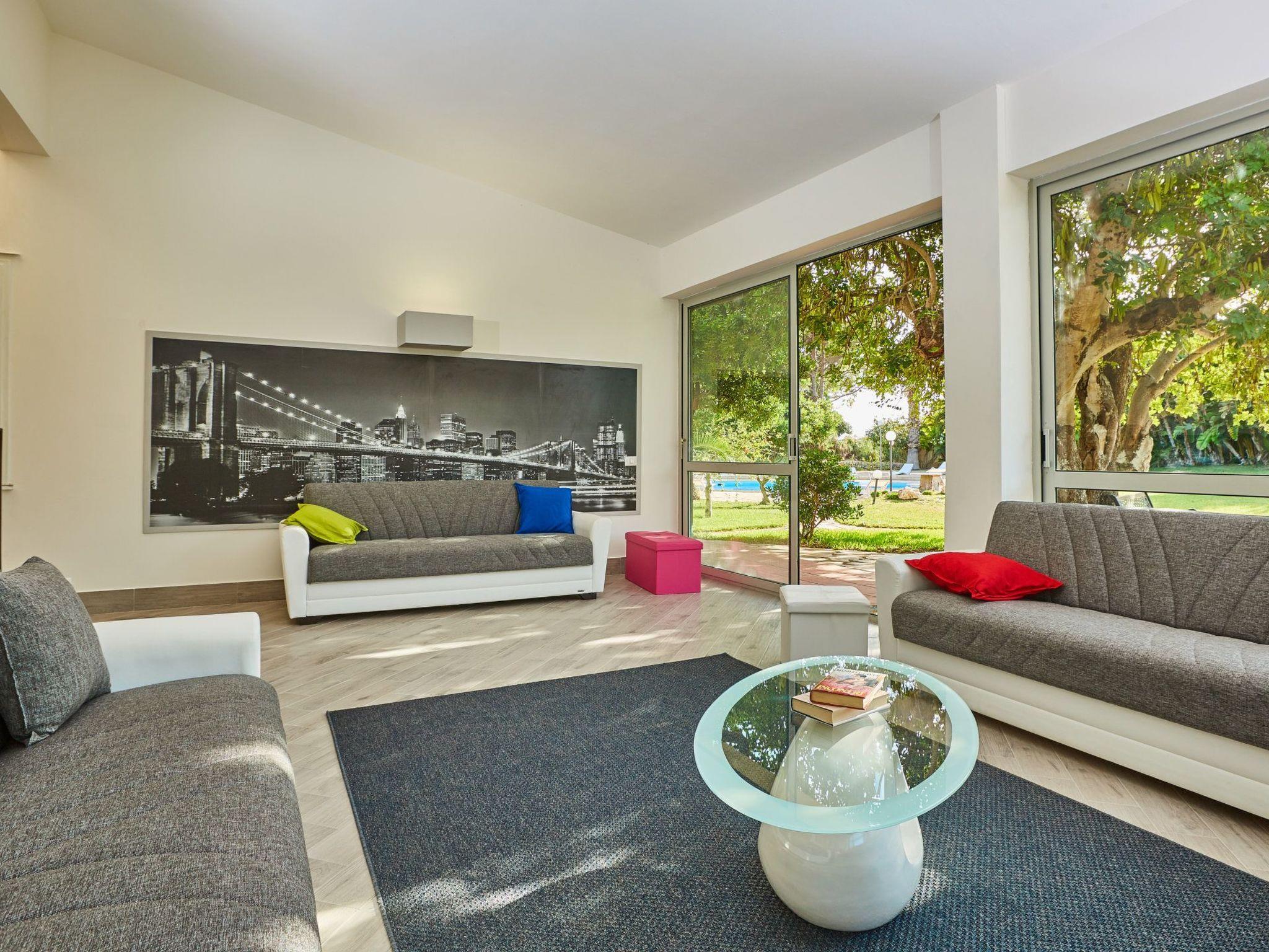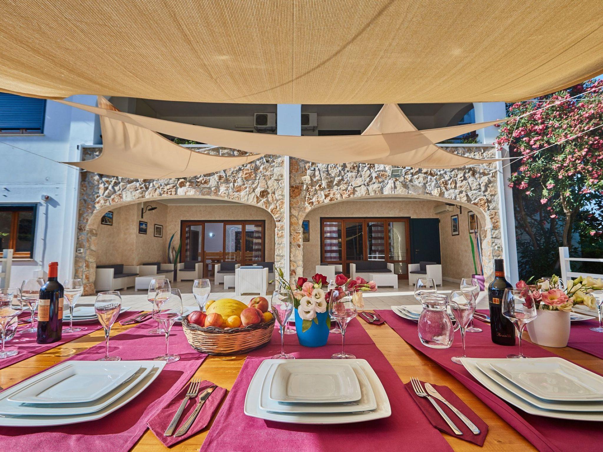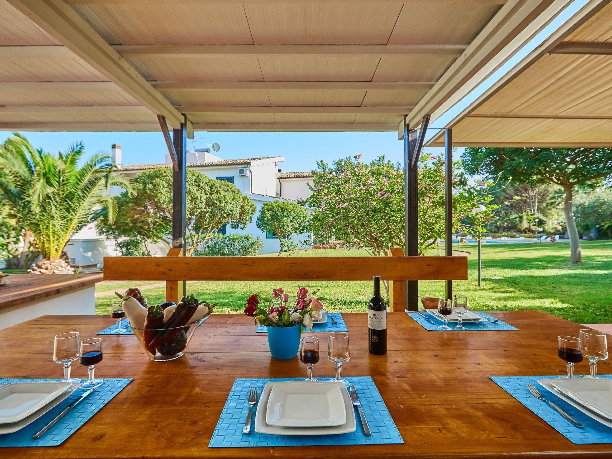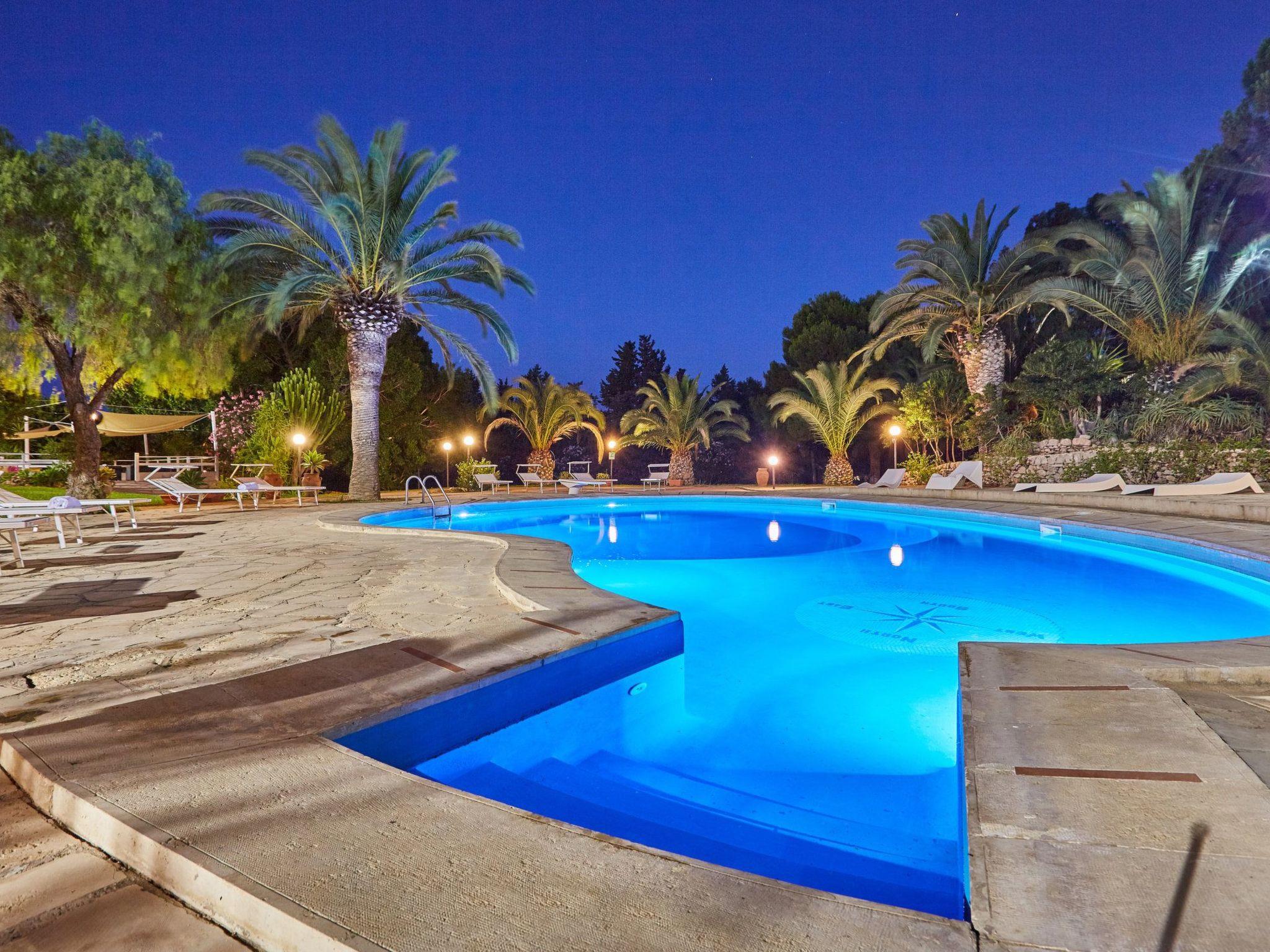 Leaving the room where there is the large table, there is a patio of about 50 square metres furnished with polirattan lounges and a table for 20 people where you can dine in the evening enjoying the coolness of the park. As soon as you pass through the entrance gate you have the feeling that you have arrived in a wonderful place, at guests' disposal there is a 10,000 square metre lawn, decorated and embellished with palm trees and centuries-old carob trees as well as many other species of Mediterranean plants. The park is criss-crossed with lanes of local white stone so that it already looks like a painting. Then we find a gazebo with a very large wooden table for sitting at the barbecue and in the immediate vicinity bordering on another area where there is a nice table tennis table, and further on, to the delight of the little ones, there is a small recreation area. Continuing the walk, we come to the centrepiece of the park, a large inregular swimming pool and all around sun loungers with sunshades and 2 round wrought-iron tables with chairs so that you can spend days in absolute relaxation. About 15 metres away is a semi-covered terrace with sails and furnished with polirattan loungers, all adjacent to the kitchen.