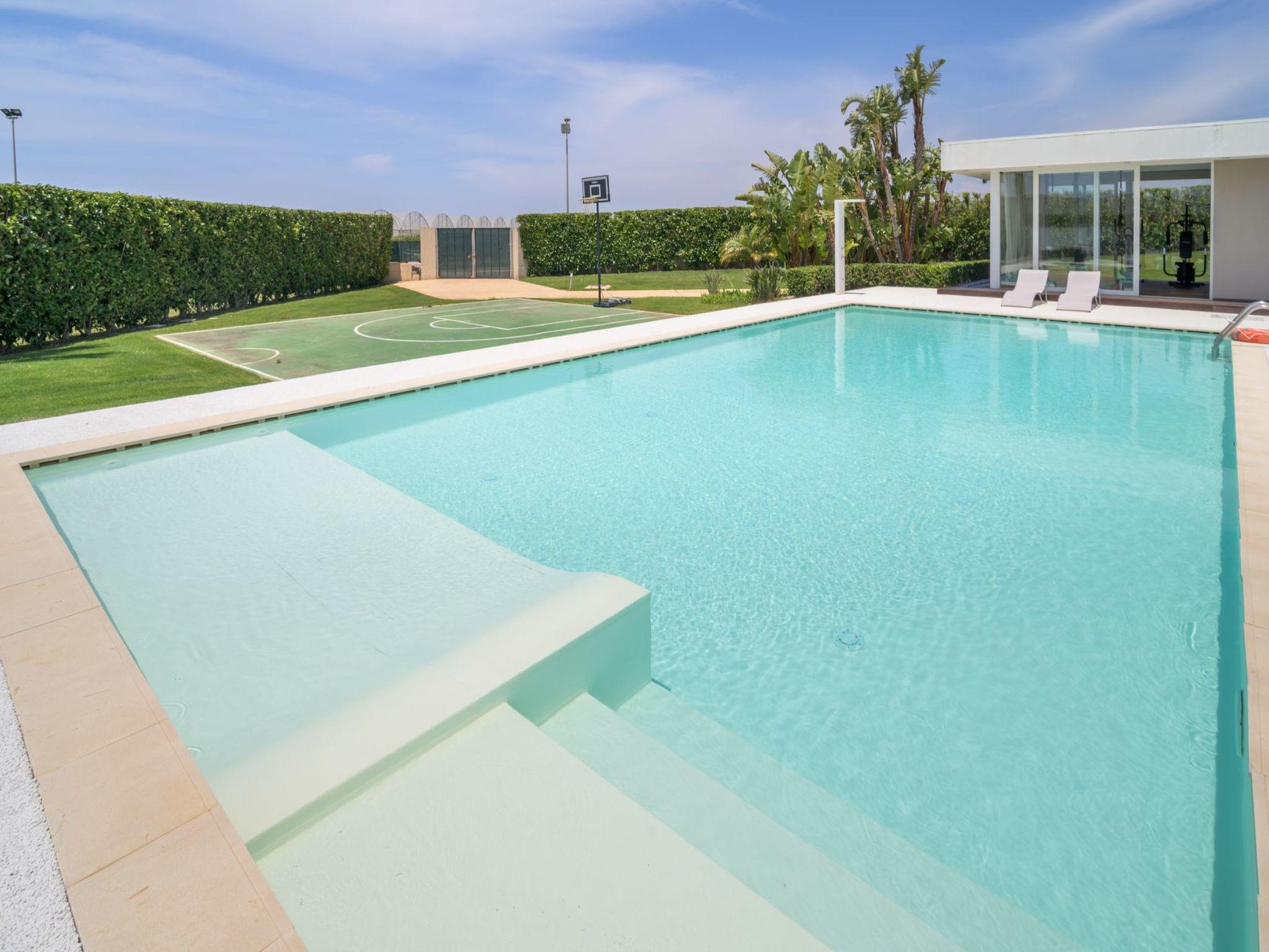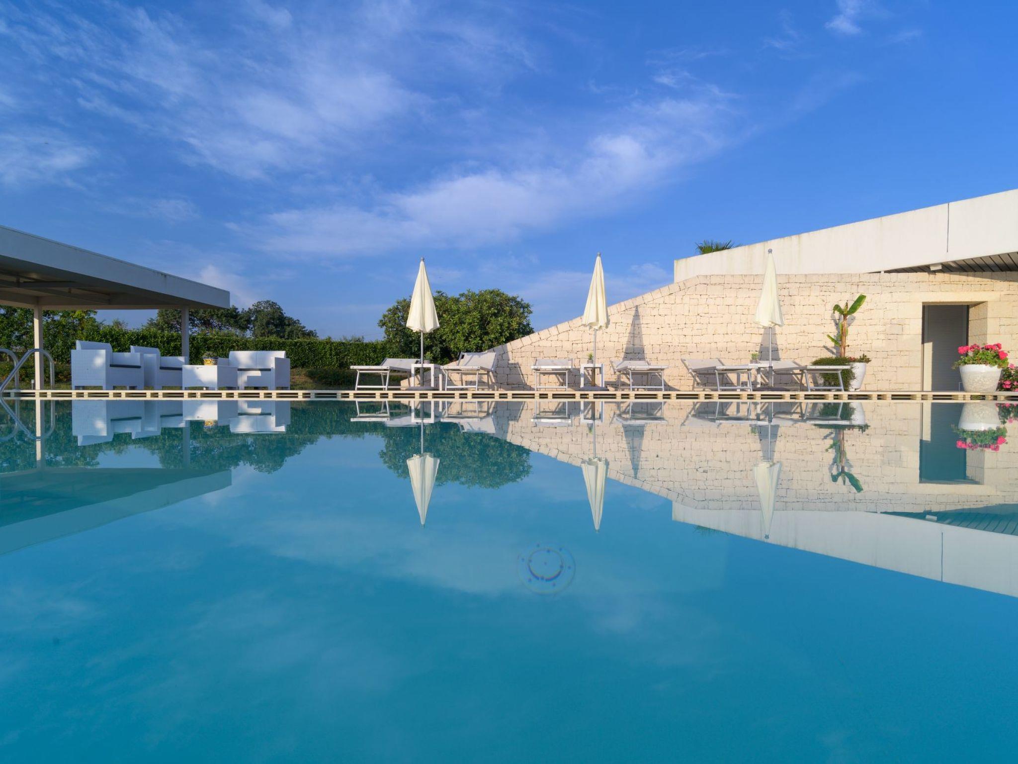 A private swimming pool, surrounded by greenery, with an elegant solarium furnished with umbrellas and sun beds and an outdoor shower.