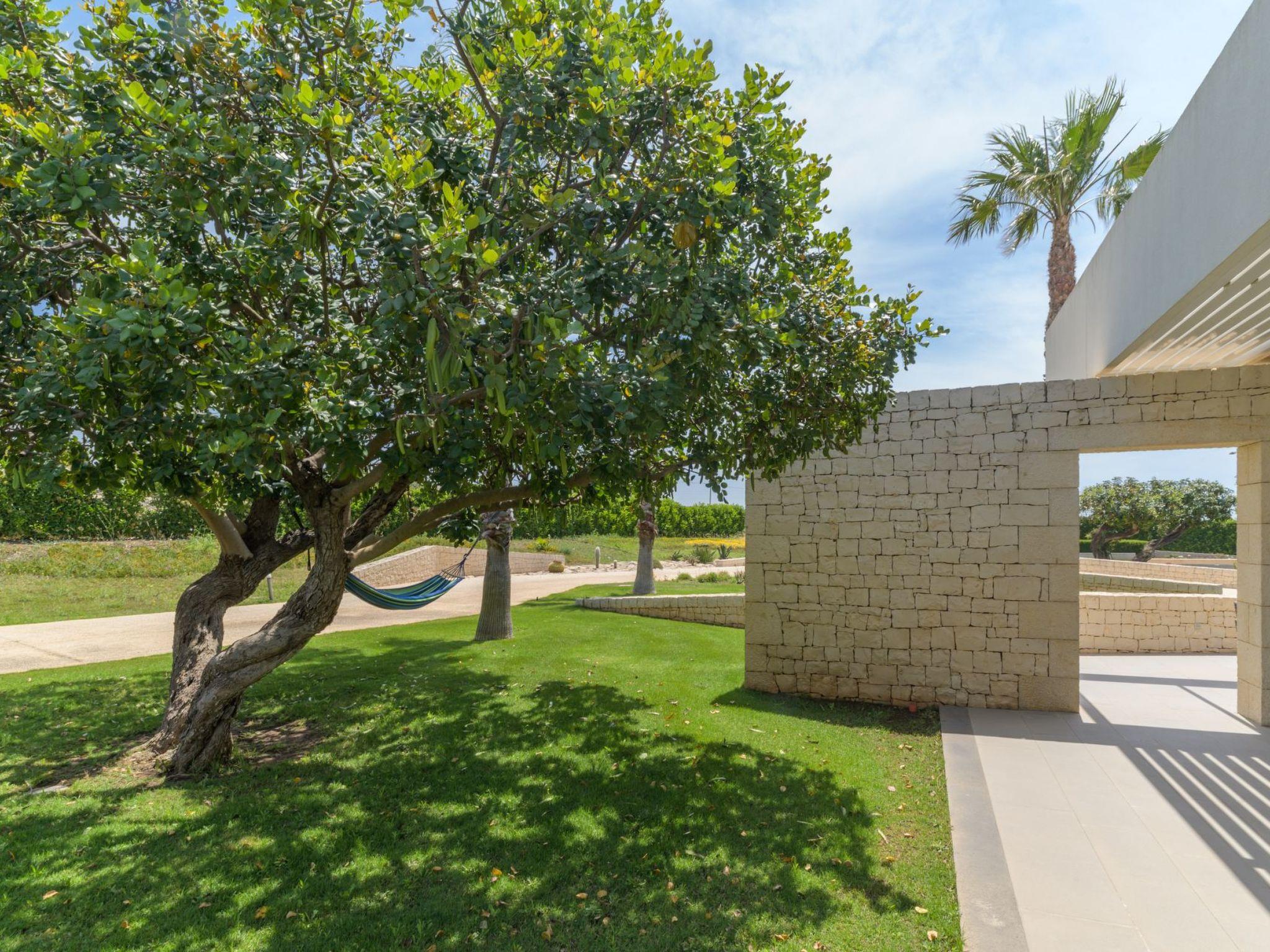 The villa stands within a 4,000 square meter property and offers a large garden adorned with floral plants, flower beds, palm trees and carob trees.