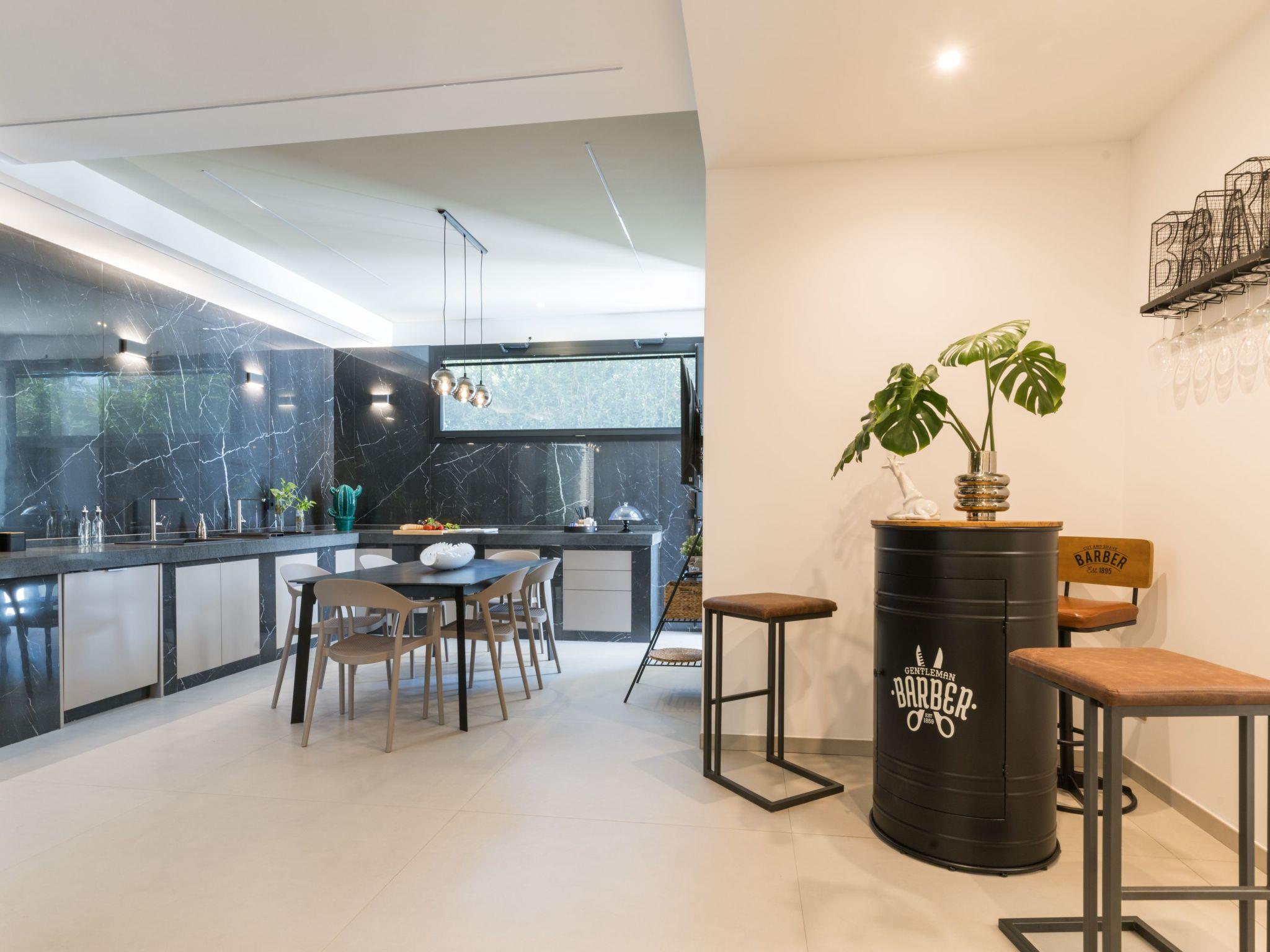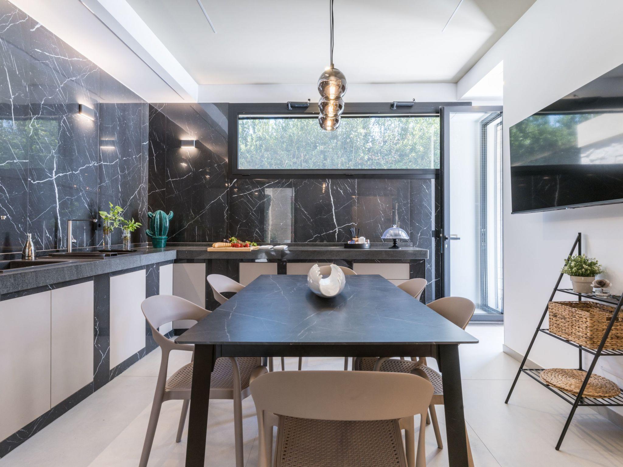 An elegant kitchen, covered in black marble, offers two large sinks, maxi fridge with freezer, electric oven and dishwasher, and is equipped with a wall-mounted TV and dining table.