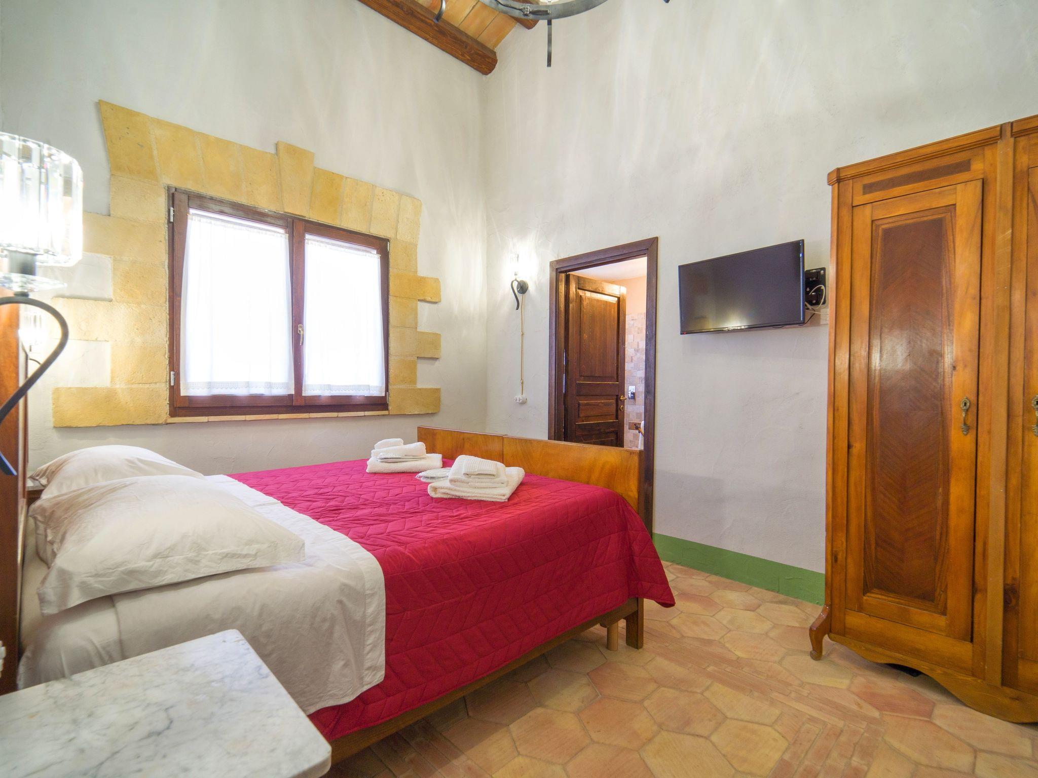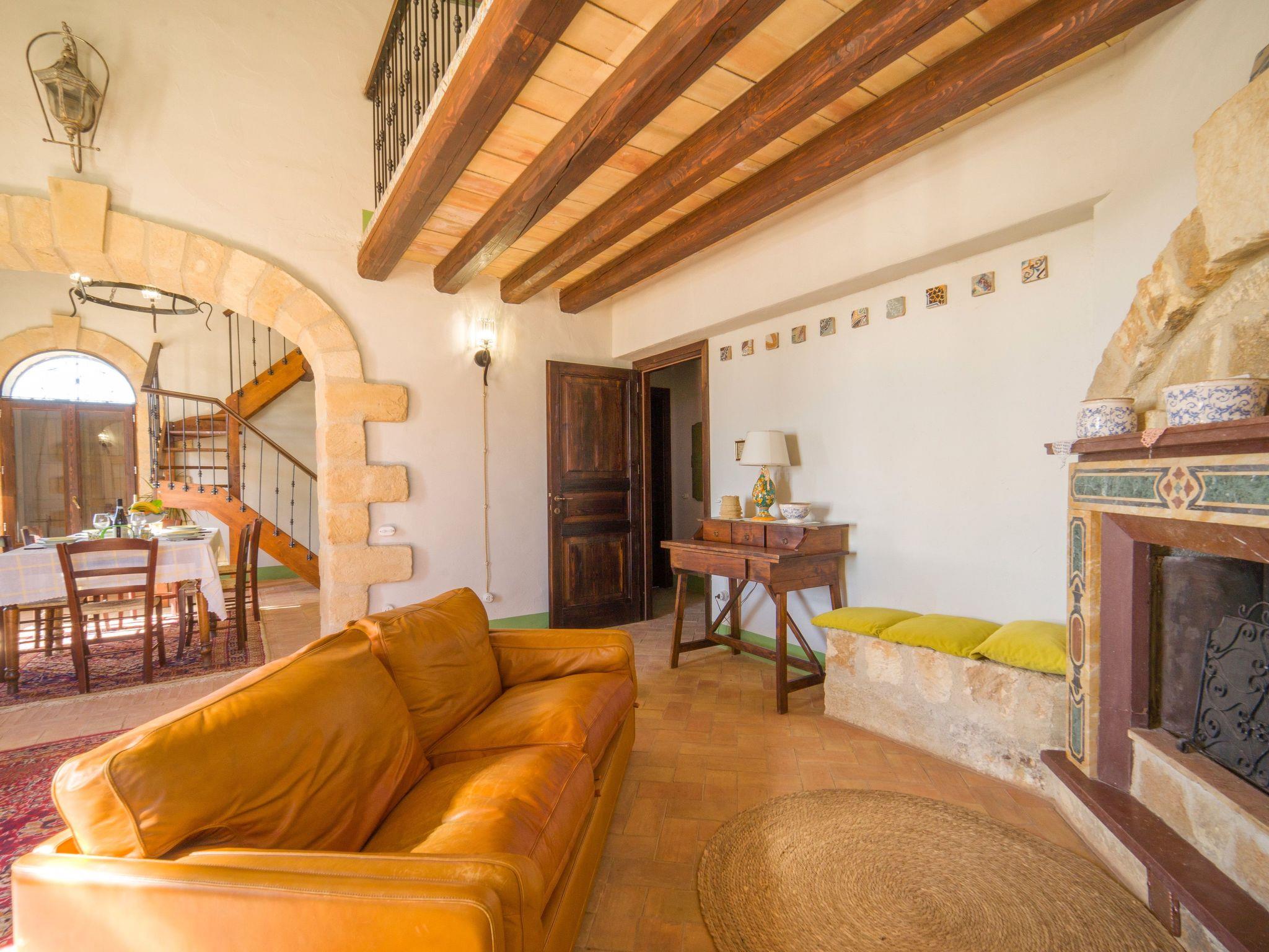 . Inside, the house is on two levels: on the ground floor we have two bedrooms both with en-suite, another service bathroom and a beautiful Sicilian-style kitchen and an elegant living room with fireplace. On the first floor we have a double bedroom next to which is a corridor where there is a double sofa bed. The villa has AC in each room.