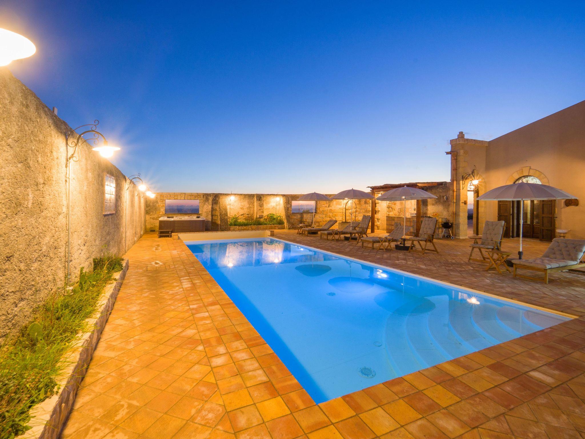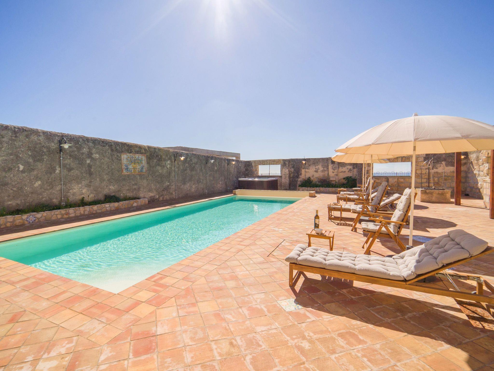 The house has an outdoor area with a heated swimming pool, a jacuzzi and a terrace overlooking the countryside and the sea of Menfi.
