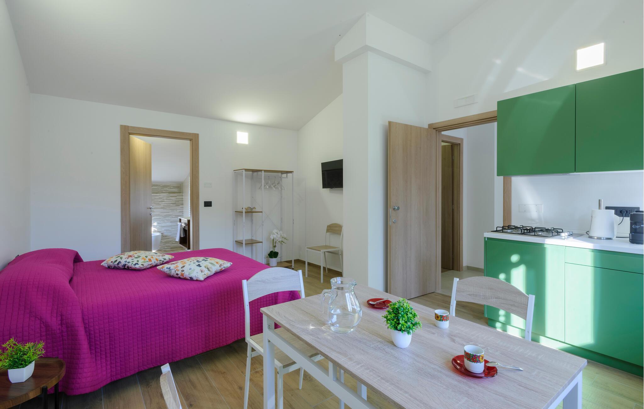 Velkommen til denne dejlige lejlighed, der ligger i en bygning med flere ferieboliger, smukt omgivet af oliventræerne, og med en skøn udsigt over landskabet. Hvis I gerne vil rejse som en større flok, kan I booke flere lejligheder i huset og nyde et ophold med det helt rette mix af sociale stunder og privatlivets fred. Lejligheden er flot indrettet med lyse farveskalaer, moderne komfort og et veludstyret køkken, hvor I kan tilberede en lækker morgenmad, som kan nydes på terrassen med en god kop kaffe og udsigt over landskabet i Pescaras bagland.