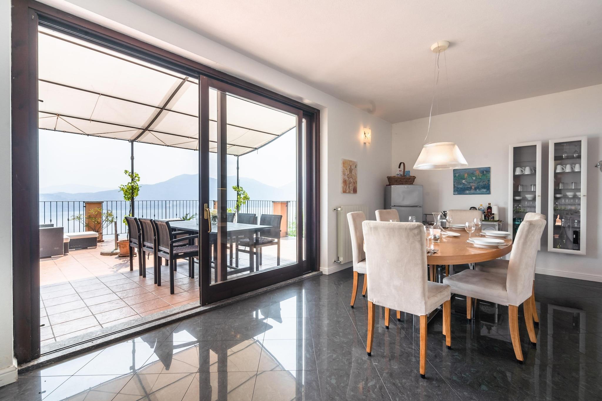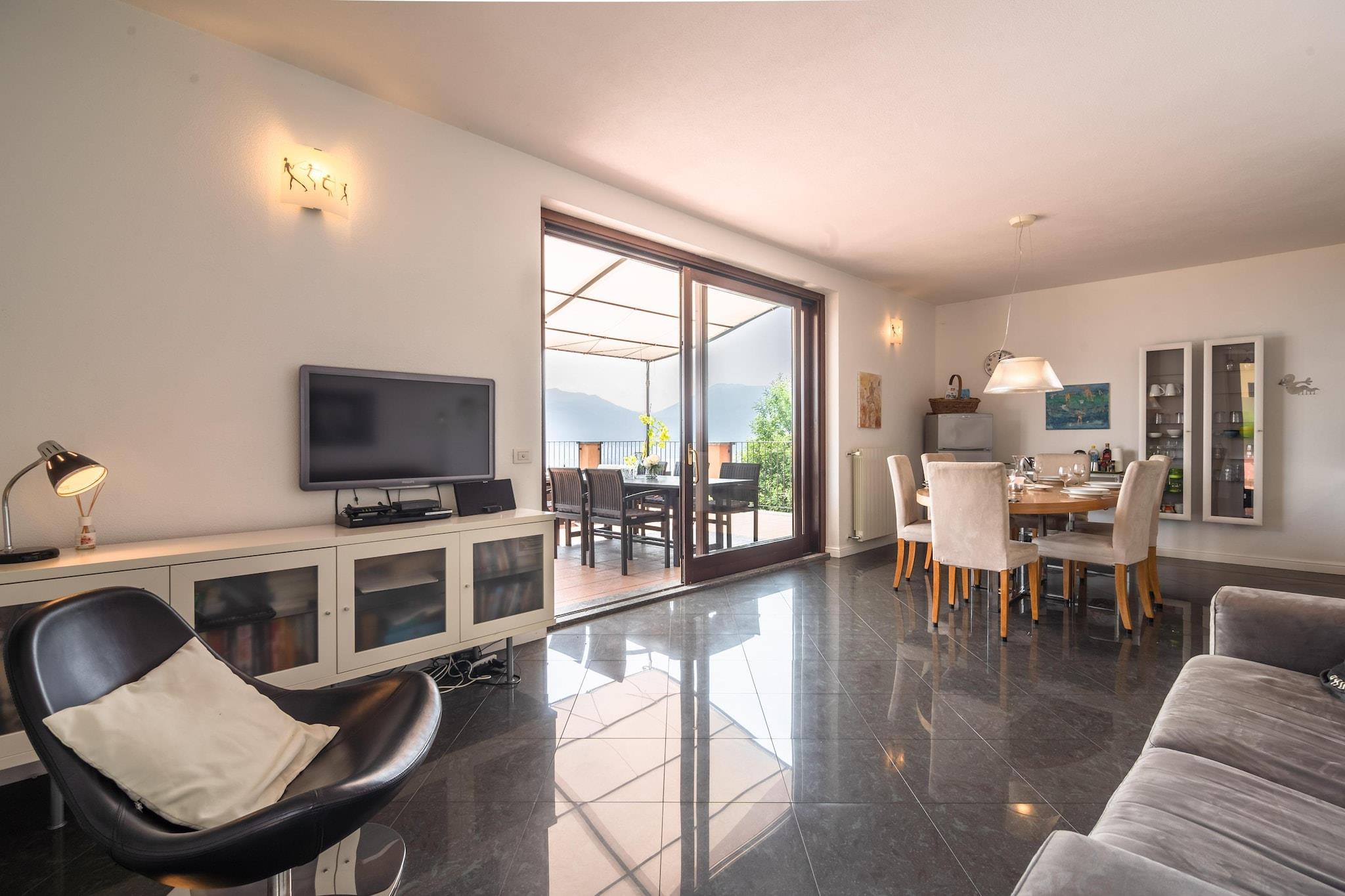 A separate penthouse apartment with a large terrace with stunning panoramic view of Lake Maggiore. Panoramica is located in the pretty little mountain town Oggebbio. The terrace is decorated with wooden garden furniture, 2 sun beds and a large Weber Grill. The terrace is also furnished with a pergola. The apartment includes two bedrooms with double beds, a bathroom, a combined kitchen, dining and living room with sofa bed. The apartment is fully furnished incl. satellite TV, dishwasher and washing machine and designed for 6 people. The apartment is part of a newly built (2005) Residenze complex, called Il Vigneto (vineyard). There are a total of 23 houses built in 5 separate buildings. There are communal pool and children's pool and sun terrace with fantastic view of the lake. Il Vigneto is located in the small town of Oggebbio, ca. 1.5 km drive up the mountain. It is a very quiet and peaceful area. -- The Residence is a panoramic residence upon the green hills overlooking Lake Maggiore. It’s a family friendly place for everybody who loves relaxing in the surroundings of nature with an exceptional view on the lake. A nice swimming pool and solarium are available to the guests and children. The panoramic apartment has two very spacious terrace with stunning lake view, outdoor table, deck chairs. This hillside residence is constructed on a number of levels with a glass elevator offering great views over the lake while you are carried to and from your floor. However, the elevator has been known to occasionally malfunction so be prepared to walk up a few stairs in the event of this happening! For this reason, we recommend that the residence is not suited for people with walking difficulties. The residence is situated nearby the small village of Oggebbio and the charming town Cannero Riviera with many shops, bars and restaurants. From here you can hop on a boat and explore the beautiful lake, its beaches, islands and surroundings in Italy and Switzerland. Many watersport acitivities are offered nearby as well as great opportunities for mountain biking or trekking in the nearby mountain valleys Note: The residence is situated on a hill accessible by a narrow and winding road. Please note that it’s not so easy reachable driving up there the first few times, the resultant magnificent view over Lake Maggiore more than makes up for the high climb. It’s located almost 2 km from the lake and from the nearest facilities (supermarket, restaurants,…) so a car is necessary.