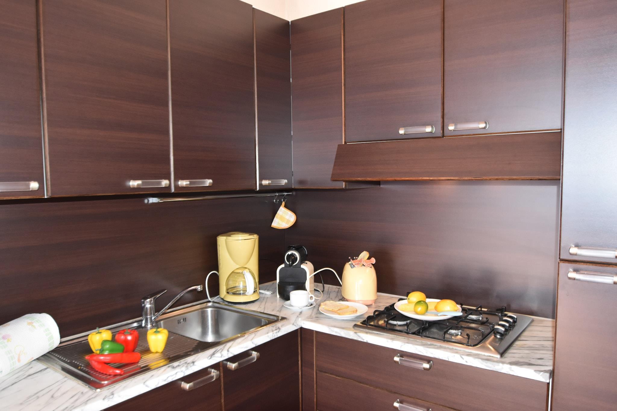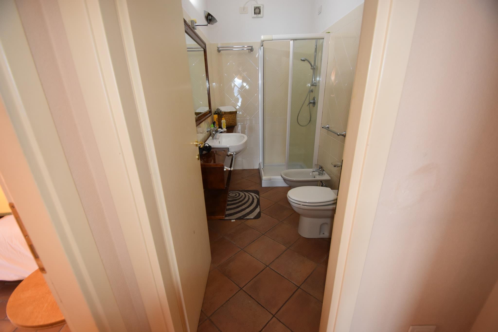 På 1. etage: (åbent køkken(kaffemaskine, ovn, mikrobølgeovn, køleskab, håndvask), stue / spisestue(dobbeltsovesofa, Fjernsyn, spisebord), soveværelse(dobbeltseng), badeværelse(bruser, håndvask, toilet, bidet)) varme(central), have(privat), havemøbler, parkering, swimmingpool(deles med andre gæster, 10 x 5 m., opened from 1/2 Jun upto and including Sep)